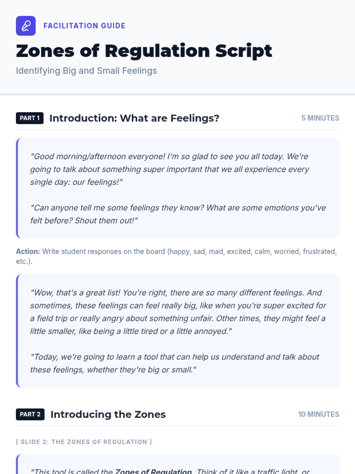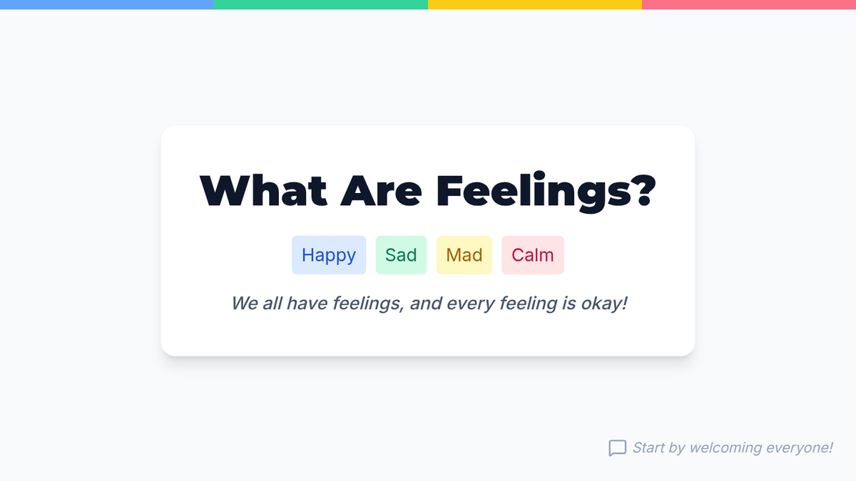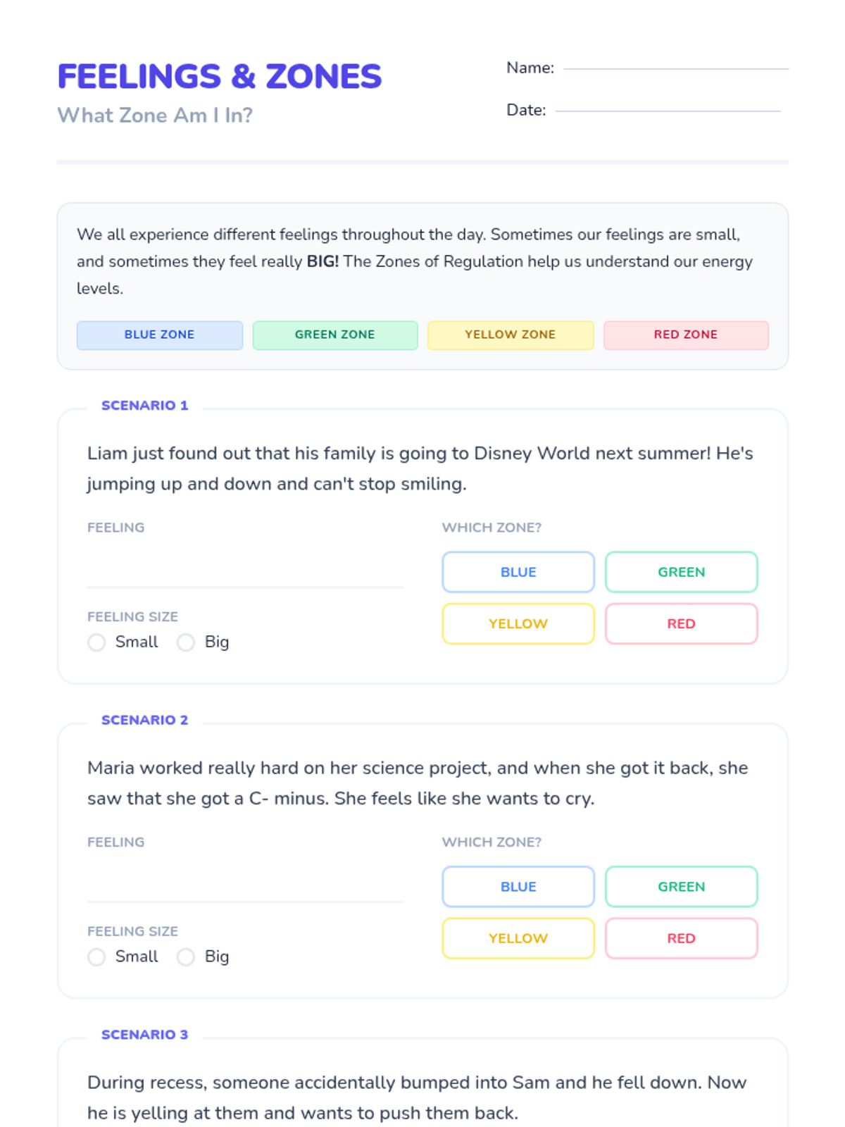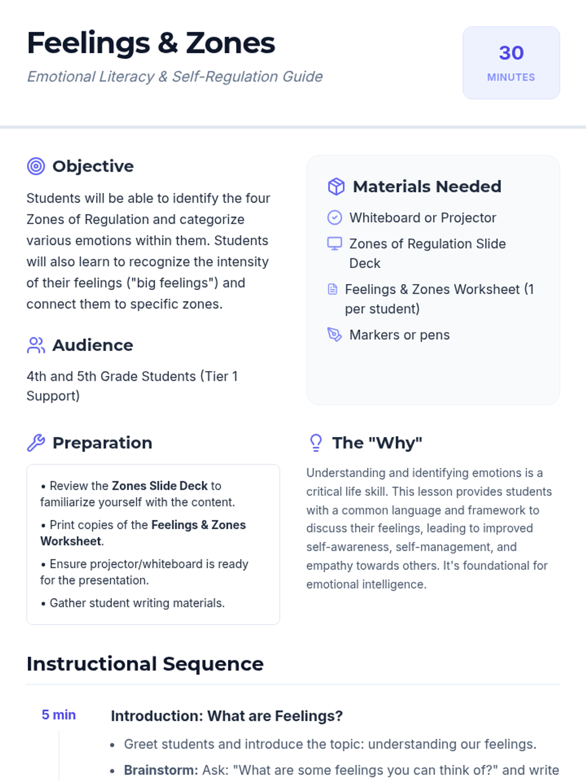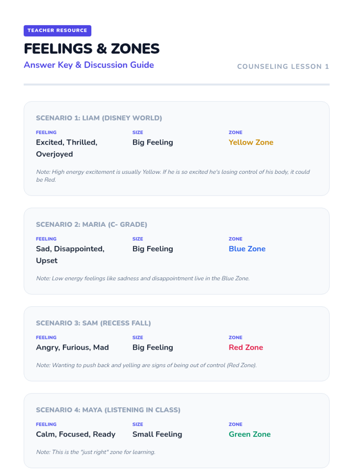 A 30-minute counseling session for 4th and 5th graders to introduce the Zones of Regulation framework and help students identify and understand their 'big feelings.' Students will learn to categorize emotions into four color-coded zones to improve emotional literacy and self-regulation.