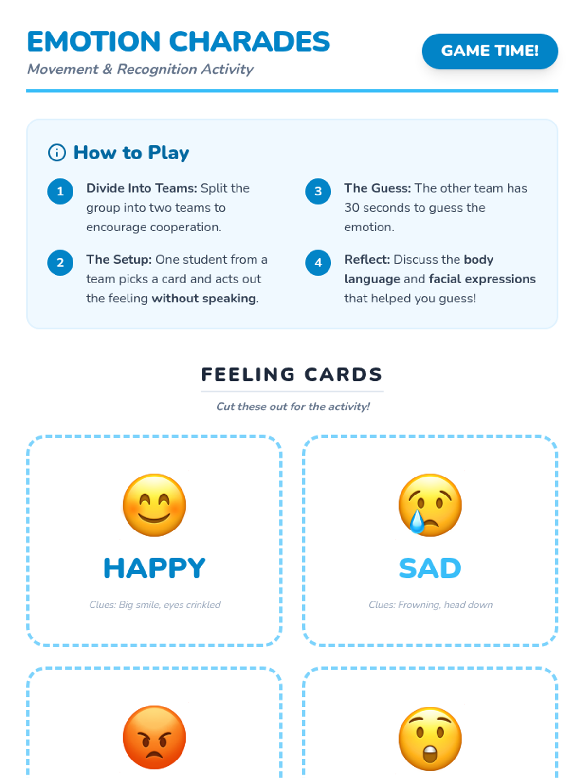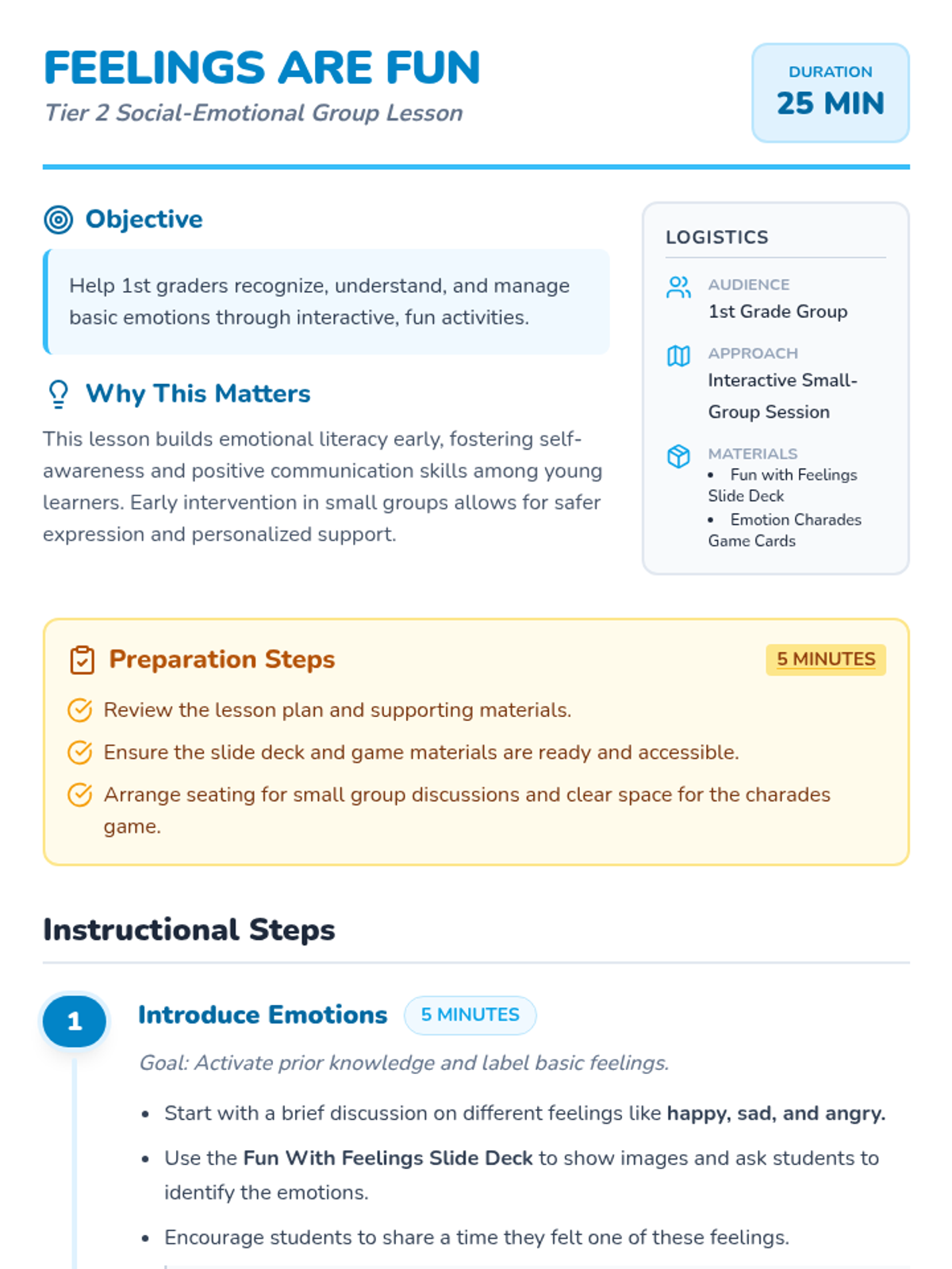 A small-group social-emotional learning lesson for 1st graders focused on recognizing, understanding, and managing basic emotions through interactive discussion and game-based play.