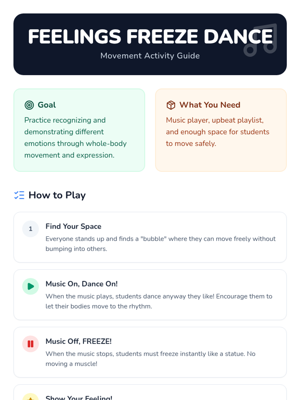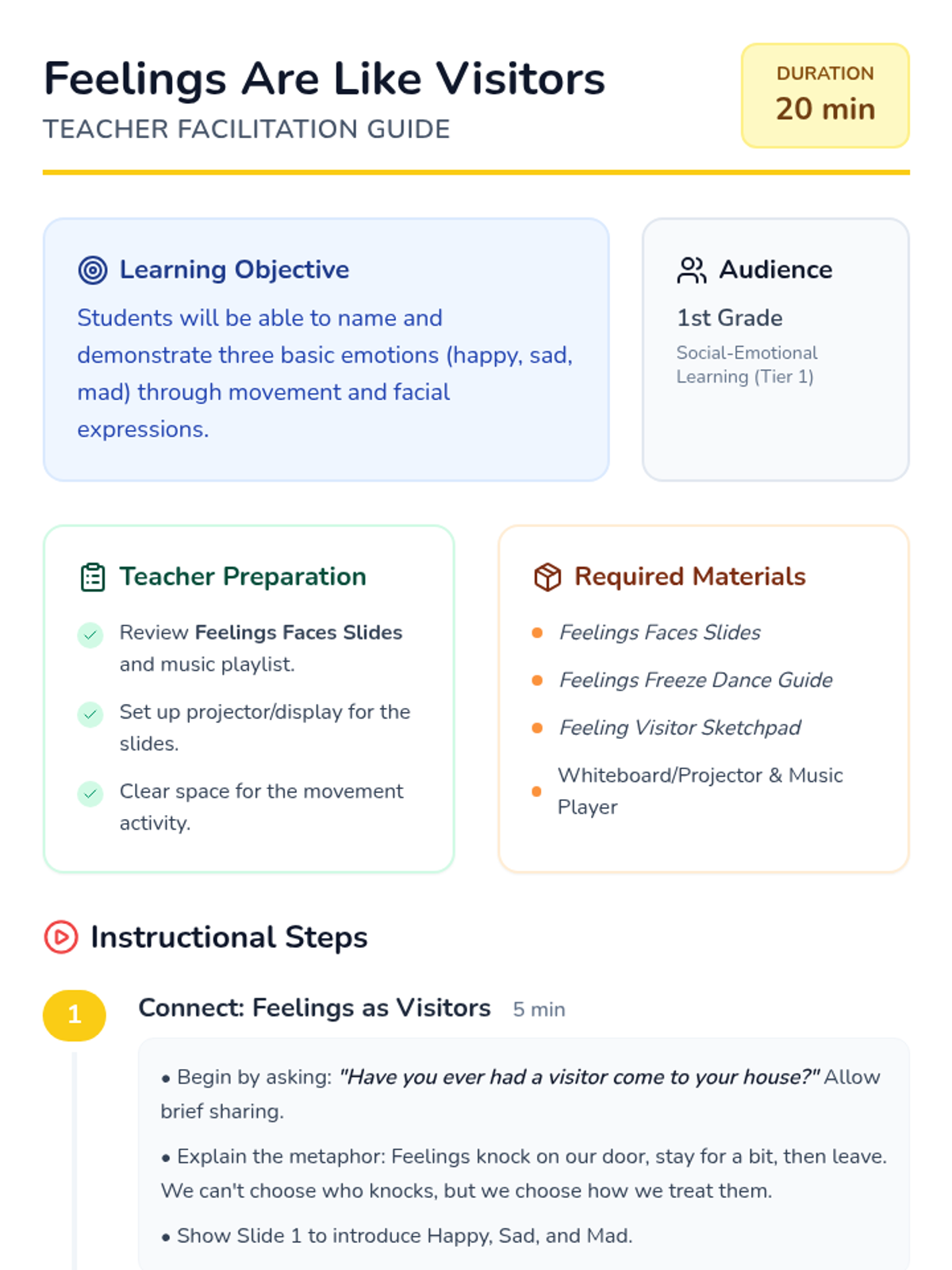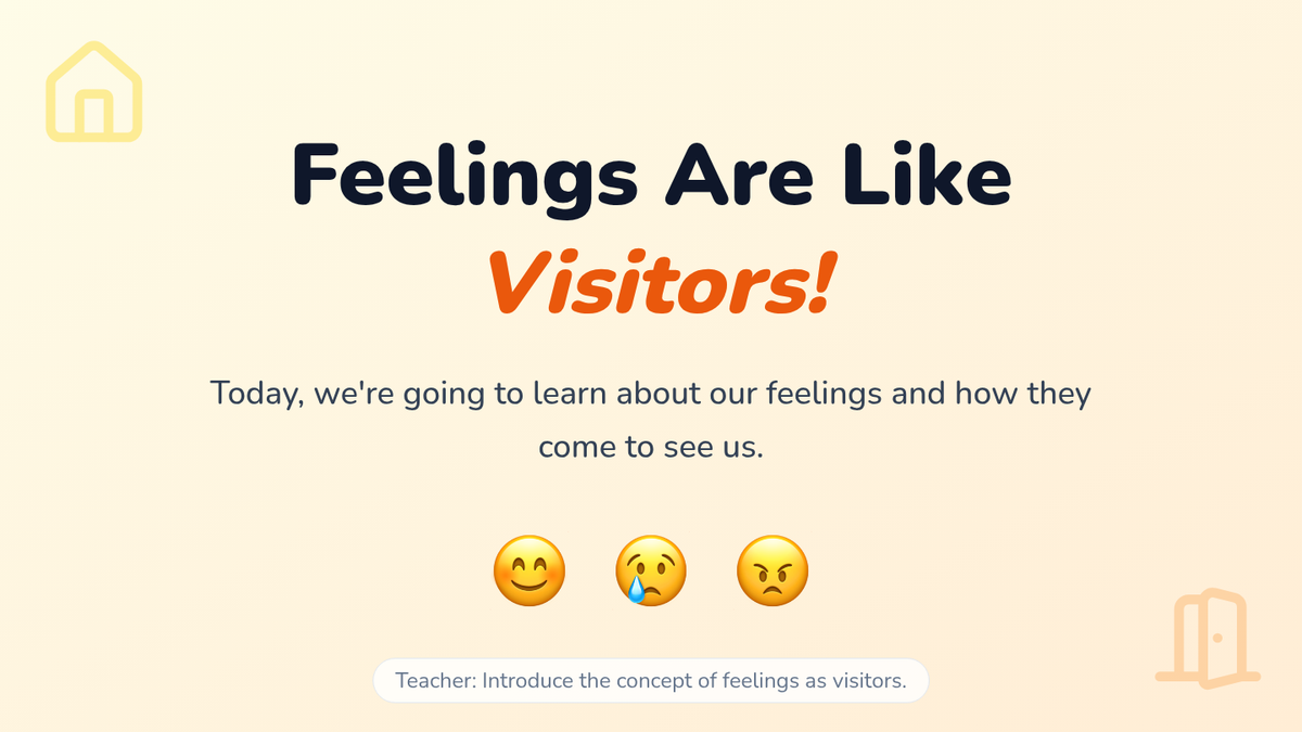 A 20-minute lesson for 1st-grade students to understand and express basic emotions (happy, sad, mad) by comparing them to visitors. Students learn that all feelings are temporary and it's healthy to recognize and show them.