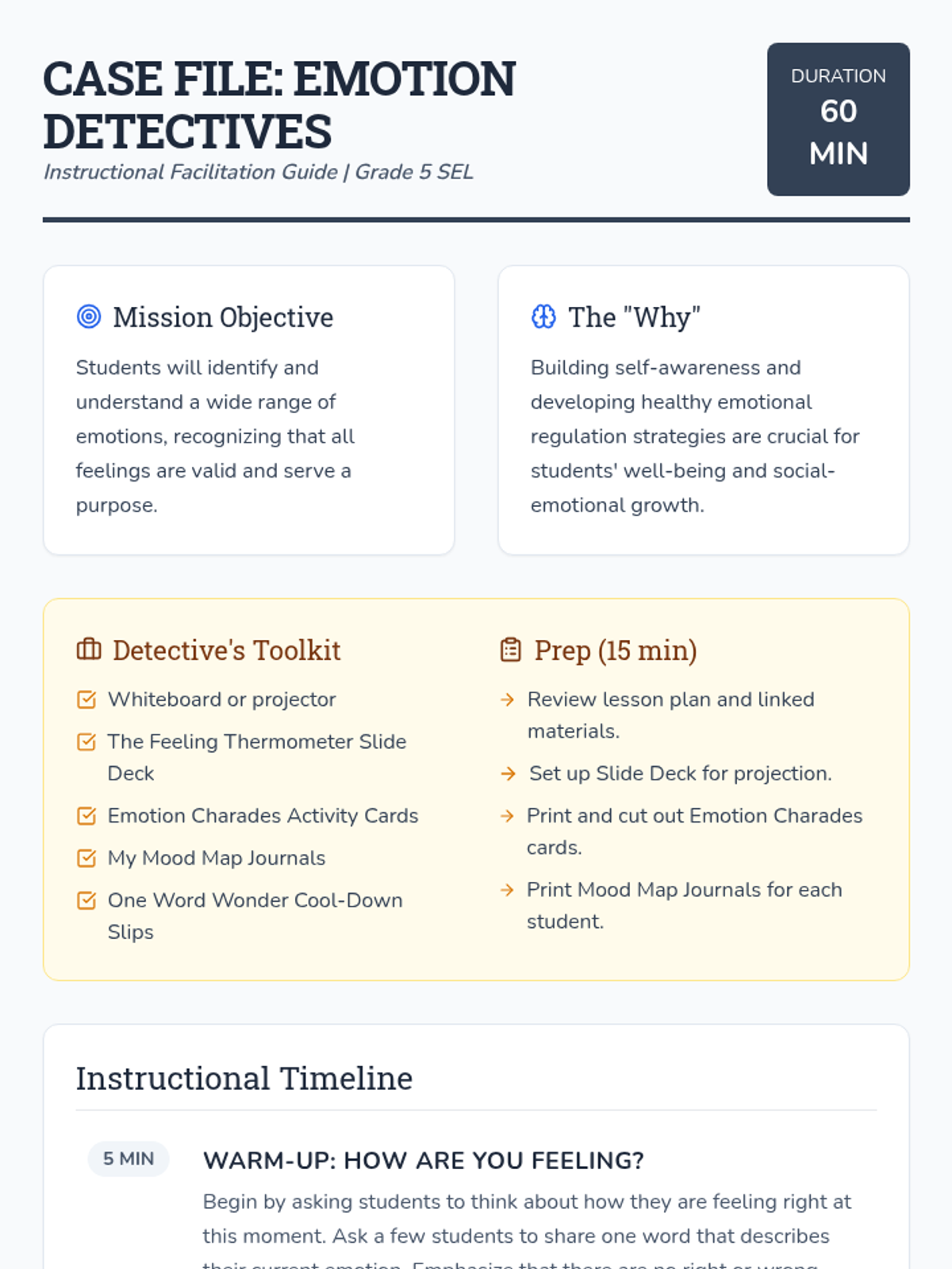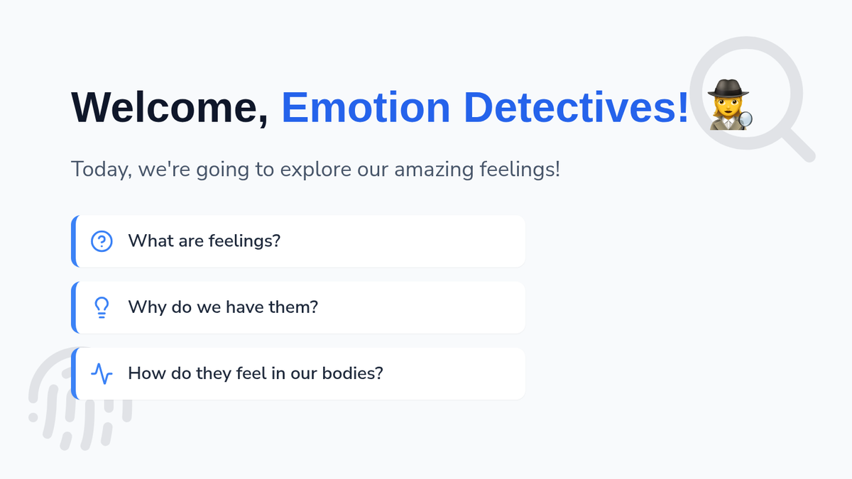 A 60-minute SEL lesson for 5th graders to explore the intensity and validity of emotions through a 'detective' lens, featuring interactive activities and personal reflection.