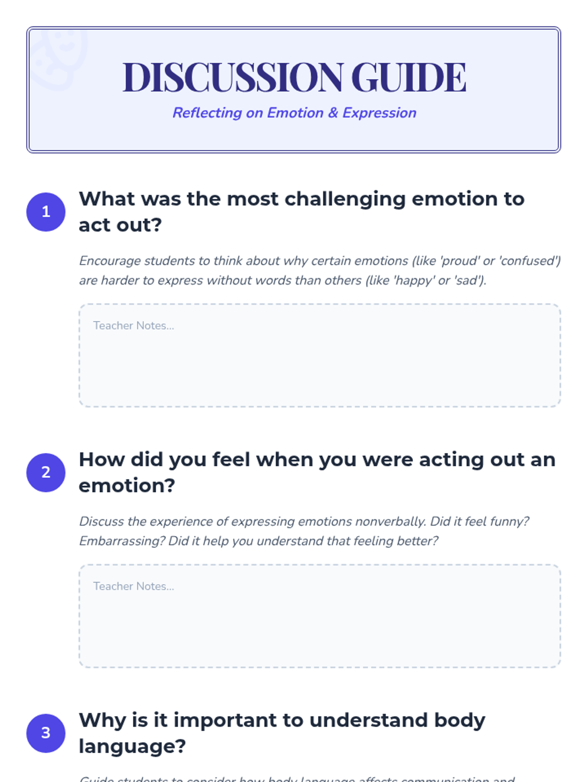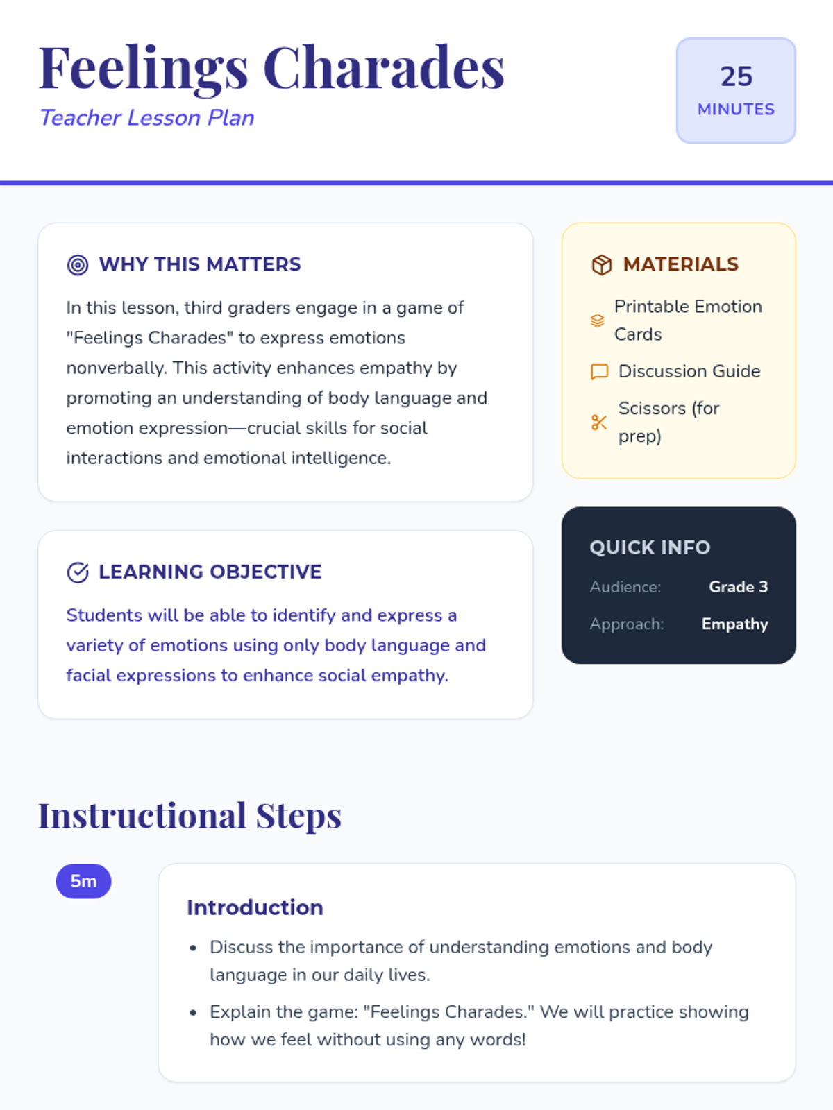 A fun, interactive lesson where third graders practice nonverbal communication and empathy by acting out and identifying various emotions.