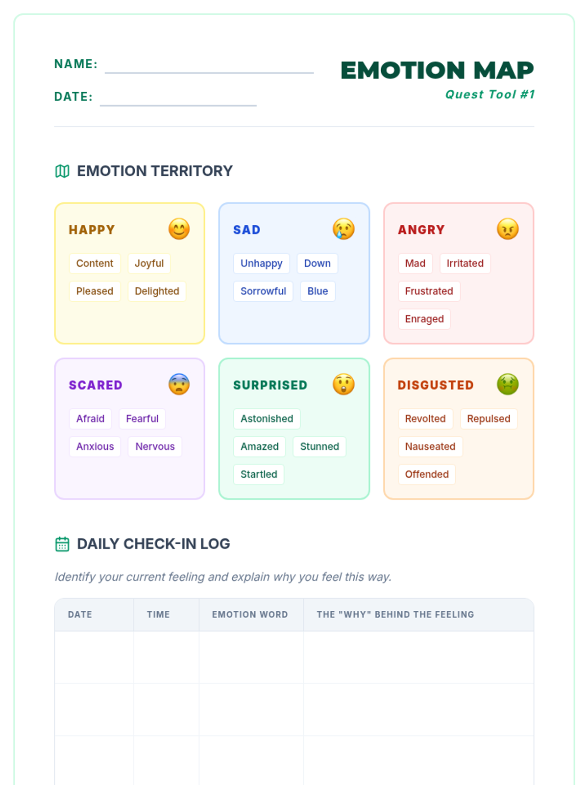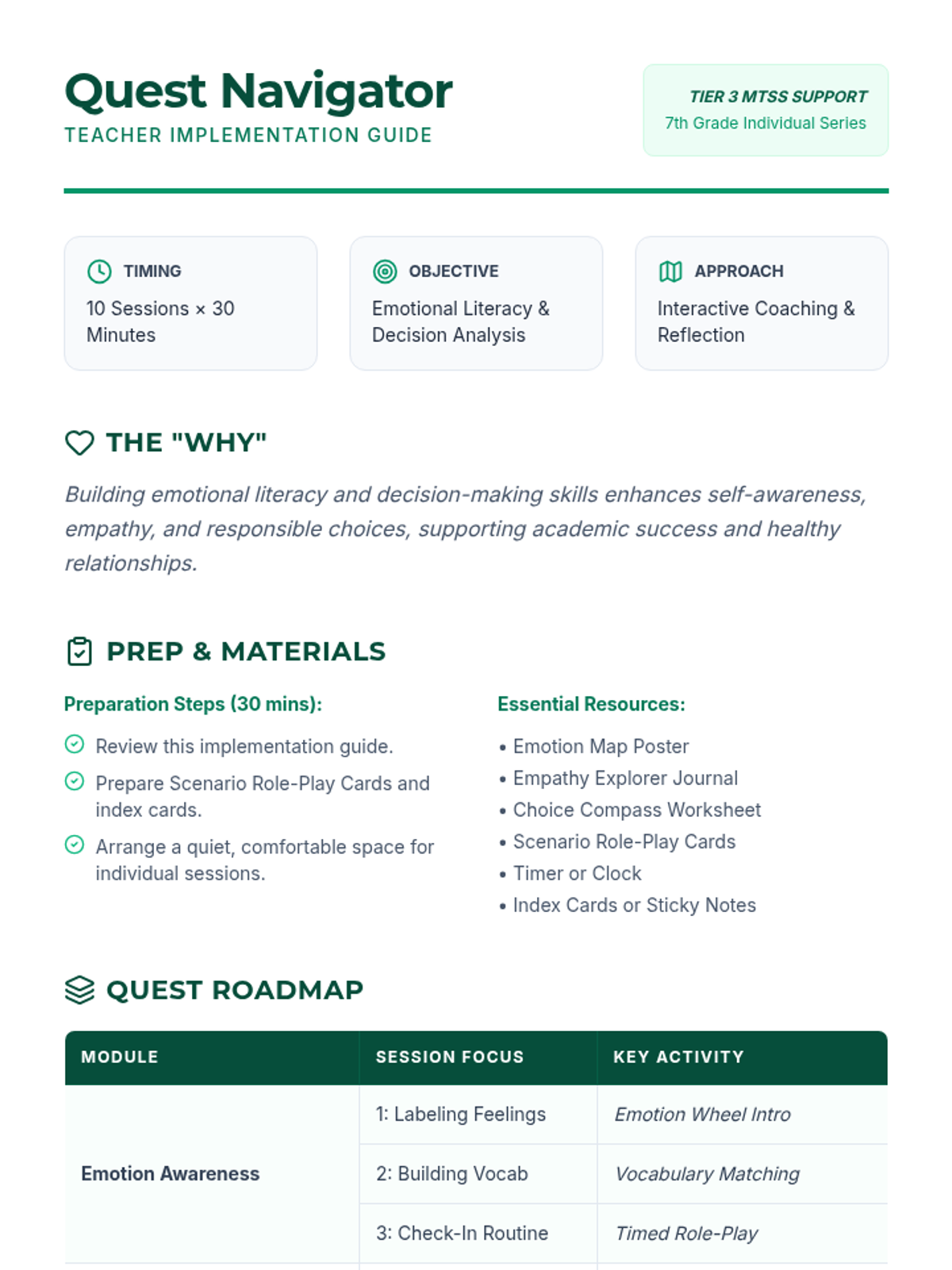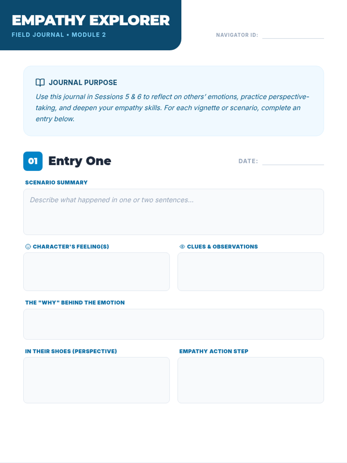 A 10-session individual support series for 7th grade students to develop emotional literacy, empathy, and decision-making skills through hands-on activities and reflection.