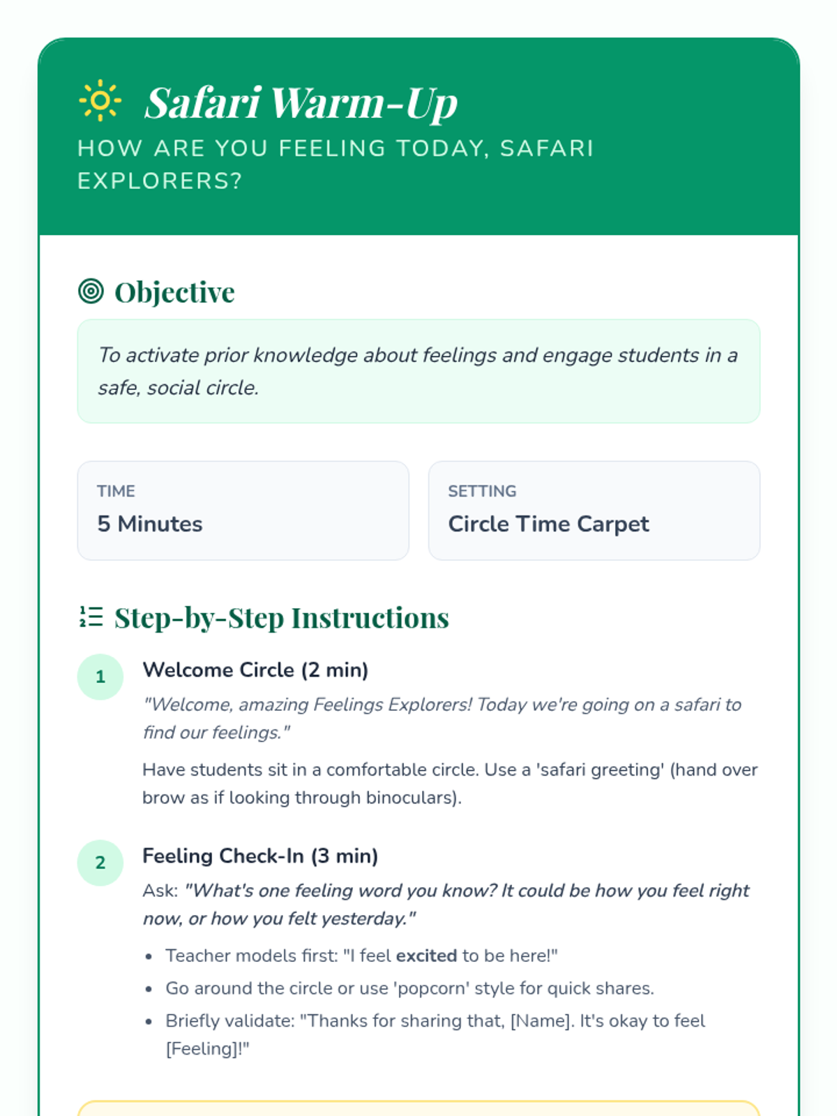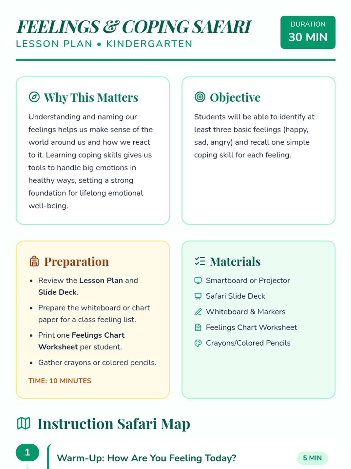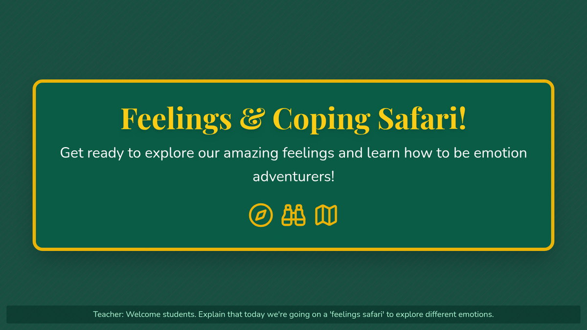 A 30-minute social-emotional learning lesson for Kindergarteners to identify basic emotions (happy, sad, angry) and learn simple coping strategies through a fun safari-themed adventure.