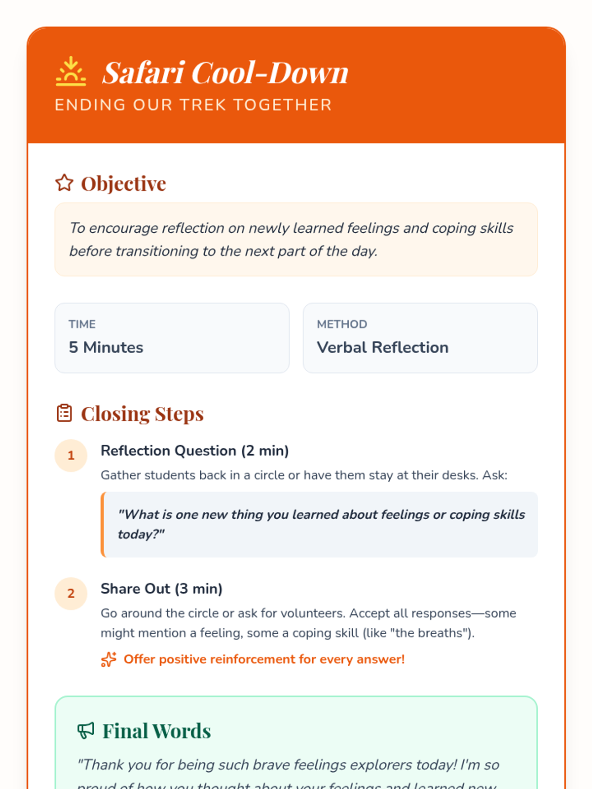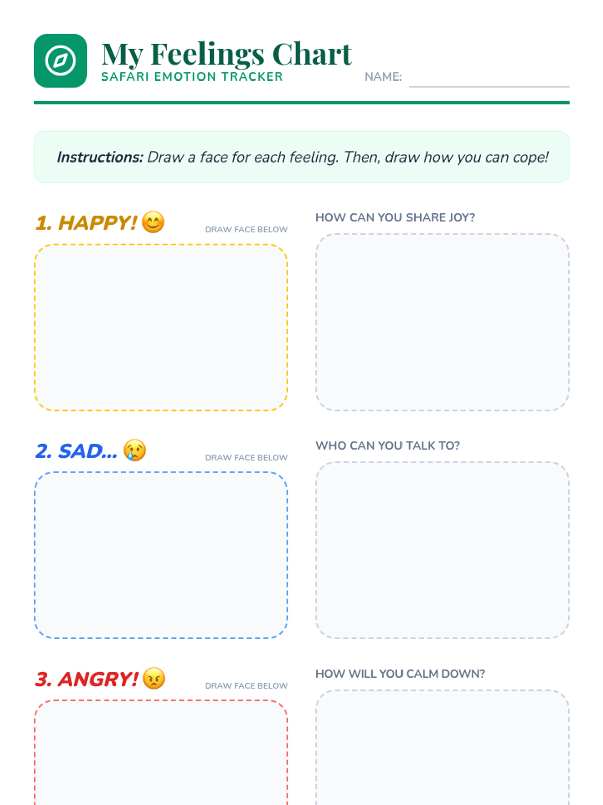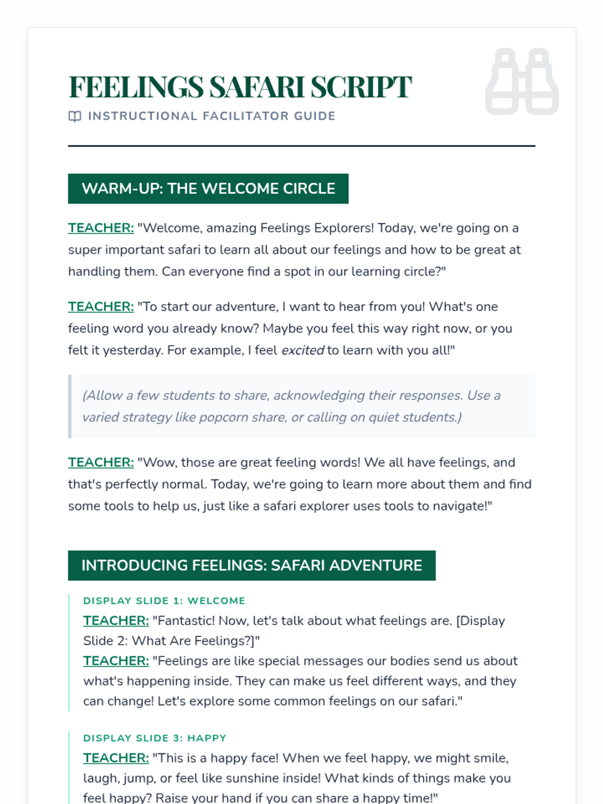 A 30-minute social-emotional learning lesson for Kindergarteners to identify basic emotions (happy, sad, angry) and learn simple coping strategies through a fun safari-themed adventure.