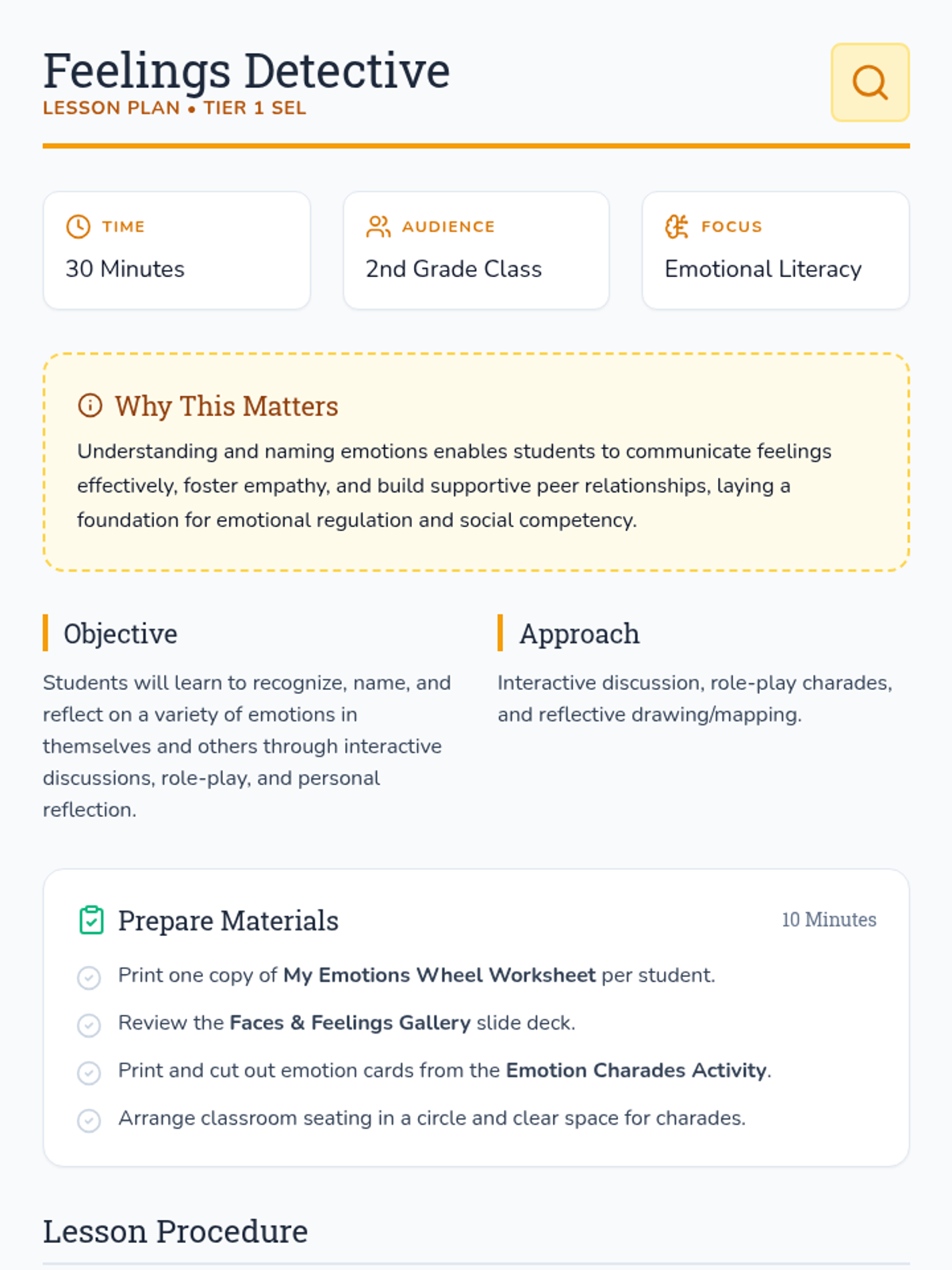 In this 30-minute lesson for 2nd graders, students become 'feelings detectives' as they identify and name a spectrum of emotions in themselves and others, building self-awareness and social awareness. This Tier 1 CASEL-focused lesson establishes foundational emotional literacy skills to foster empathy, communication, and a supportive classroom community.