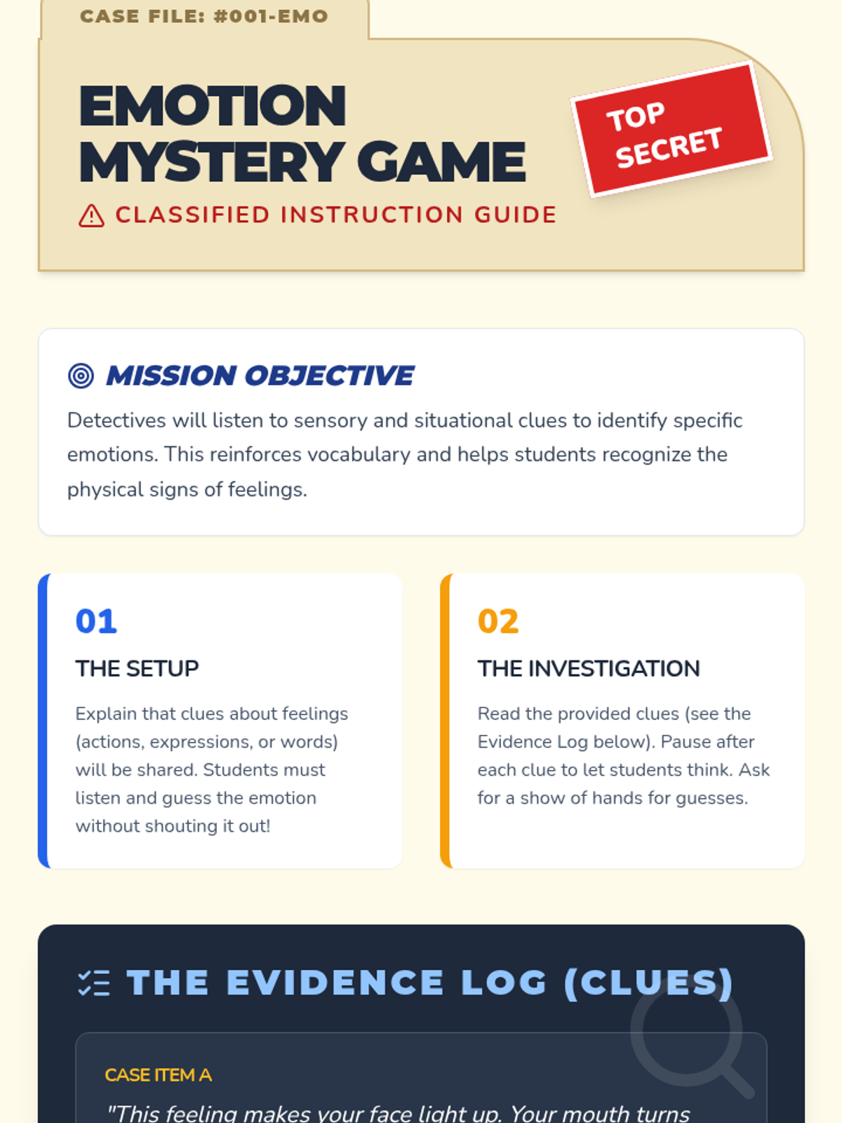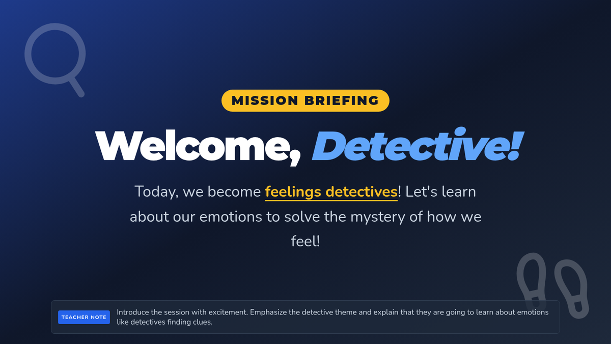 An interactive 1st-grade lesson where students become 'feelings detectives' to identify emotions and develop empathy, specifically focusing on the experience of missing friends.