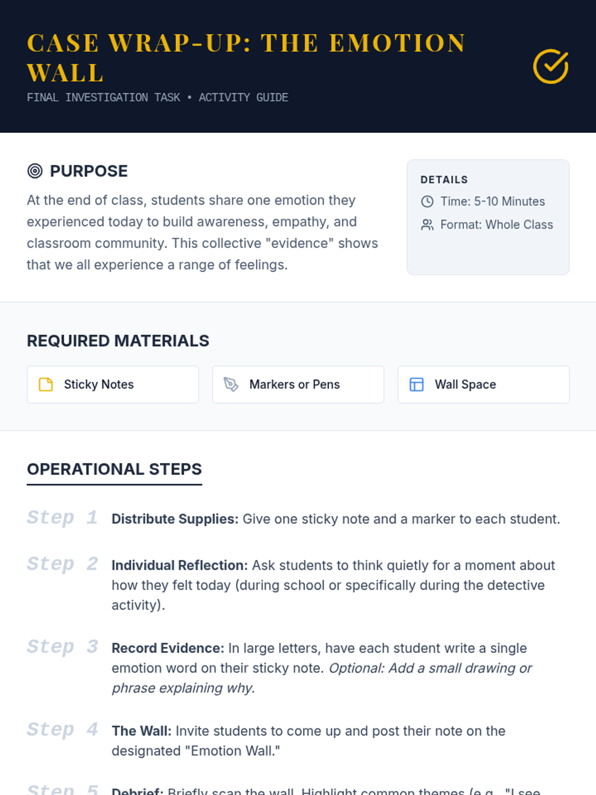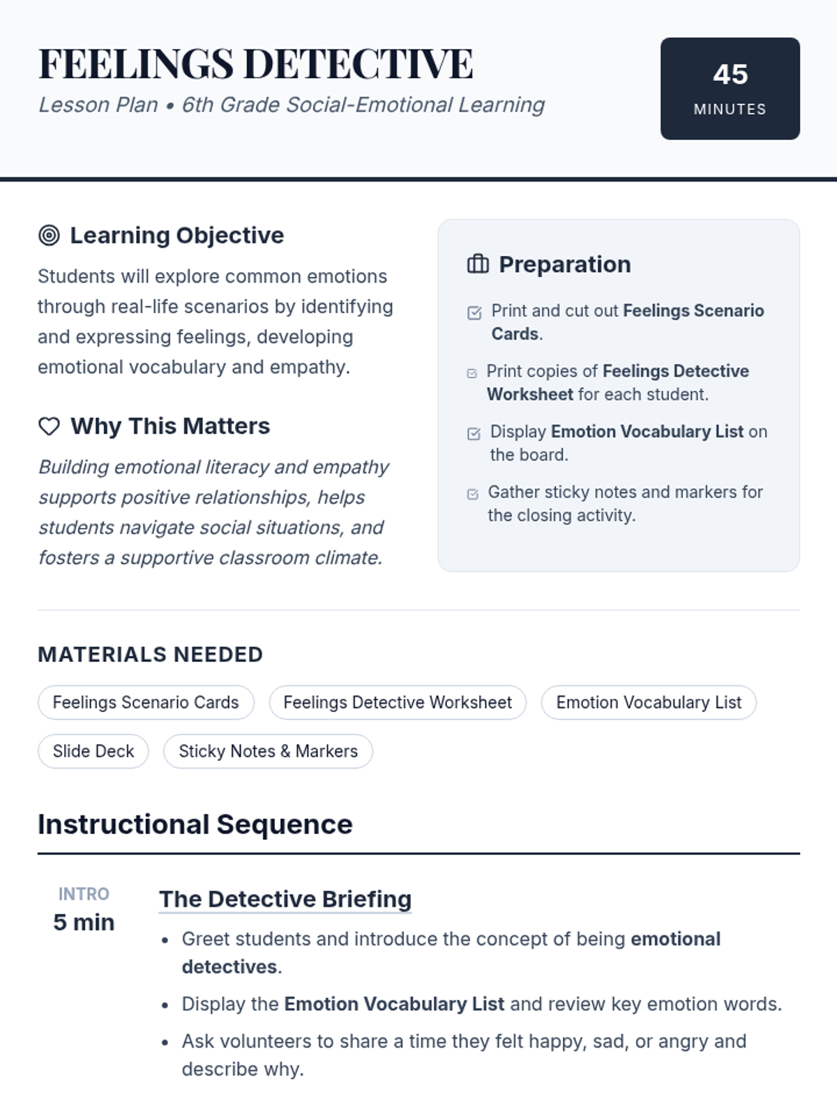 In this 45-minute, 6th-grade Tier 1 lesson, students will explore common emotions through real-life scenarios and develop empathy by identifying and expressing feelings. This lesson builds emotional vocabulary and social skills, supporting a positive classroom climate.