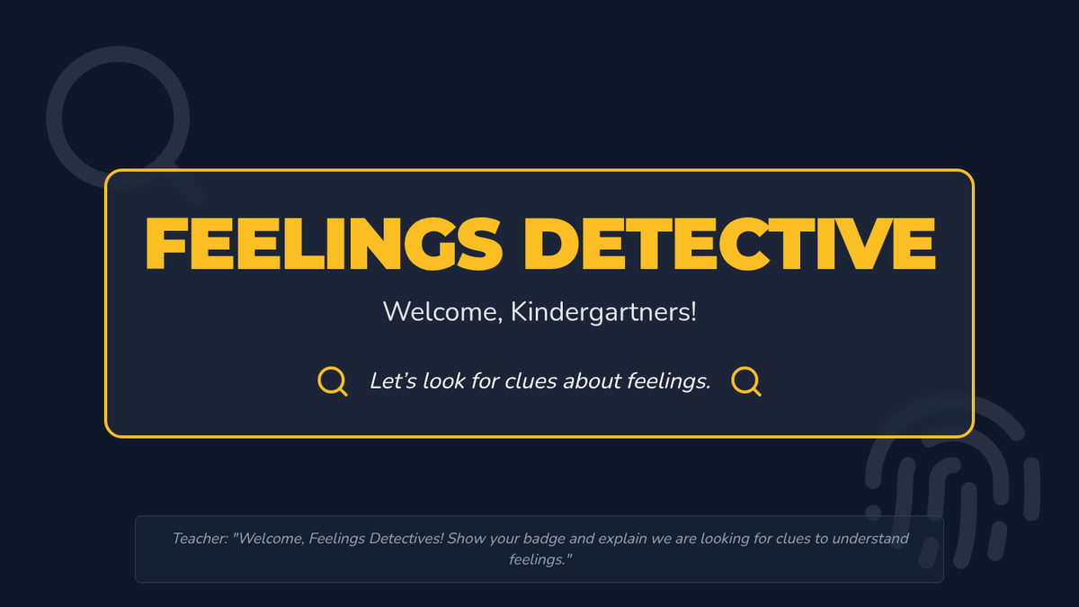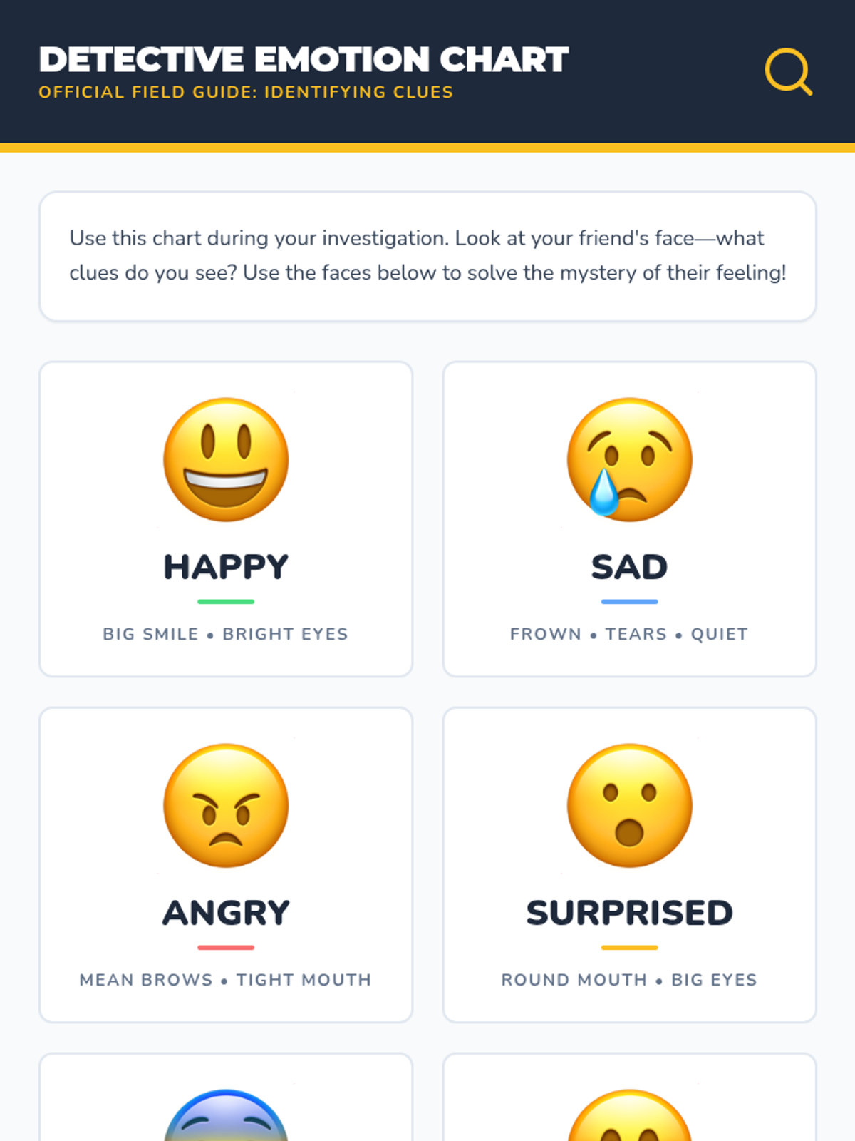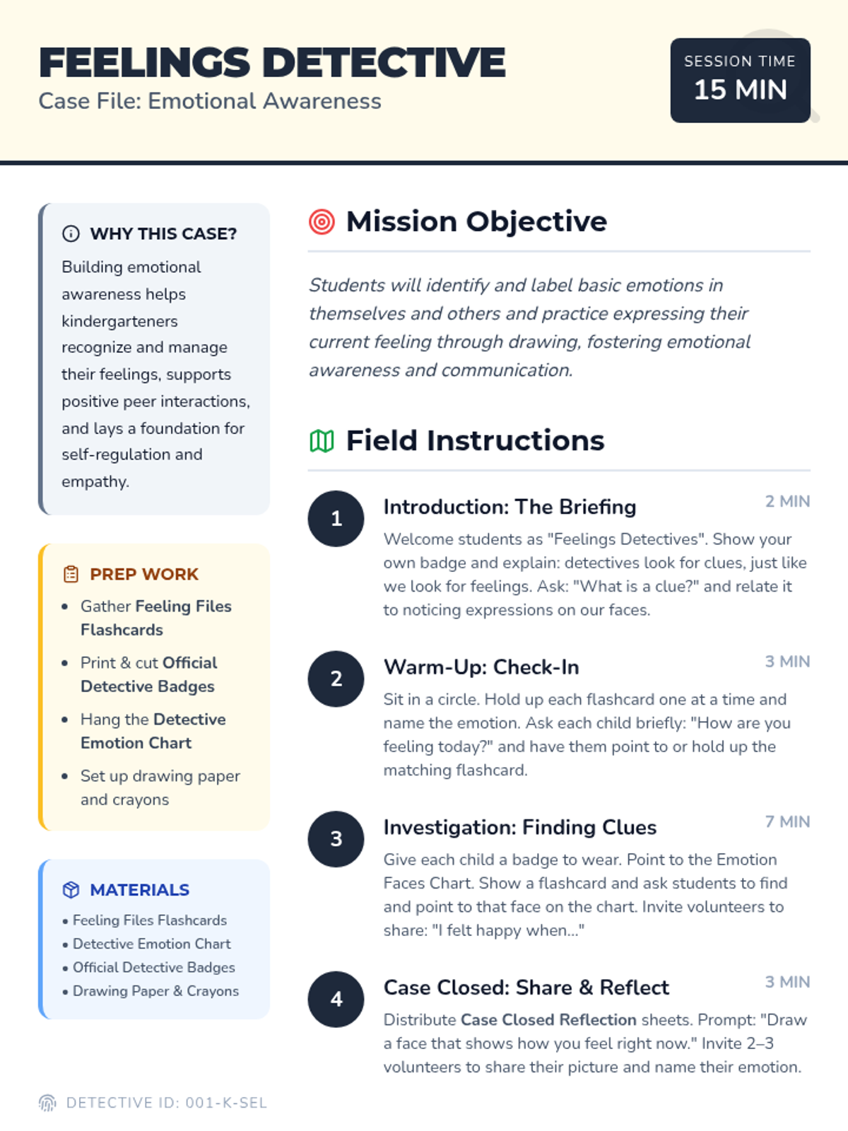 A 15-minute SEL lesson for kindergarteners to identify emotions by spotting 'clues' in facial expressions, fostering empathy and self-awareness through detective role-play.