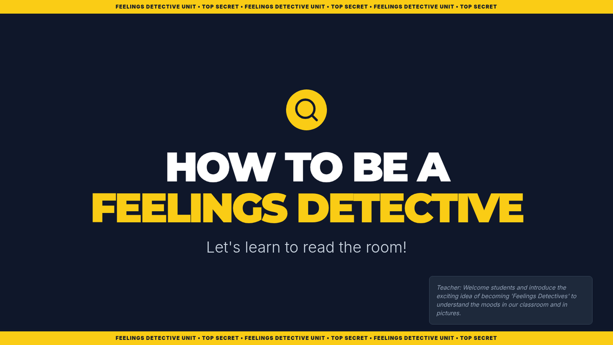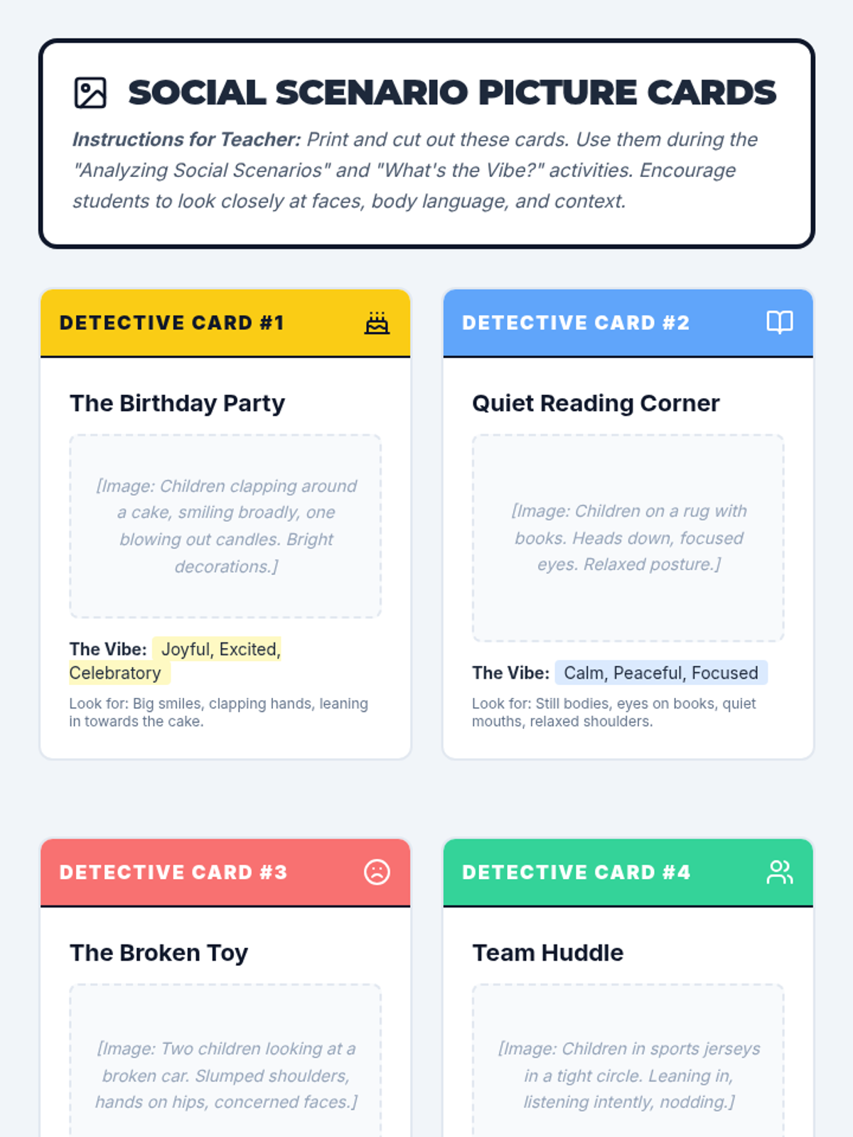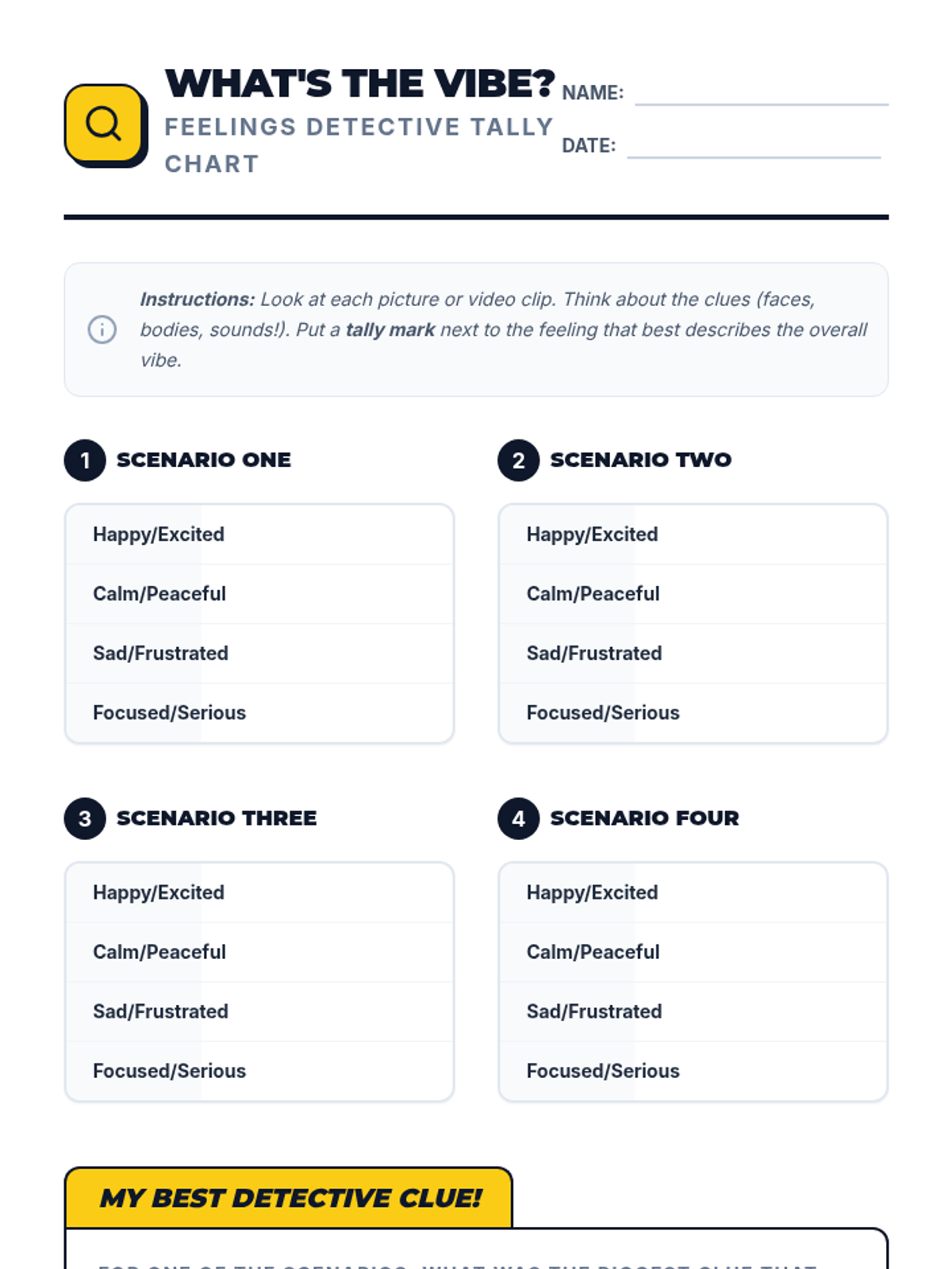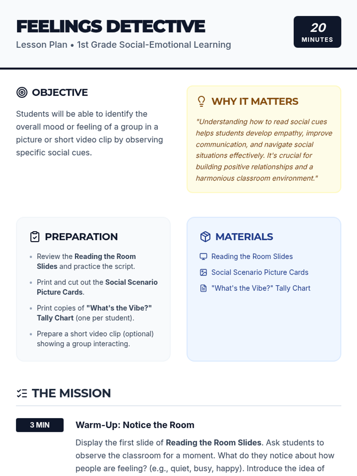 A 20-minute lesson for 1st graders to learn how to observe social cues like body language and facial expressions to understand a group's mood. Students practice empathy by becoming 'Feelings Detectives' using picture cards and tally charts.