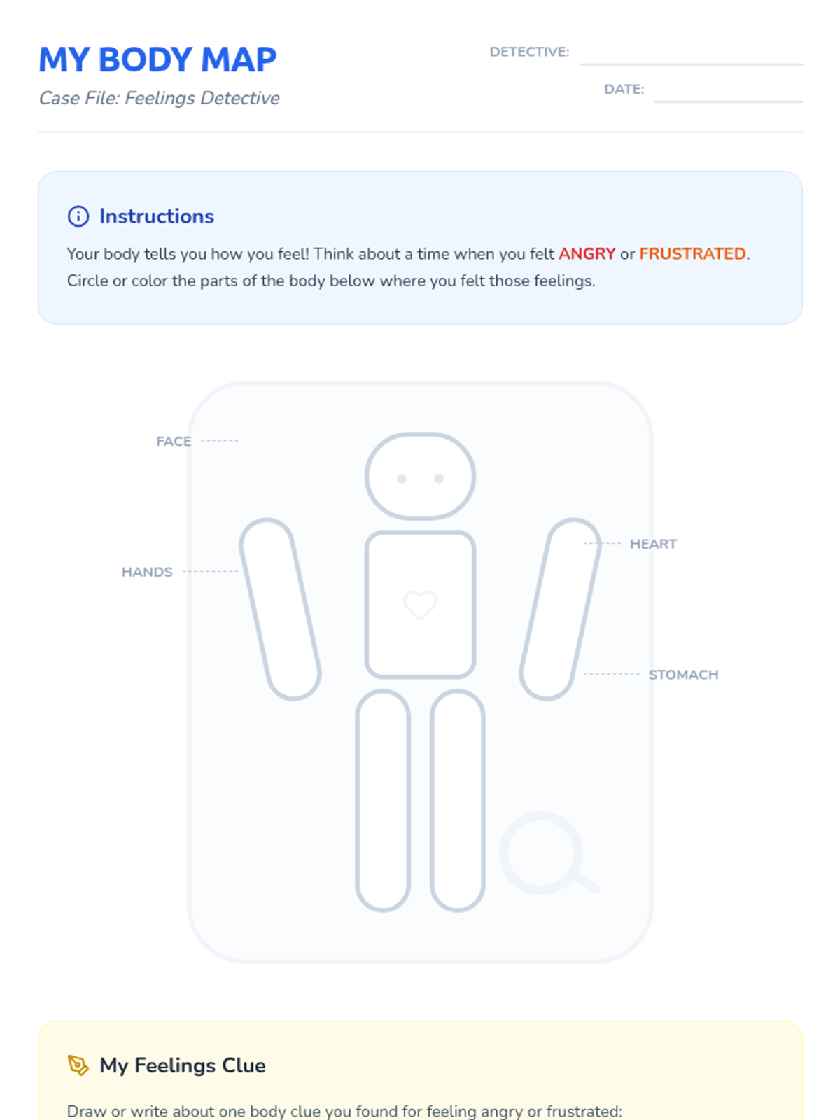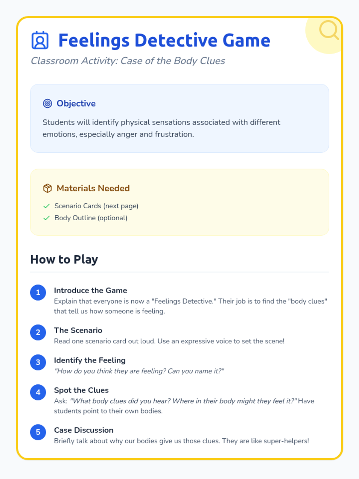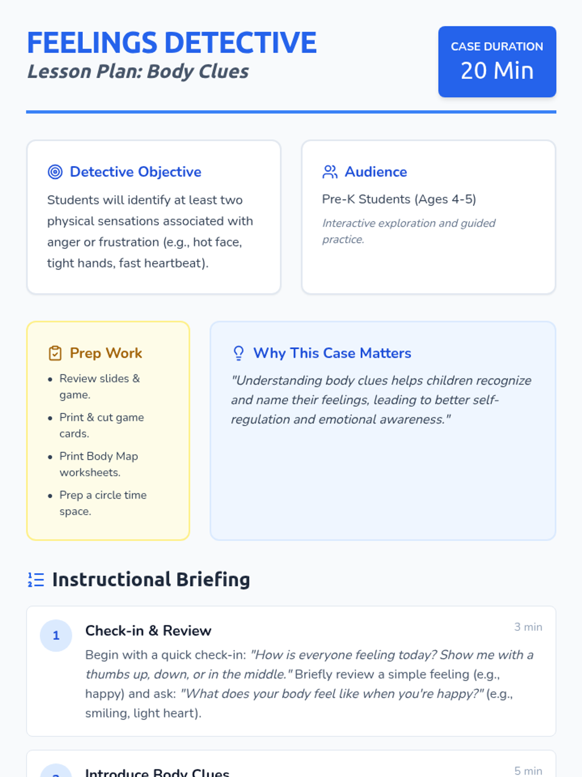 A Pre-K lesson focused on identifying physical sensations associated with emotions, specifically anger and frustration, using a 'Feelings Detective' theme.