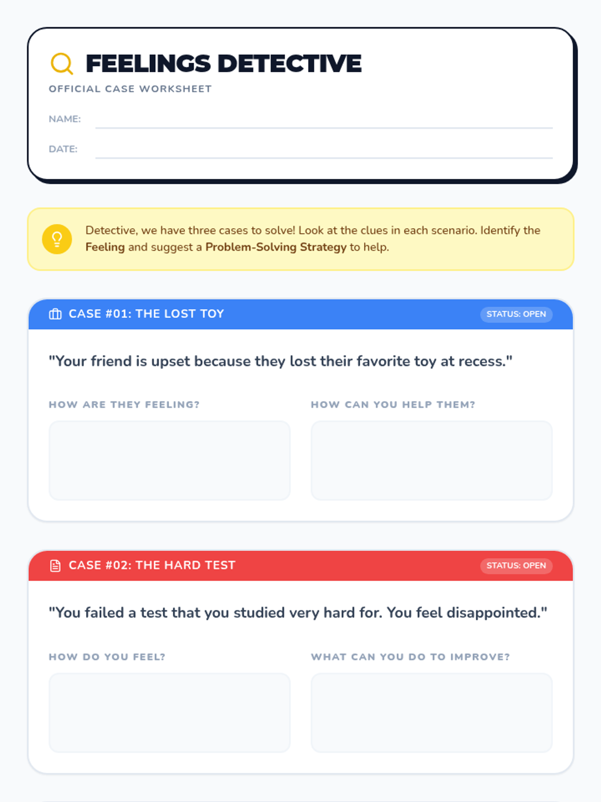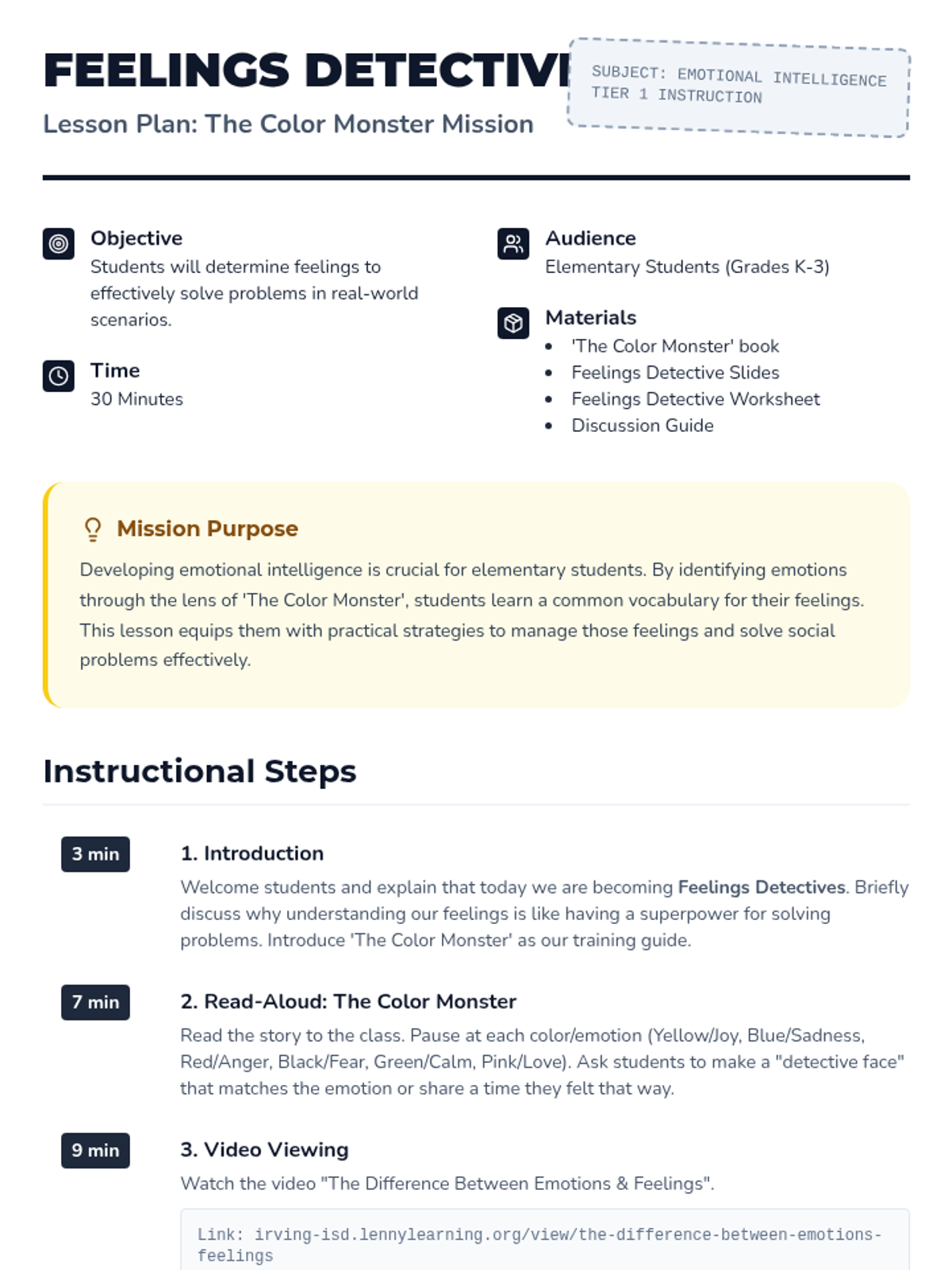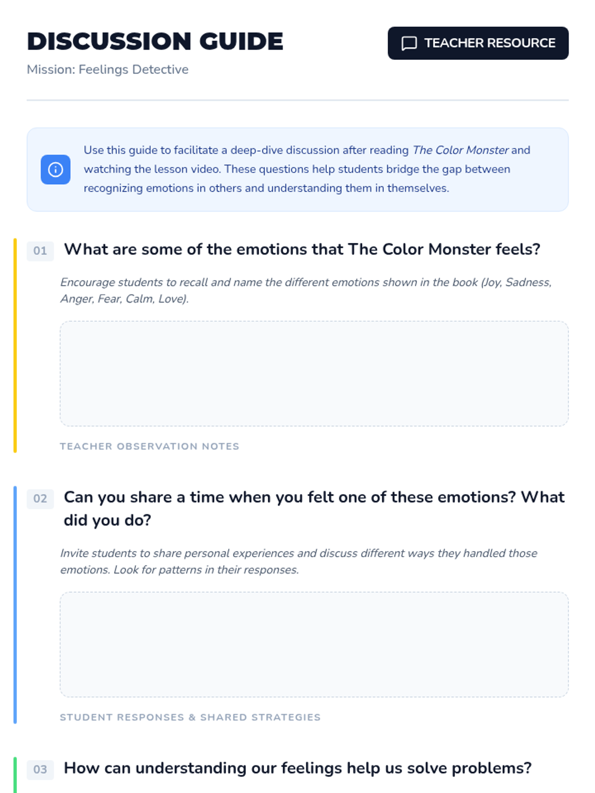 Students learn to identify and understand emotions using 'The Color Monster' book and a video, participating in a 'Feelings Detective' activity to apply their knowledge to real-world scenarios.
