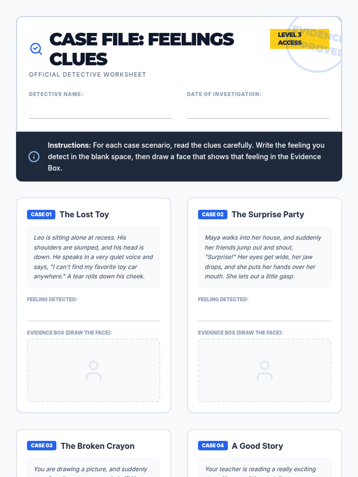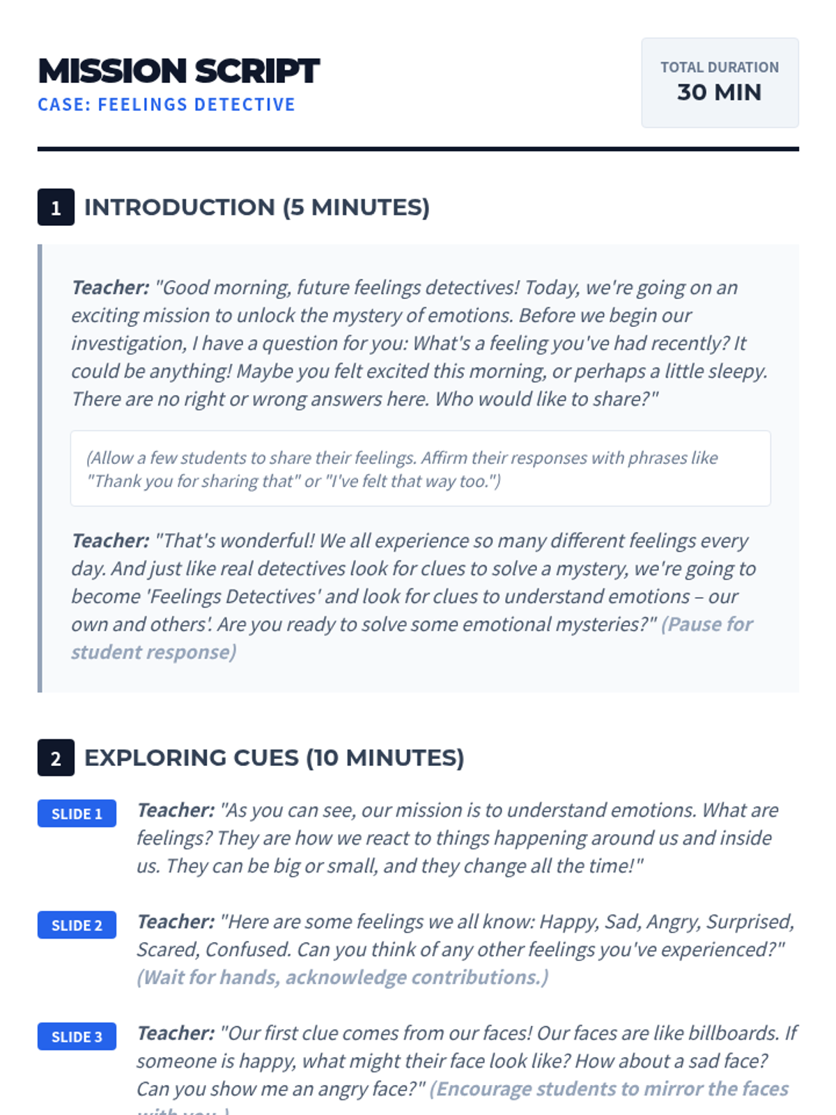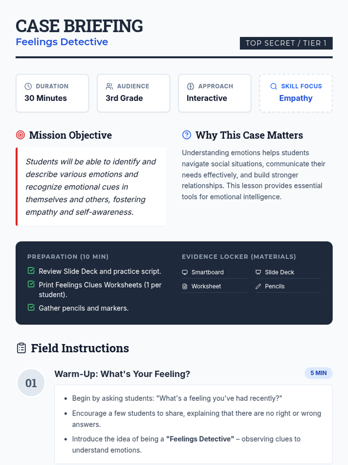 A 30-minute interactive lesson for 3rd-grade students to identify and understand emotional cues using a 'detective' theme. Students learn to recognize facial expressions, body language, and tone of voice to build empathy and self-awareness.