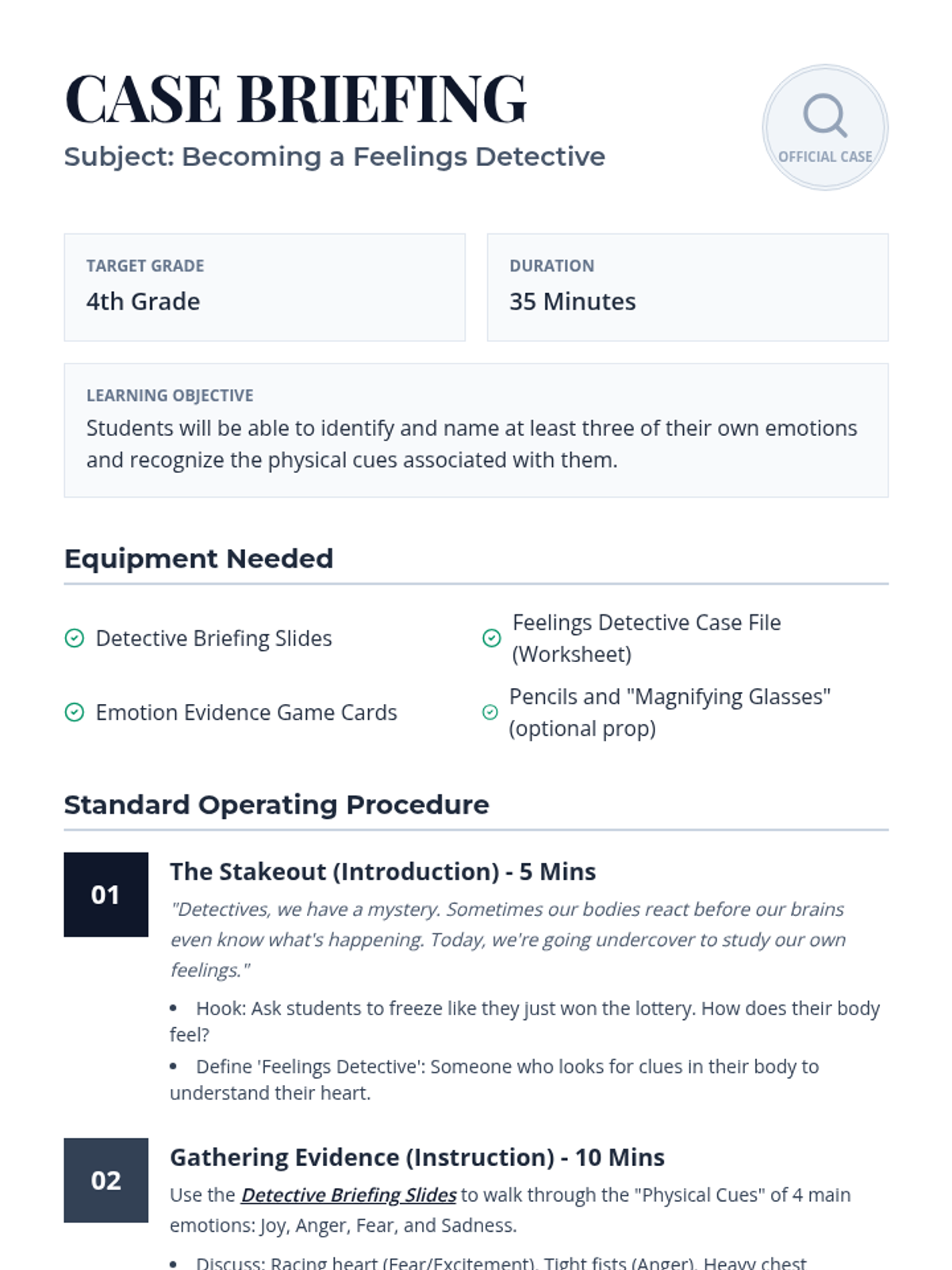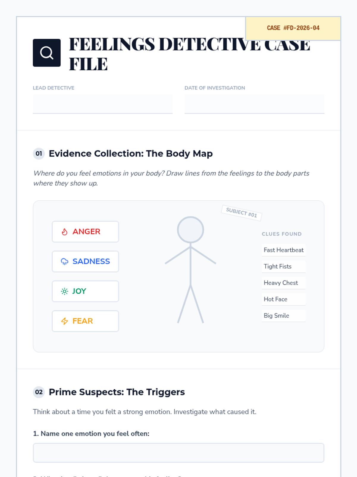 Students become 'Feelings Detectives' to uncover how emotions feel in their bodies and what triggers them, building essential self-awareness skills.