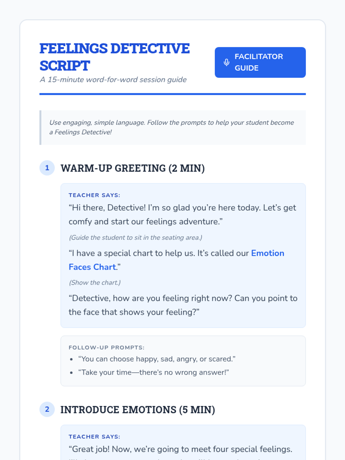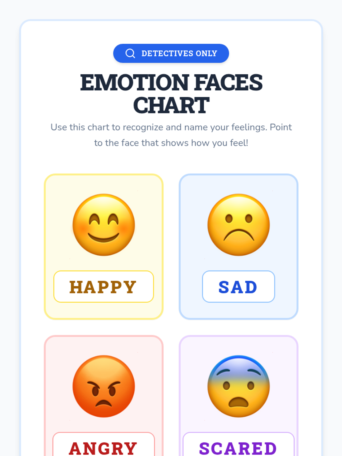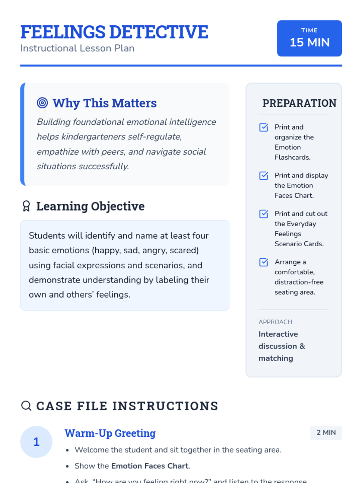 A 15-minute one-on-one session for kindergarteners to identify and name basic emotions (happy, sad, angry, scared) using facial expressions and scenarios.