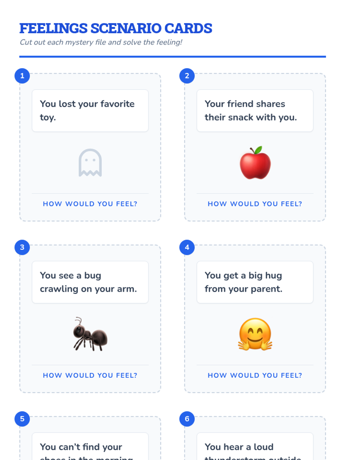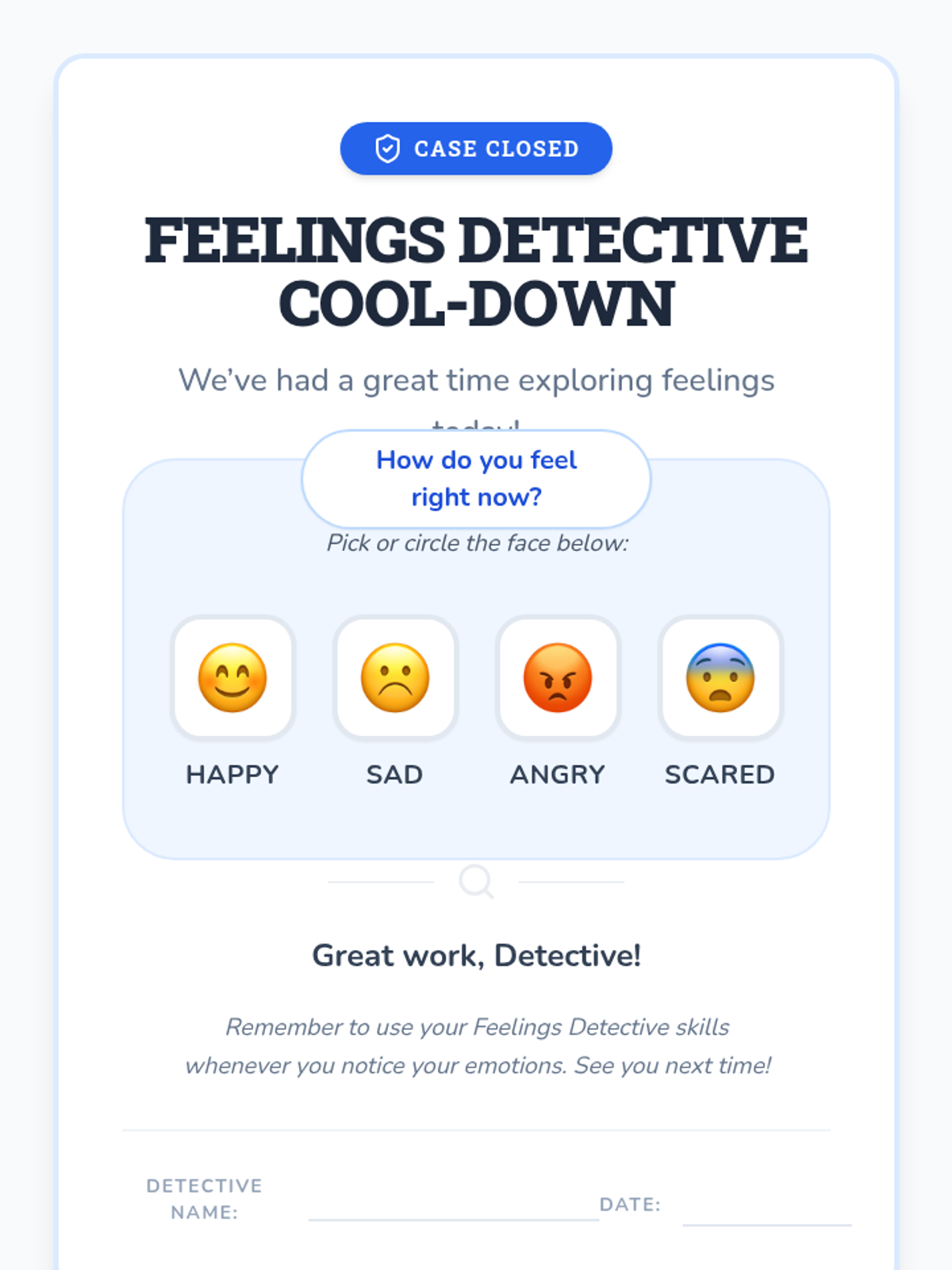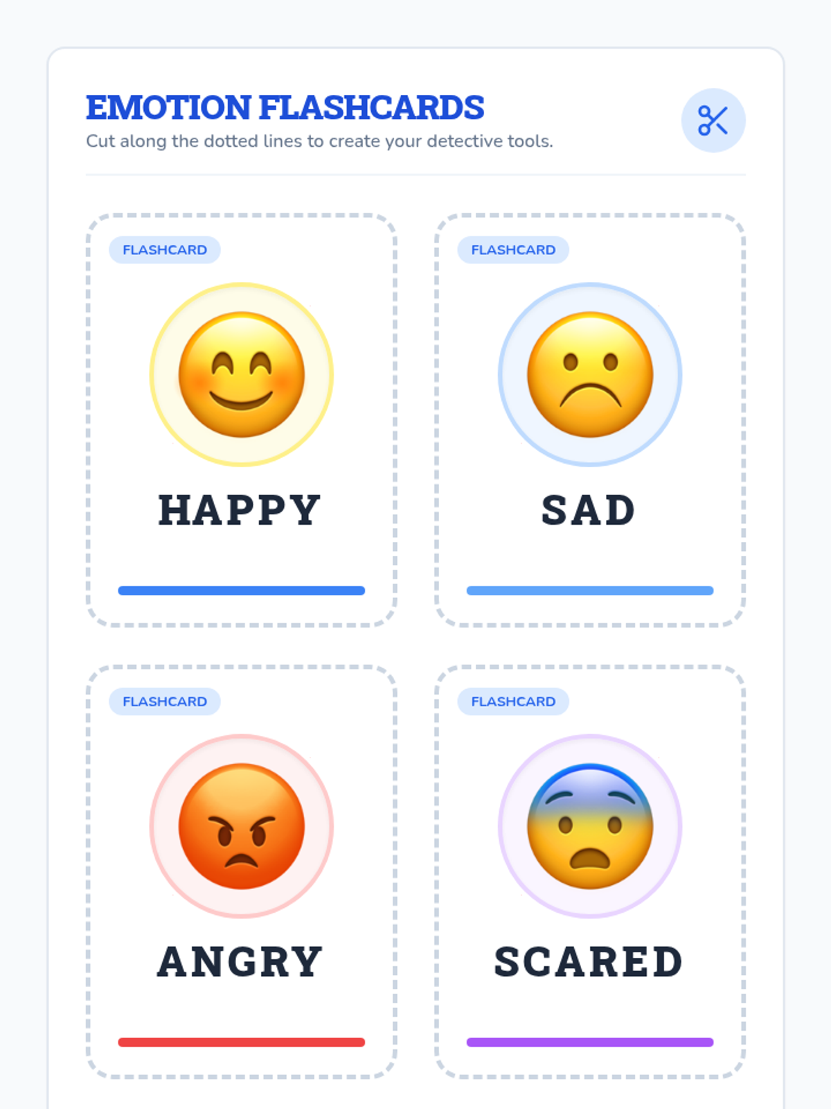 A 15-minute one-on-one session for kindergarteners to identify and name basic emotions (happy, sad, angry, scared) using facial expressions and scenarios.