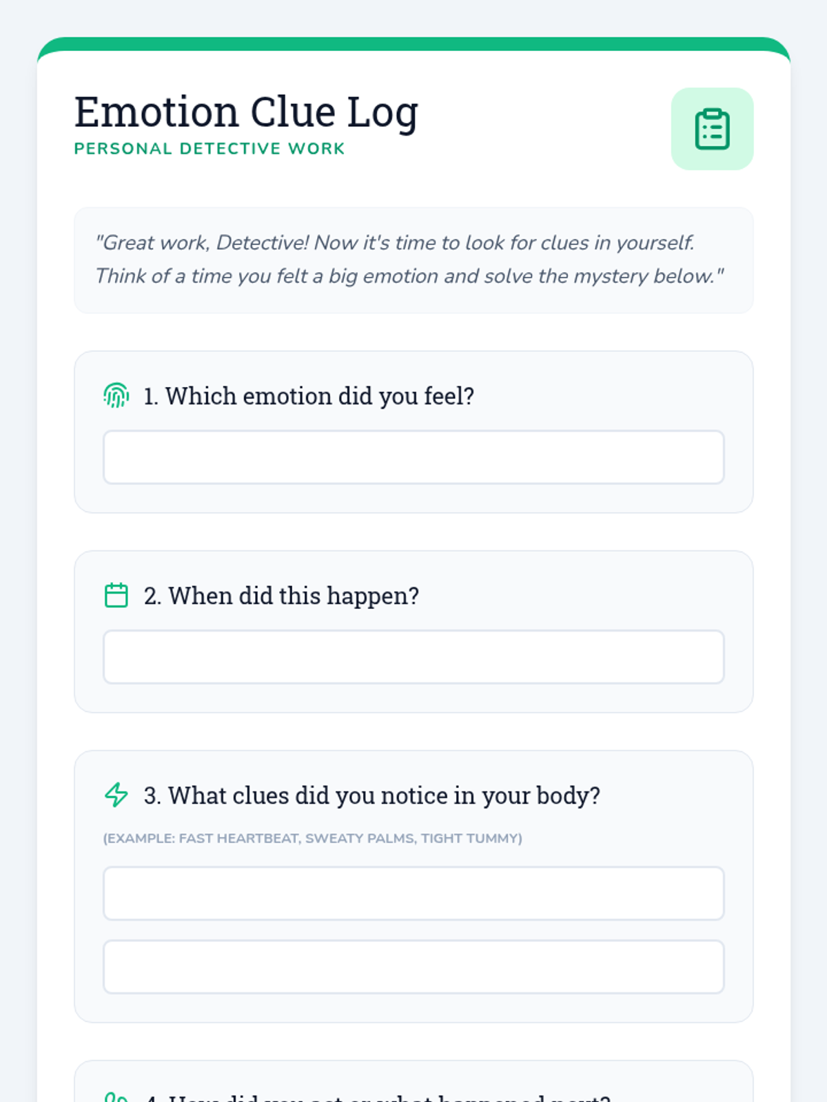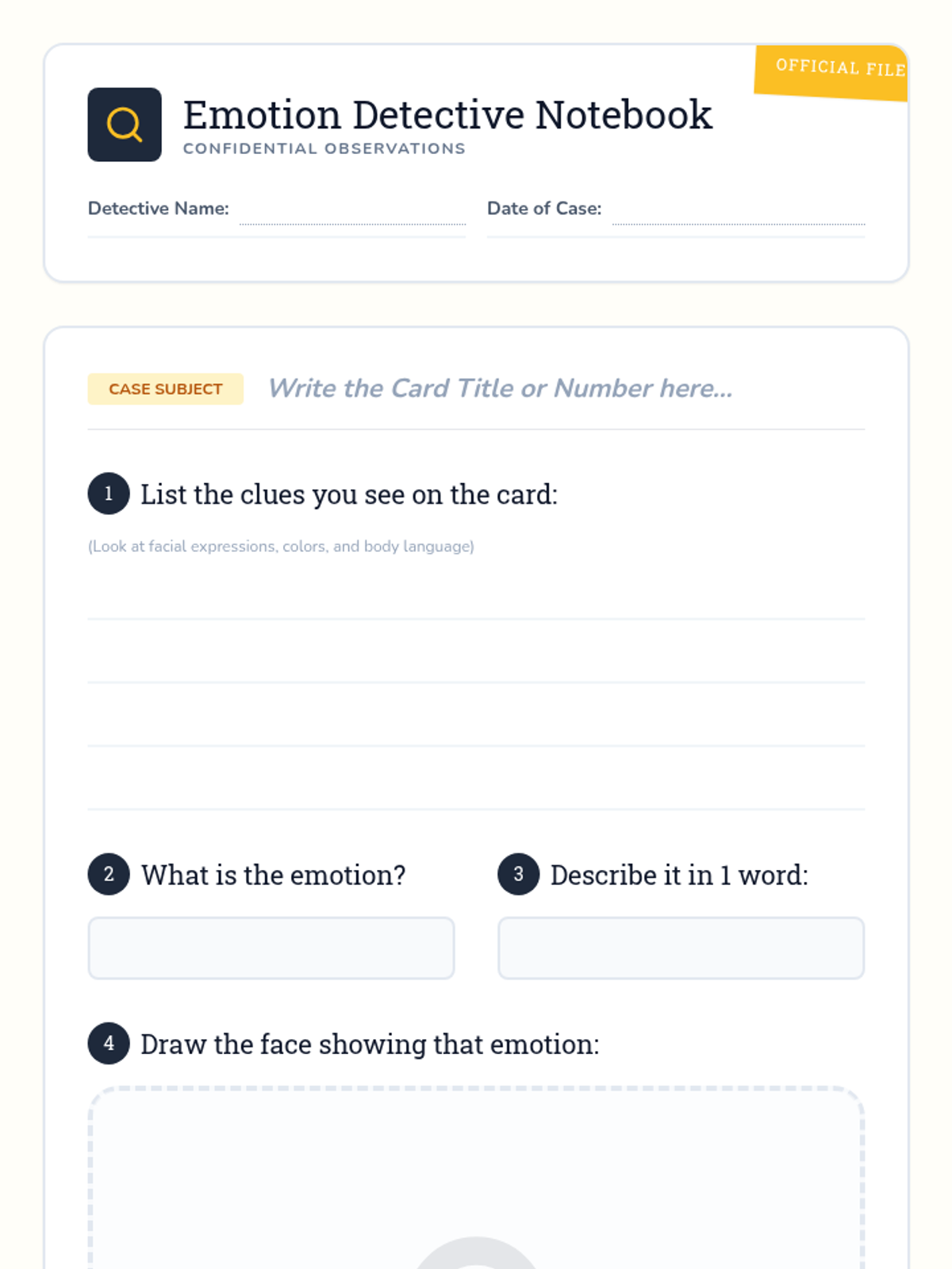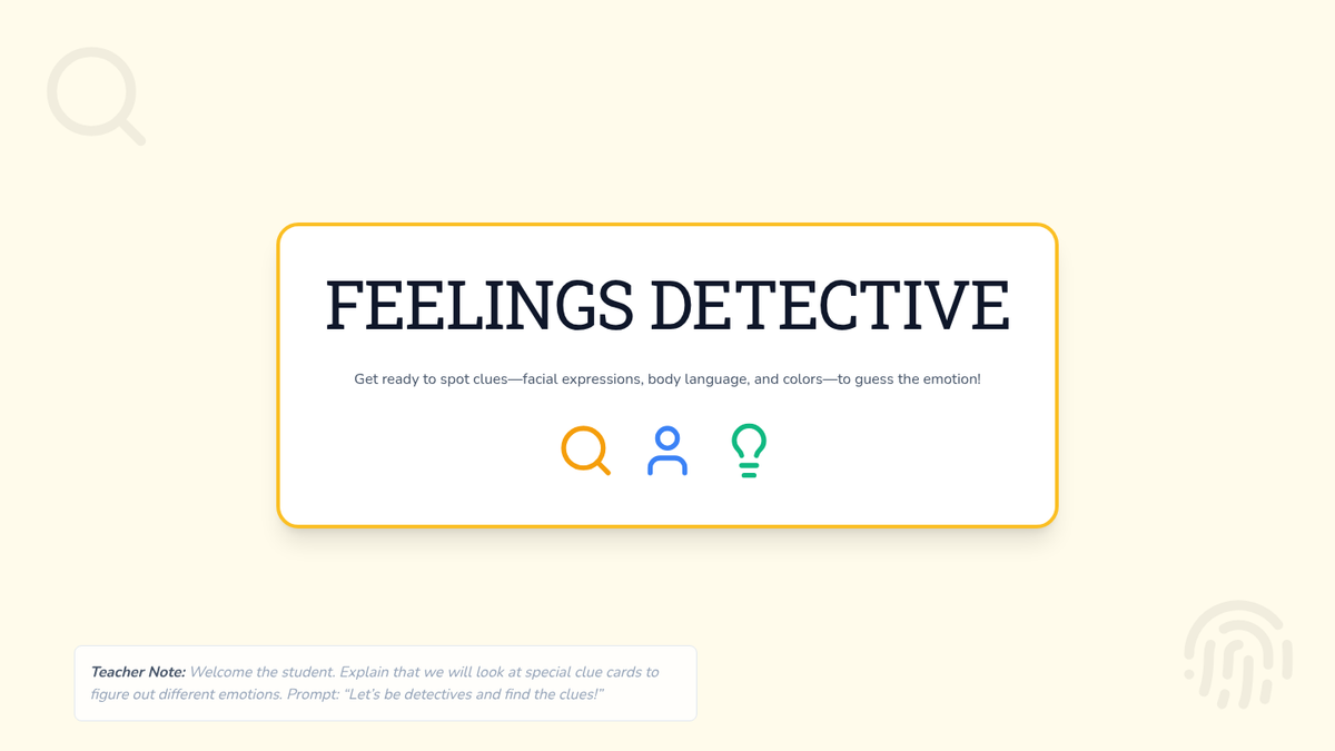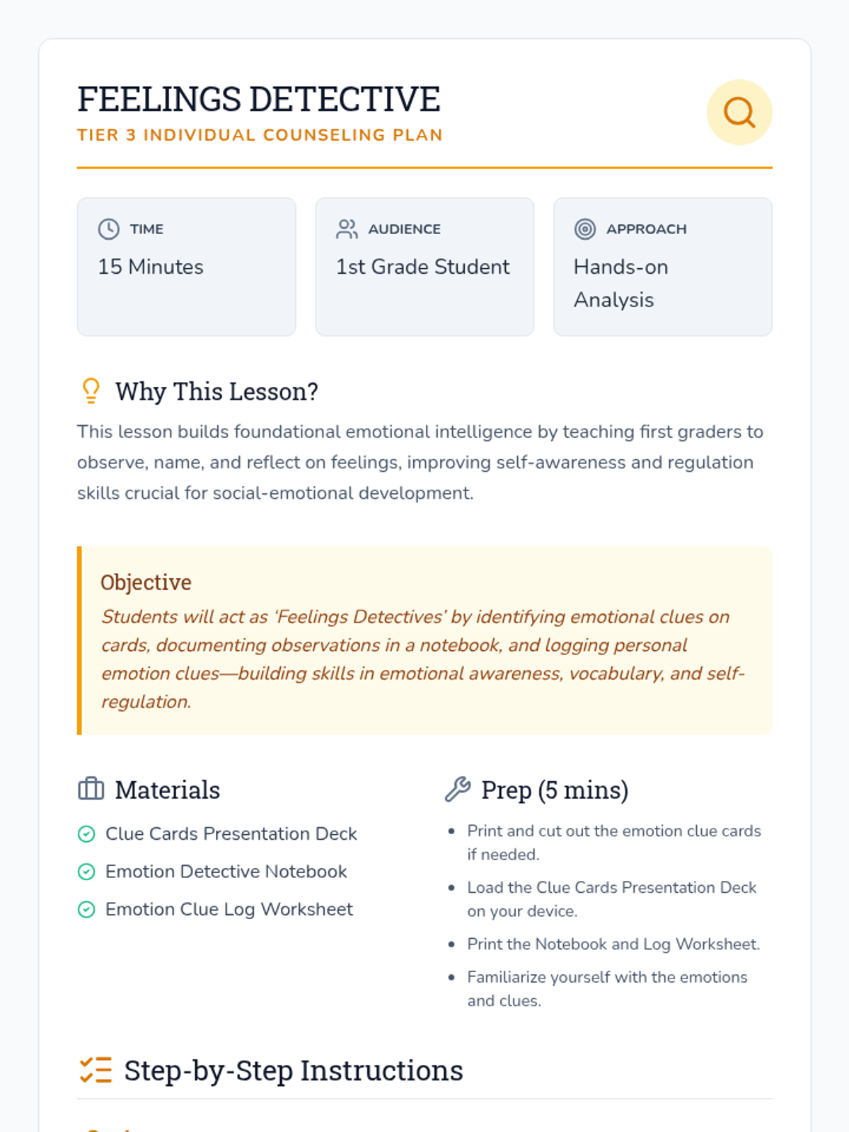 A 15-minute individual counseling session where a 1st grader plays detective to uncover emotional clues, building self-awareness and regulation skills.