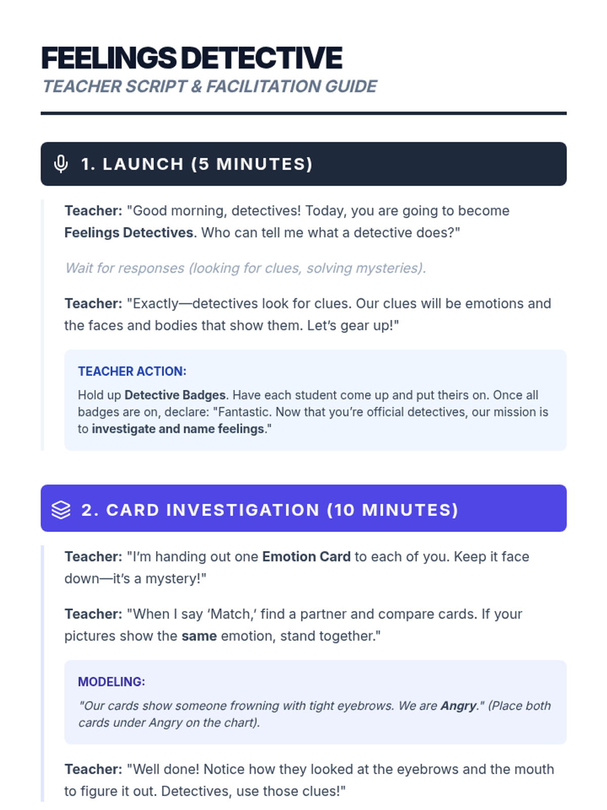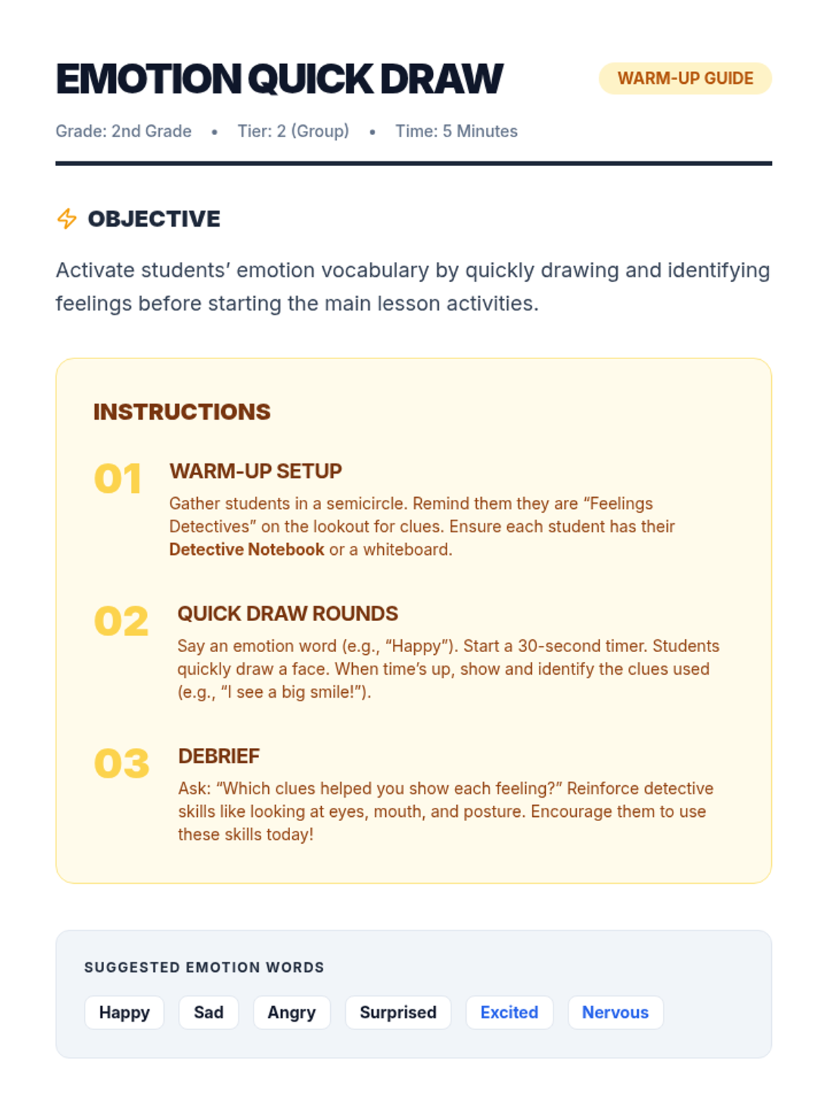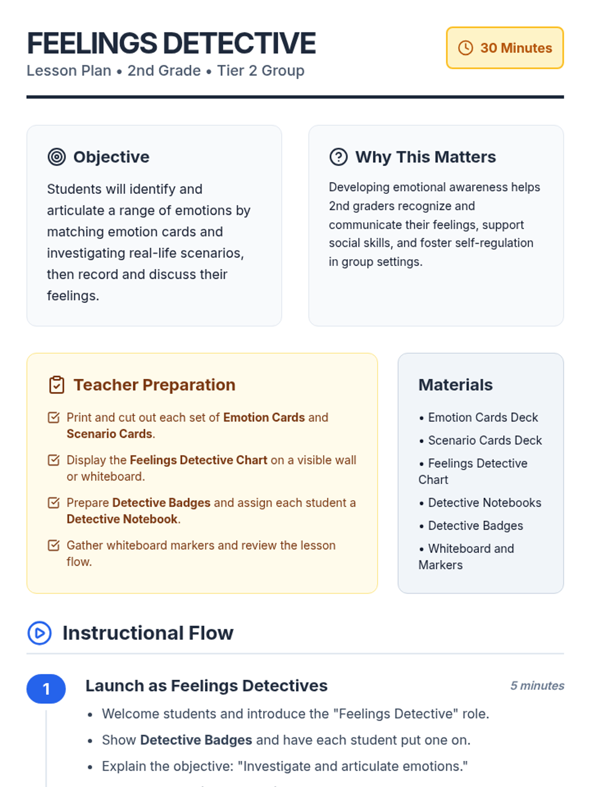 A 30-minute Tier 2 small group lesson where 2nd graders become 'Feelings Detectives' to identify, match, and articulate emotions using visual clues and scenarios.