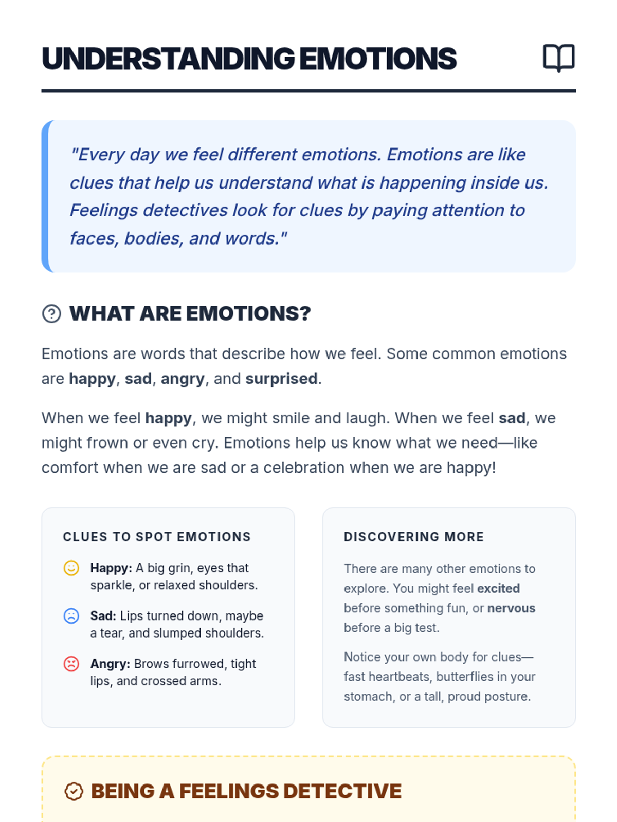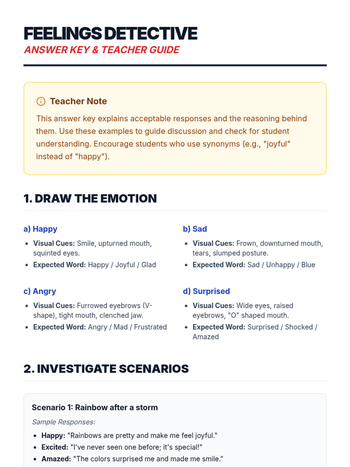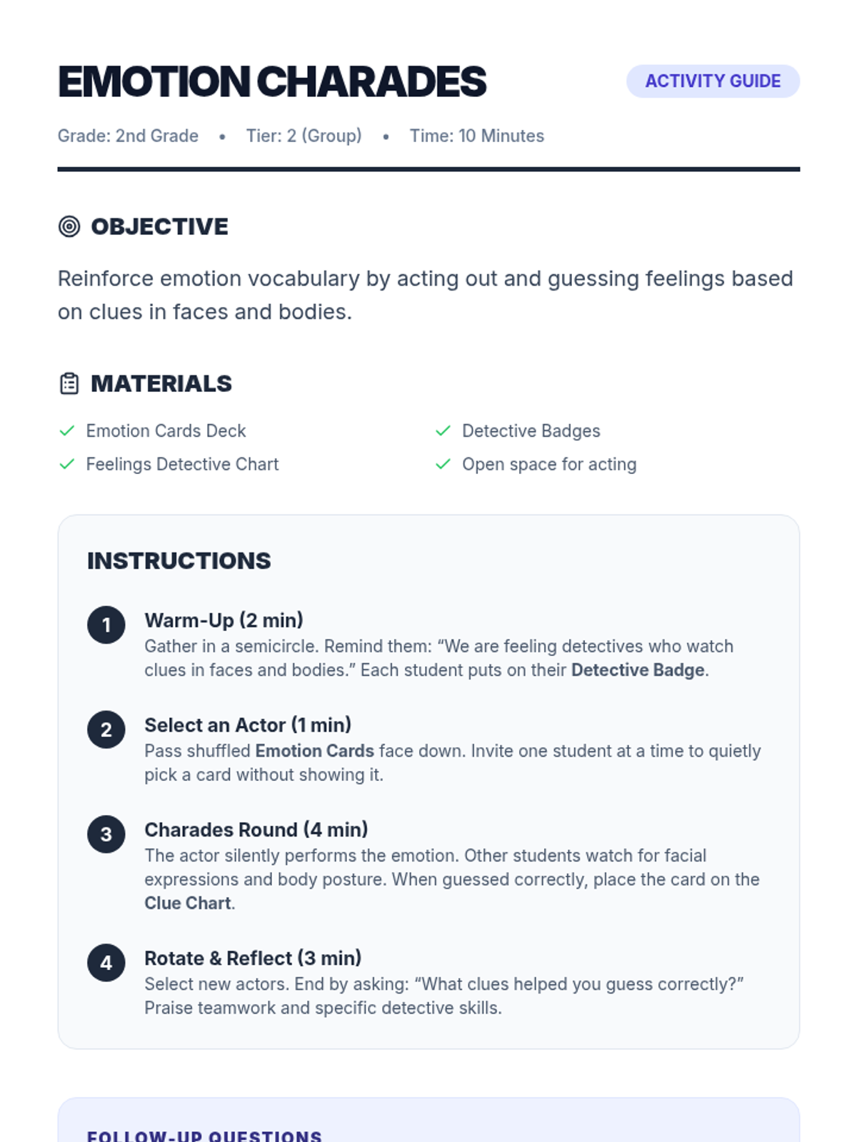 A 30-minute Tier 2 small group lesson where 2nd graders become 'Feelings Detectives' to identify, match, and articulate emotions using visual clues and scenarios.