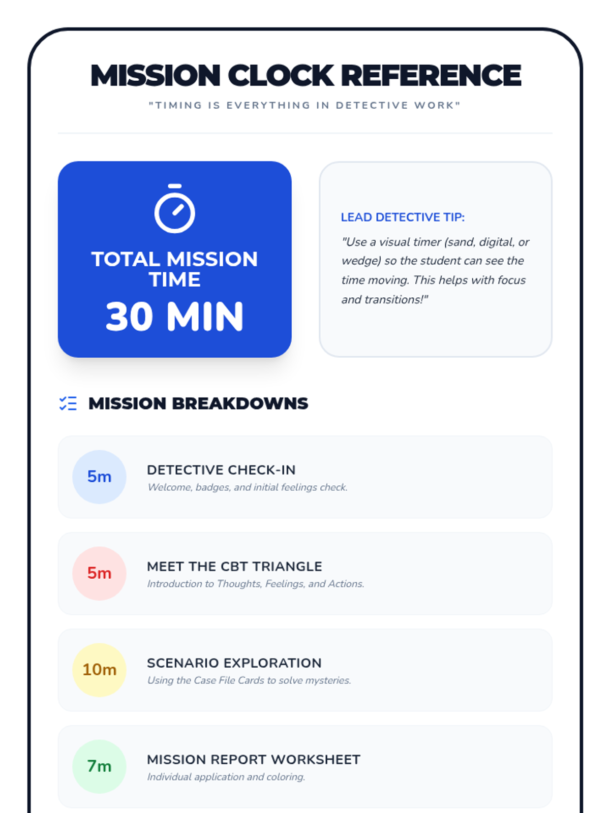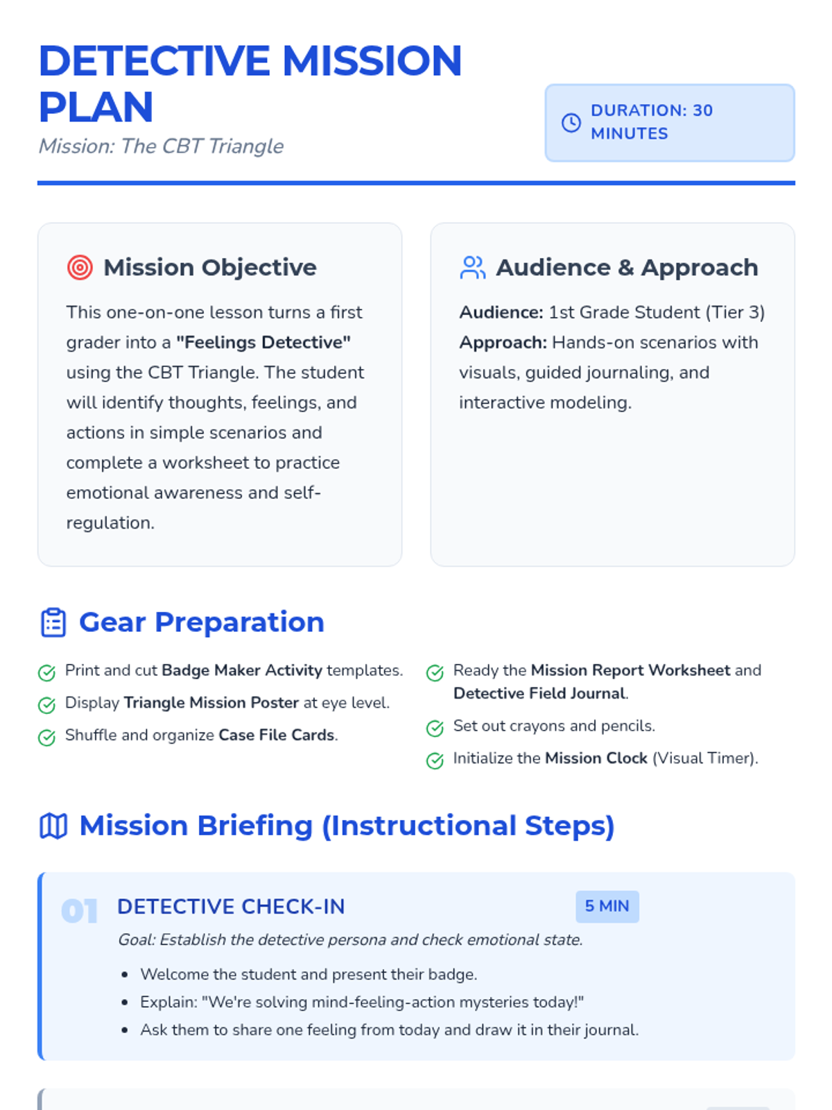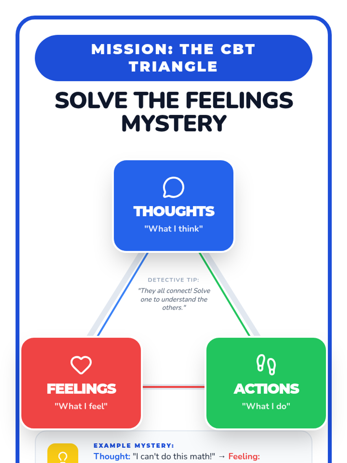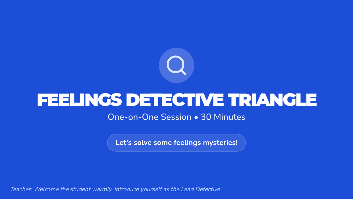 A 30-minute one-on-one session where a first grader becomes a 'feelings detective' to explore the connection between thoughts, feelings, and actions using the CBT triangle.