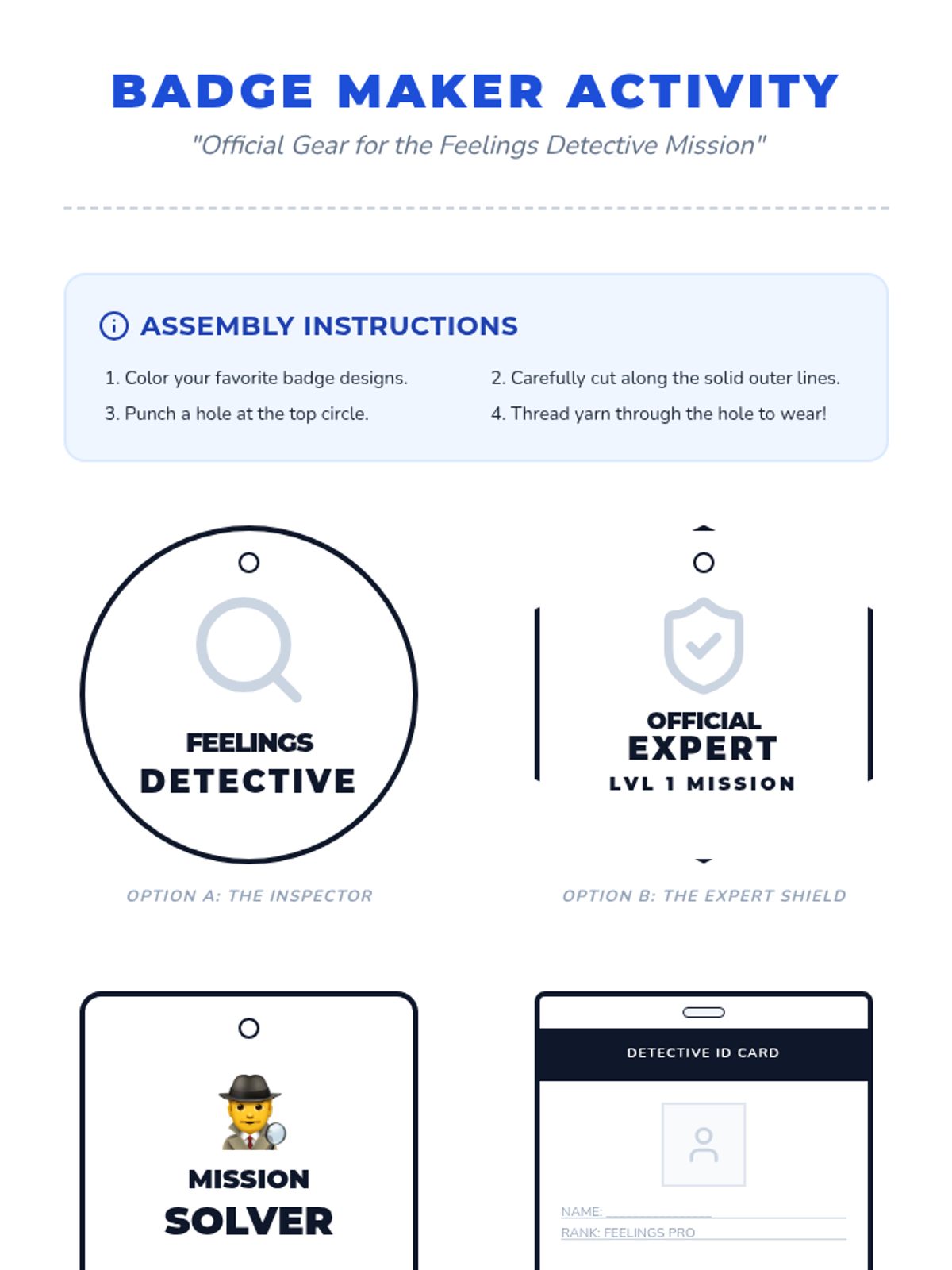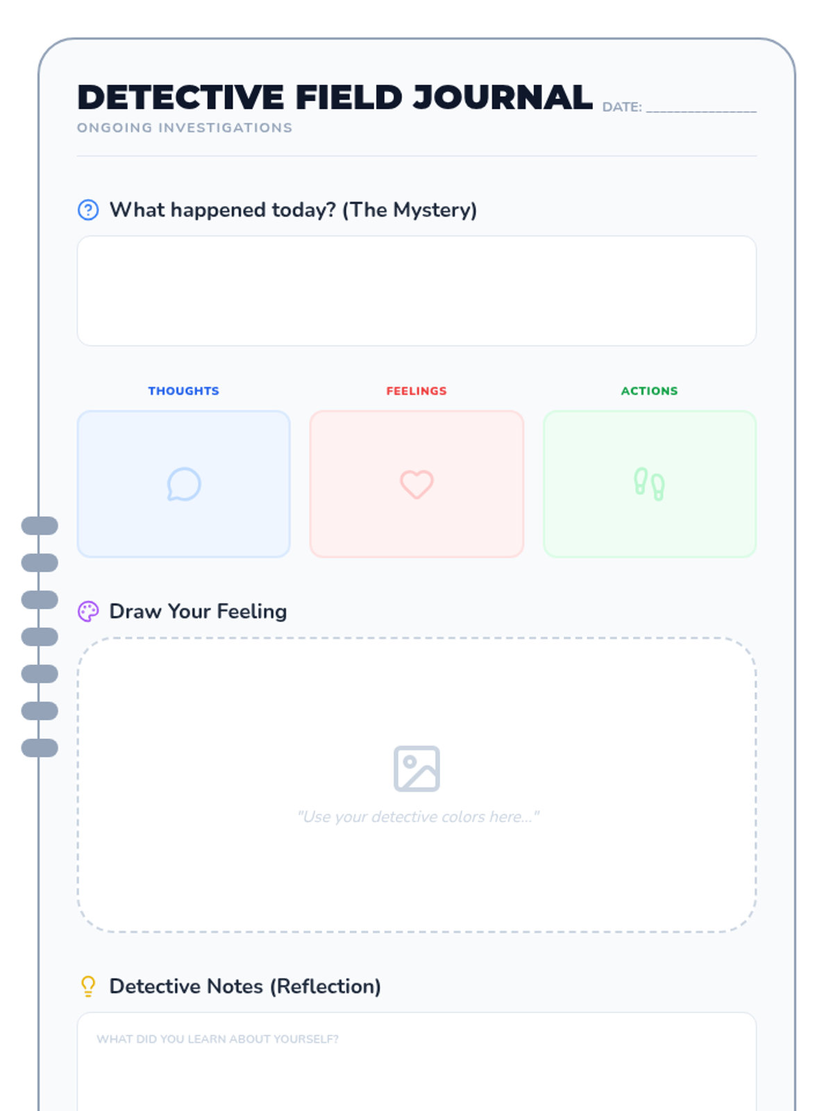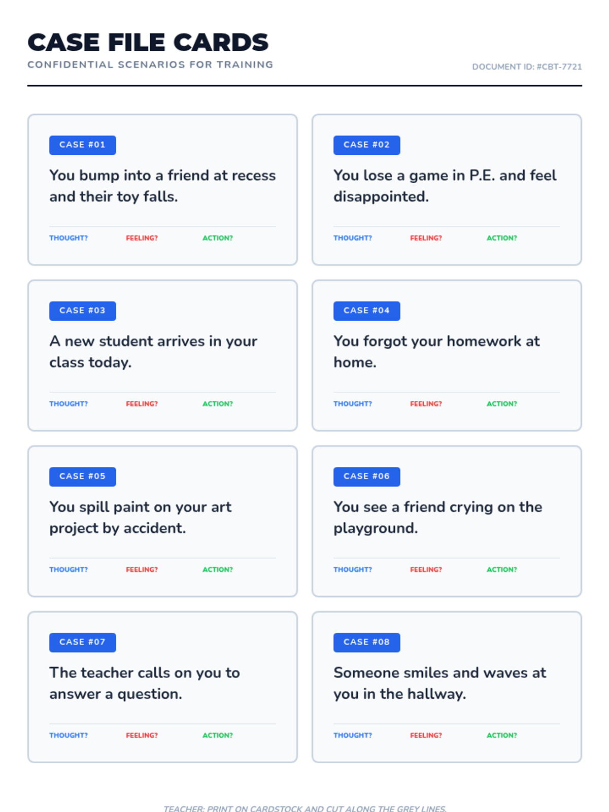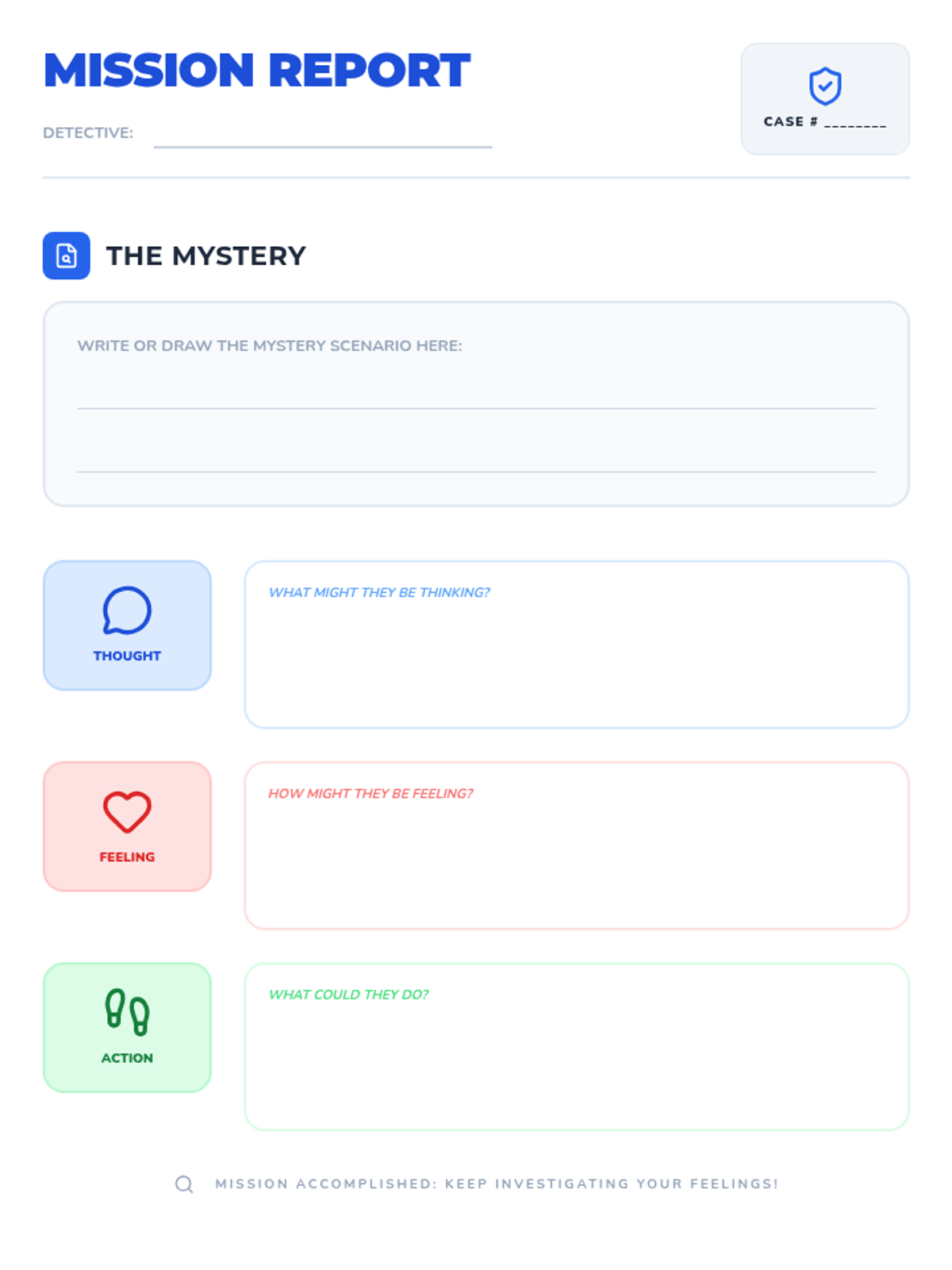 A 30-minute one-on-one session where a first grader becomes a 'feelings detective' to explore the connection between thoughts, feelings, and actions using the CBT triangle.