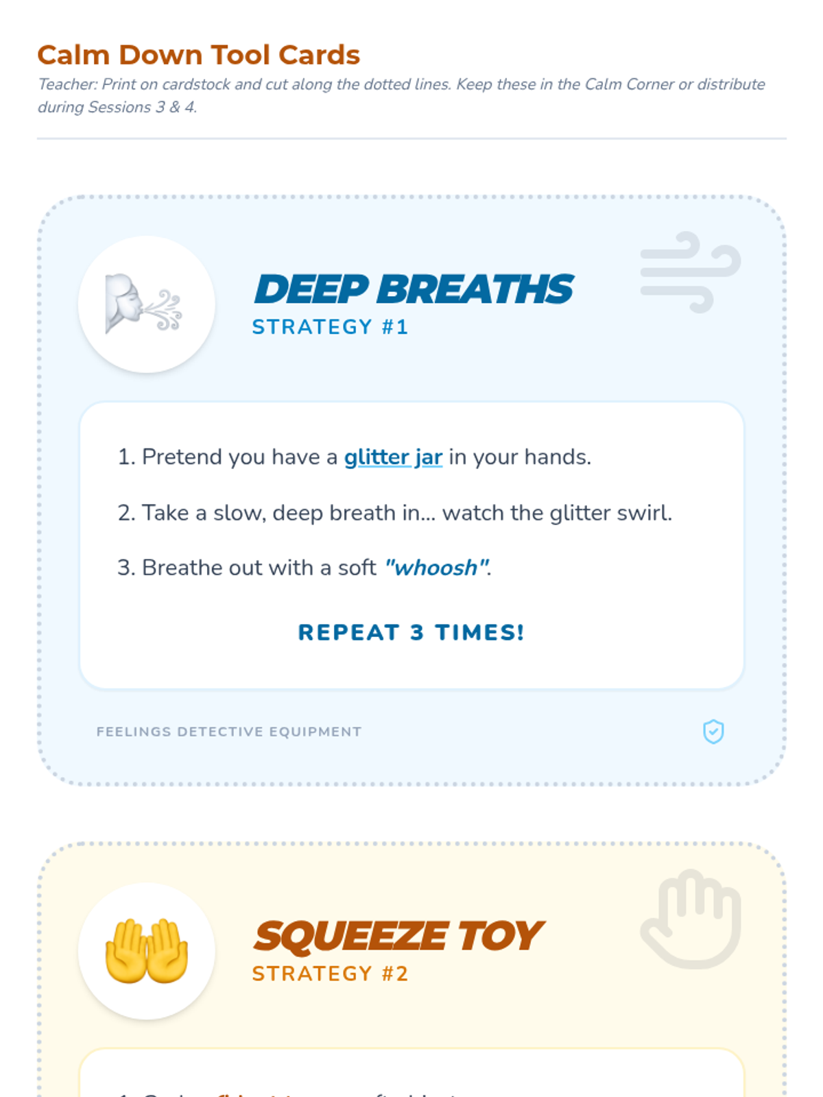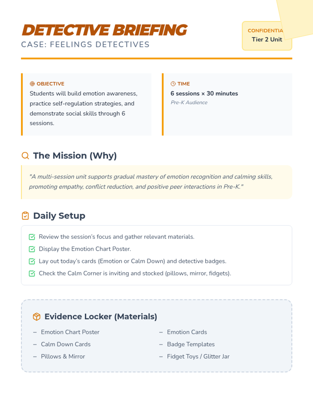 A 6-session Tier 2 social-emotional learning unit for Pre-K students focused on identifying emotions, practicing self-regulation, and developing cooperative social skills through a detective-themed adventure.
