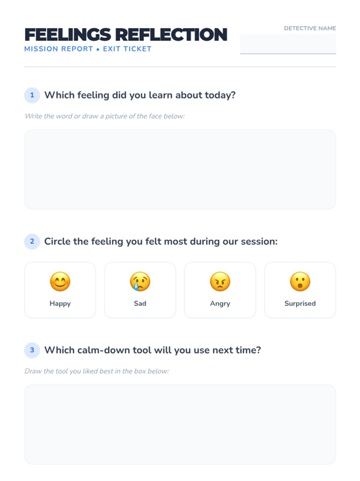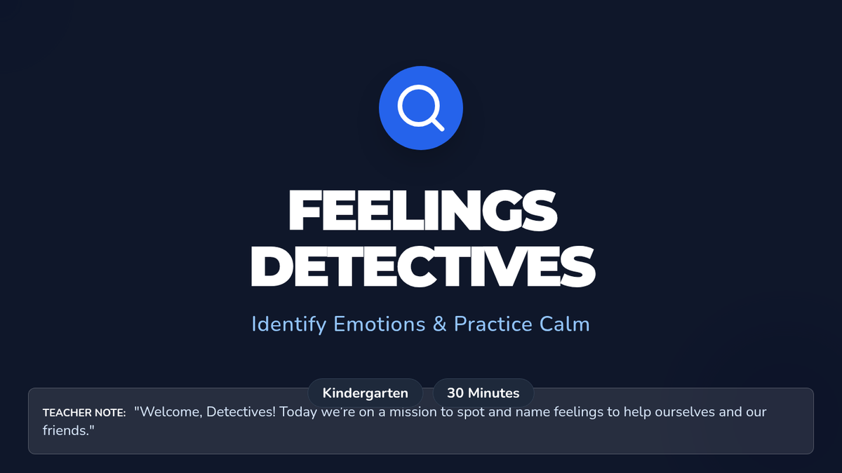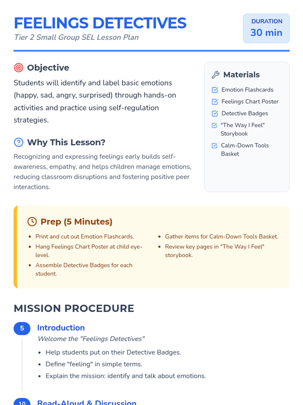 A 30-minute Tier 2 SEL lesson for kindergarteners to identify and express emotions using a detective theme, interactive games, and calm-down strategies.