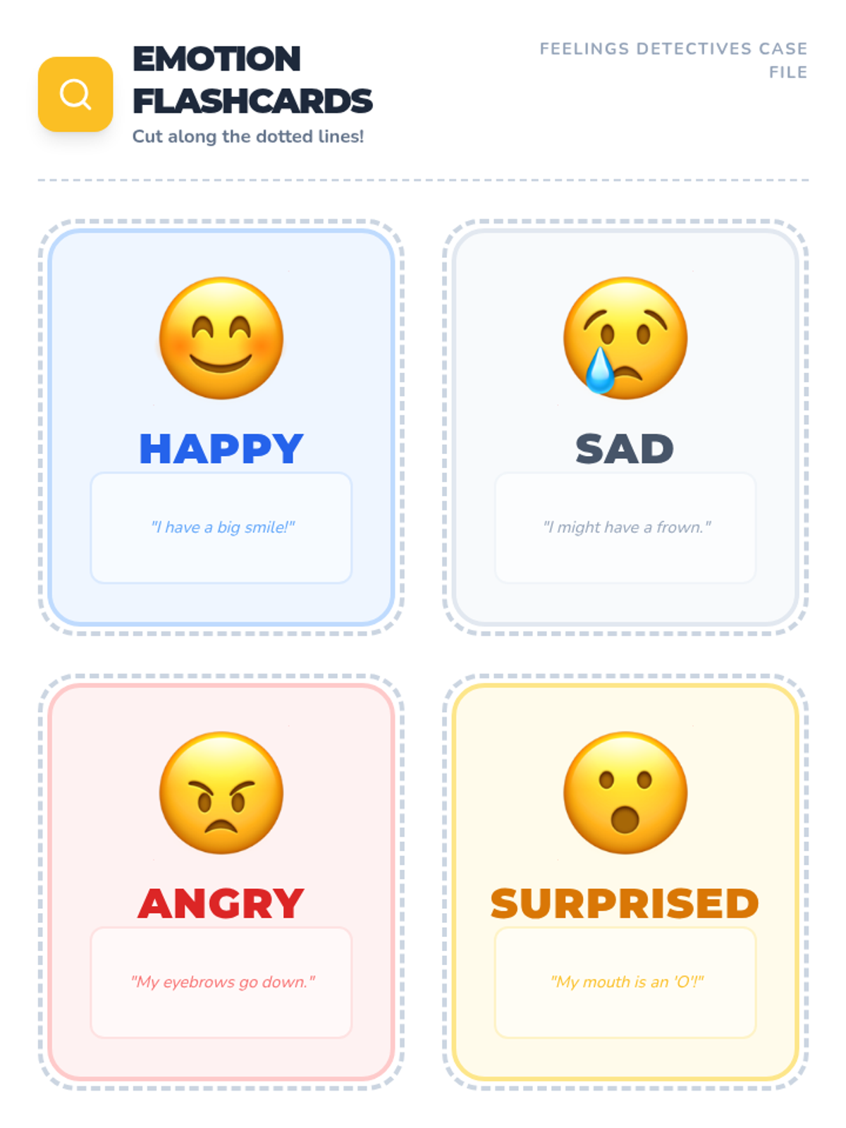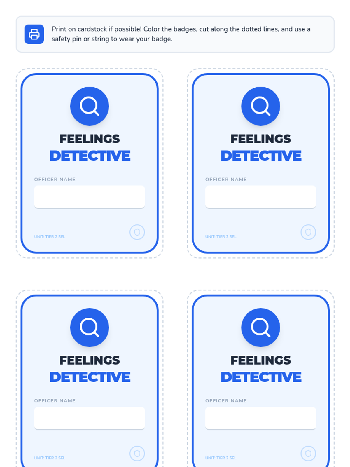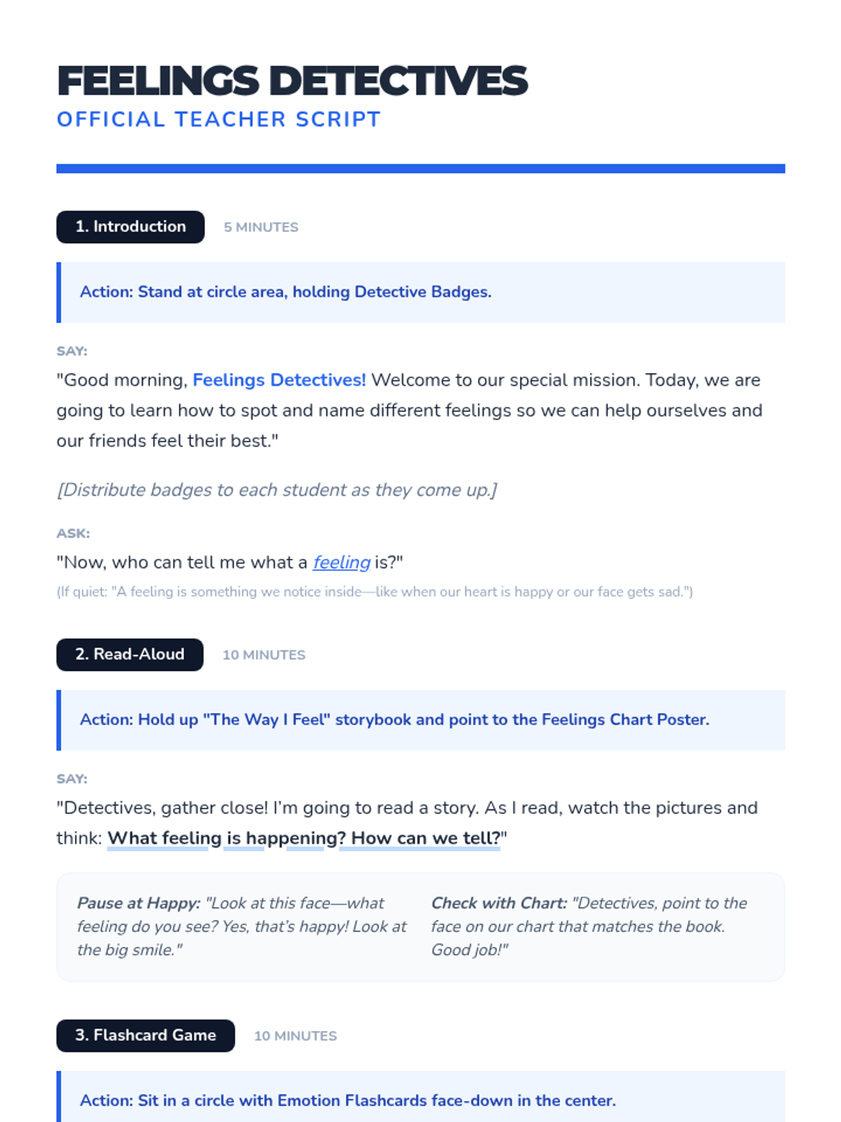 A 30-minute Tier 2 SEL lesson for kindergarteners to identify and express emotions using a detective theme, interactive games, and calm-down strategies.