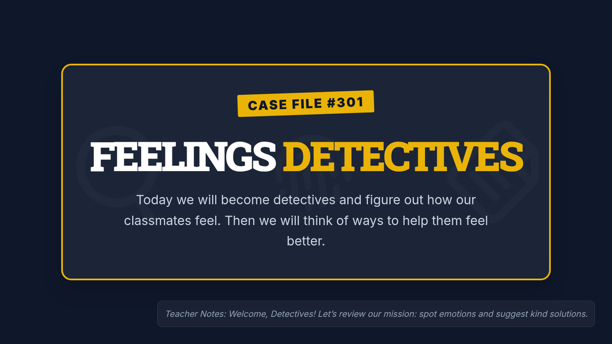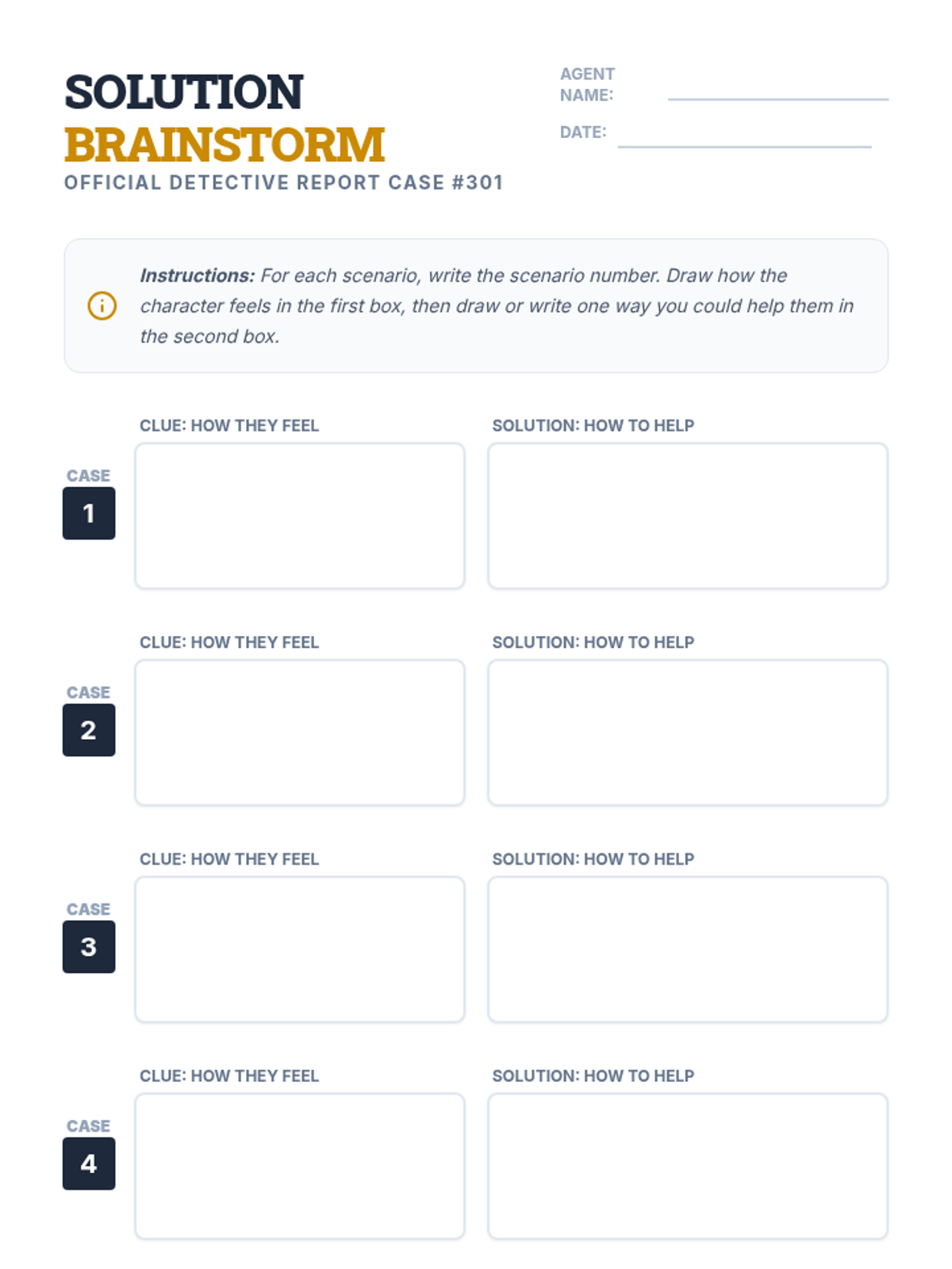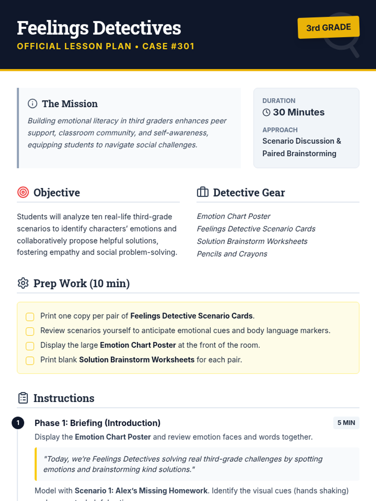 A 30-minute social-emotional learning lesson for 3rd graders that uses a detective-themed approach to identify emotions and brainstorm empathetic solutions in school scenarios.
