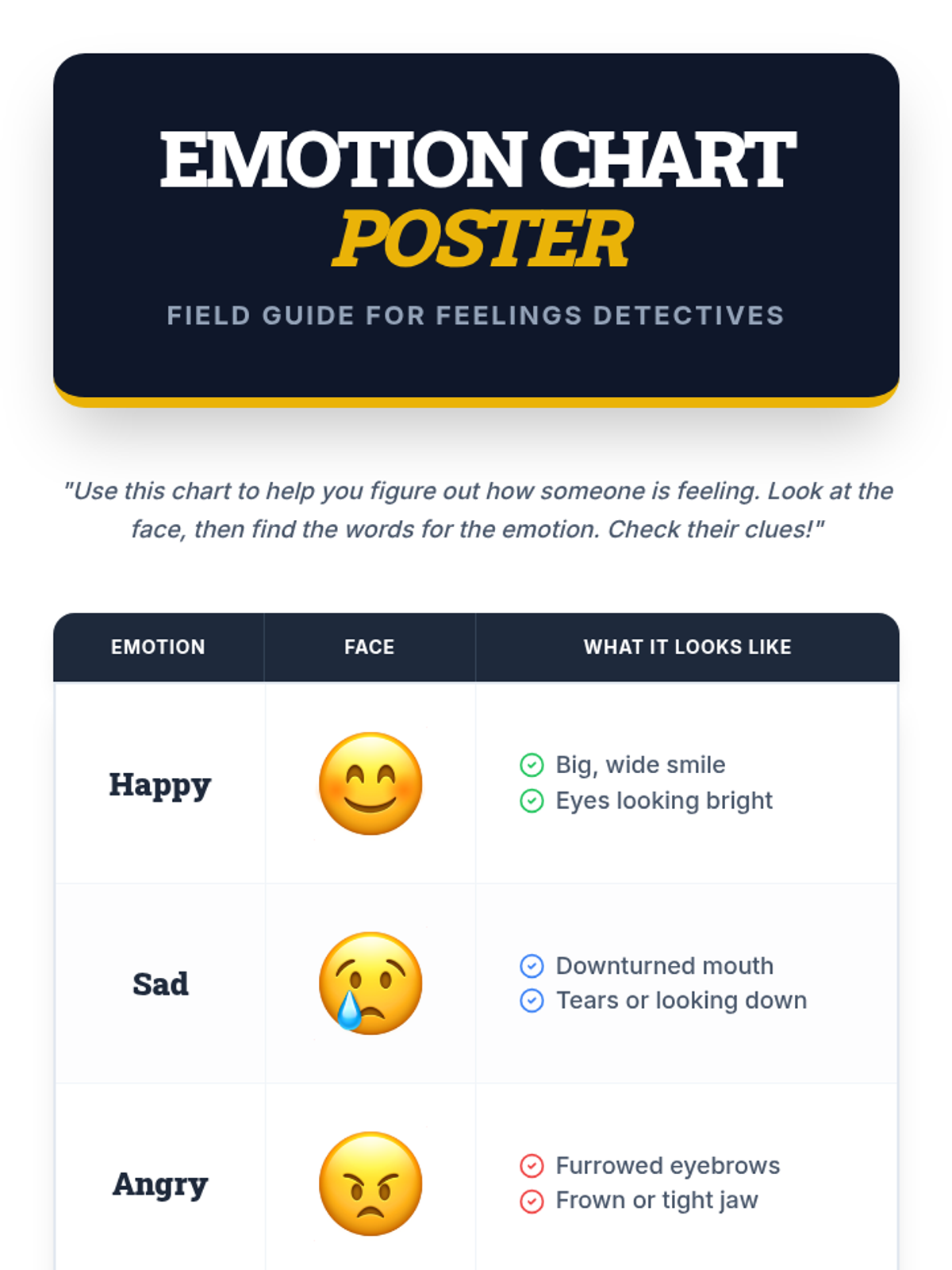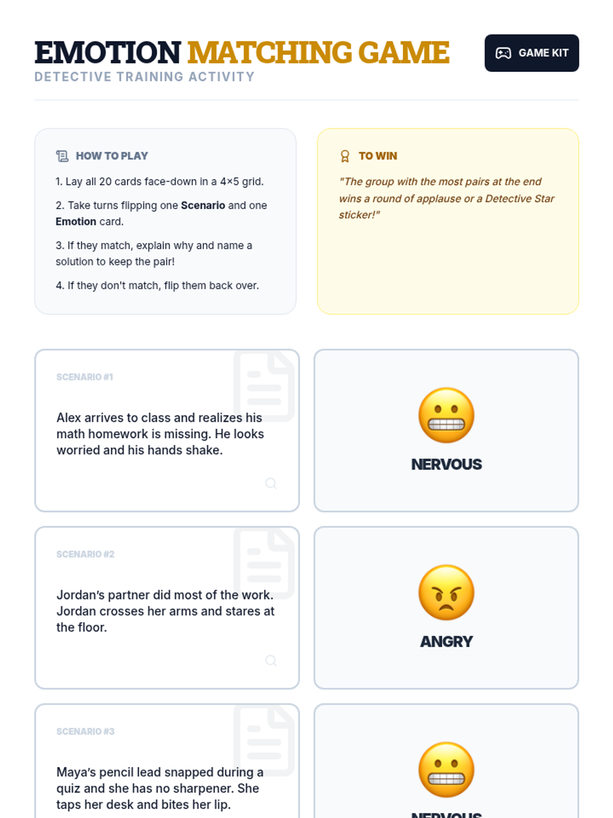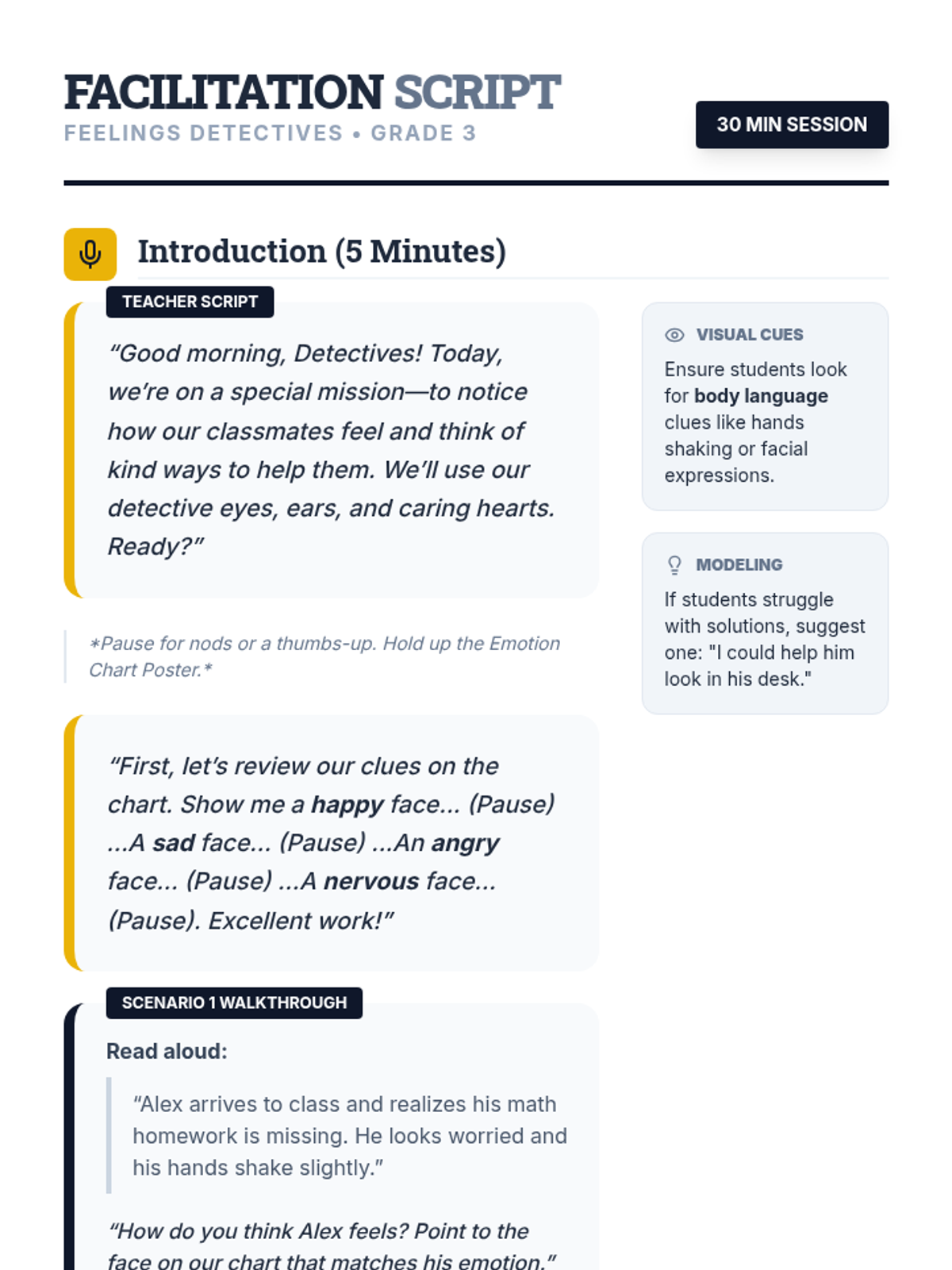 A 30-minute social-emotional learning lesson for 3rd graders that uses a detective-themed approach to identify emotions and brainstorm empathetic solutions in school scenarios.