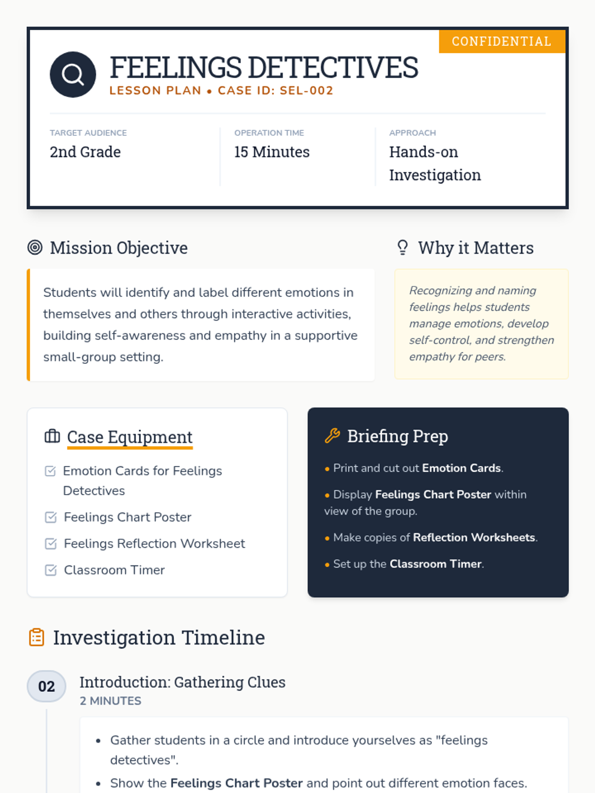 A 15-minute Tier 2 small-group lesson where 2nd graders become 'Feelings Detectives' to identify and label emotions in themselves and others.