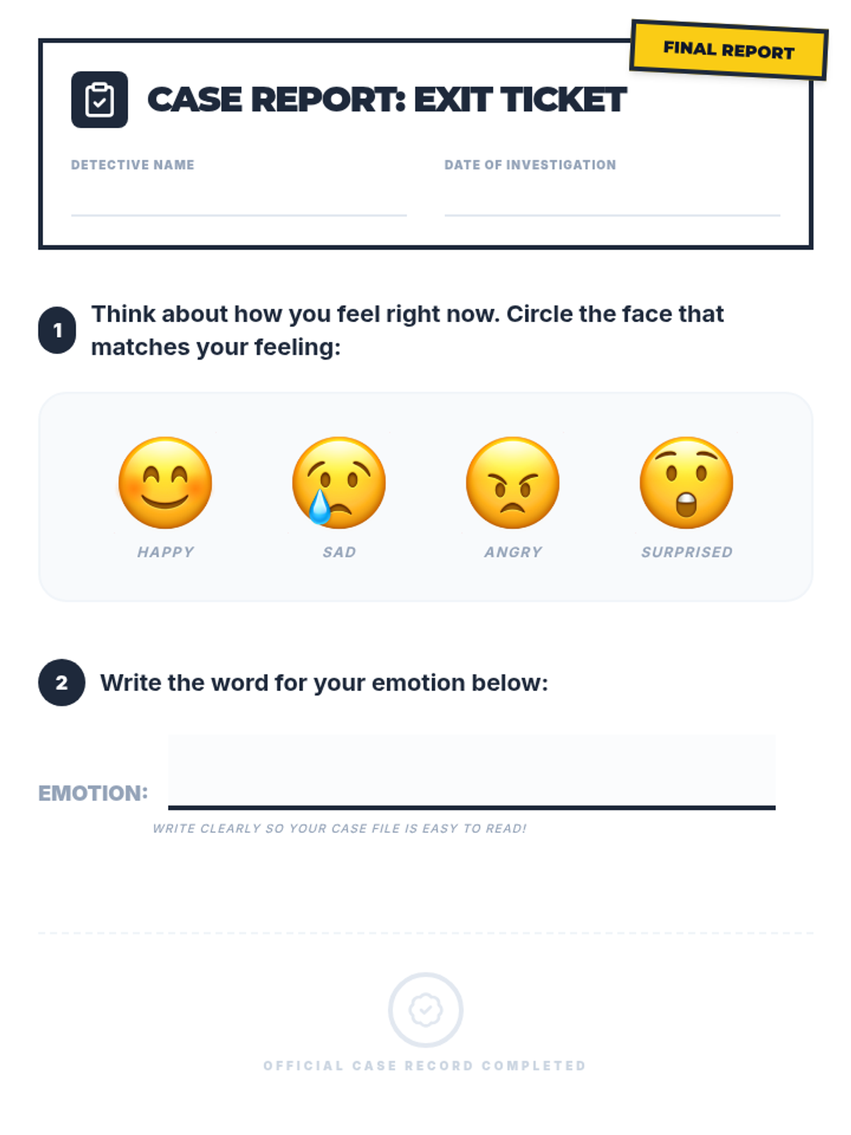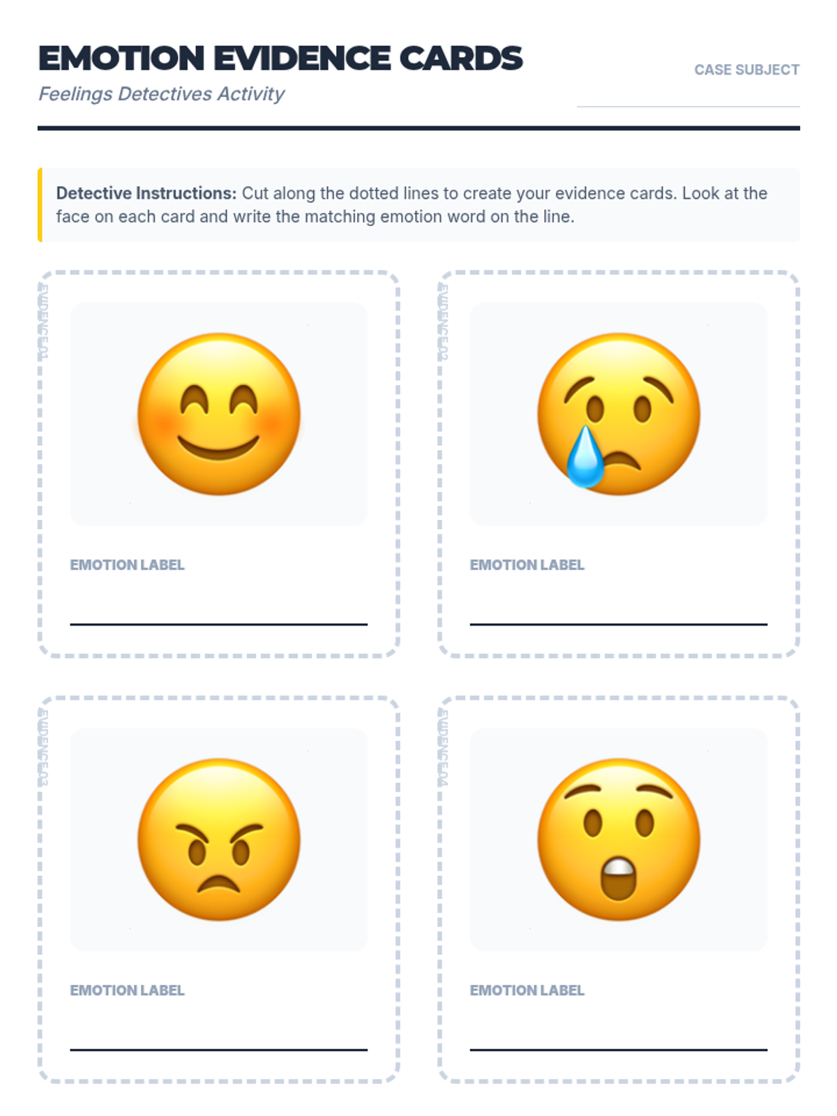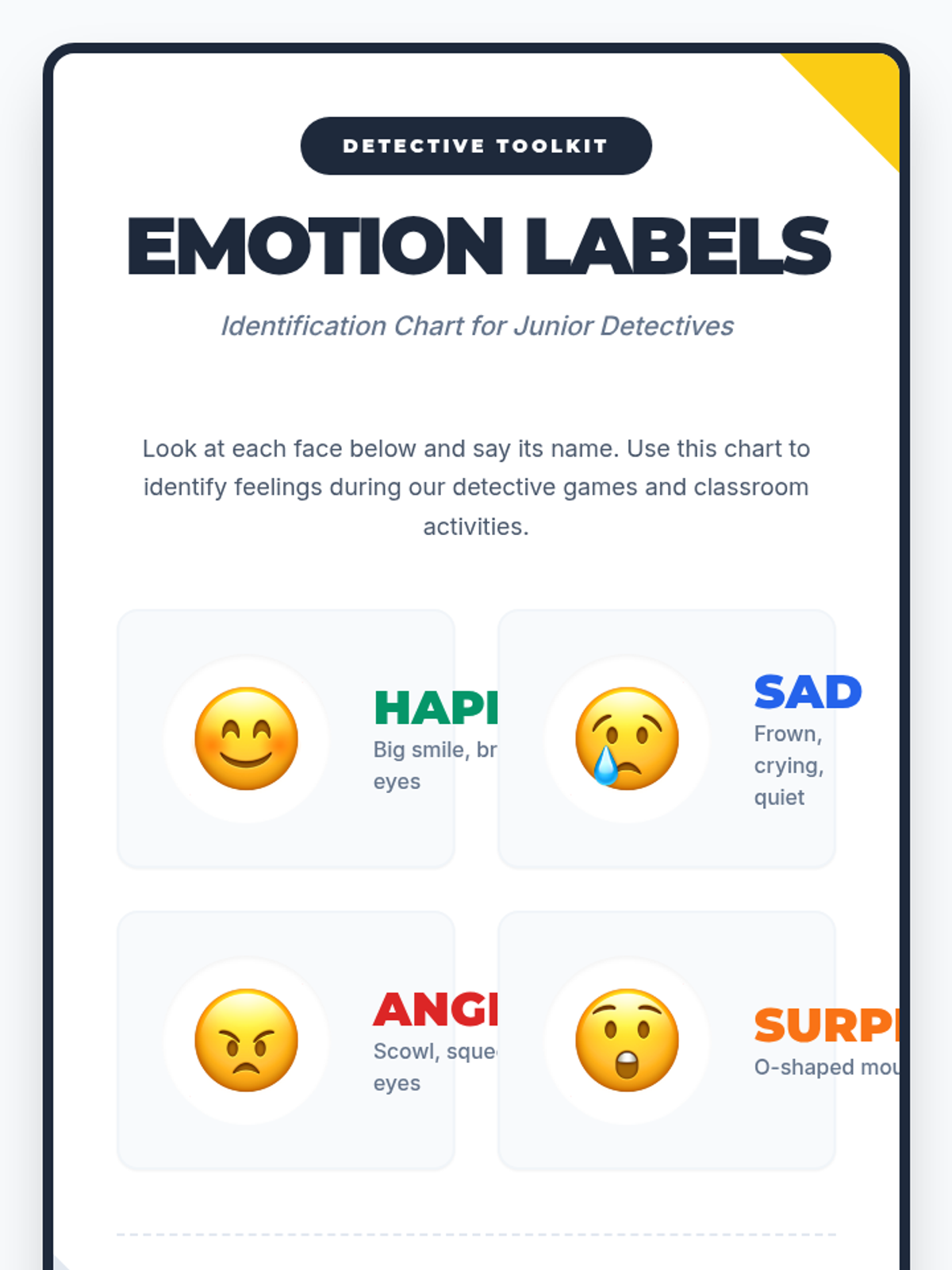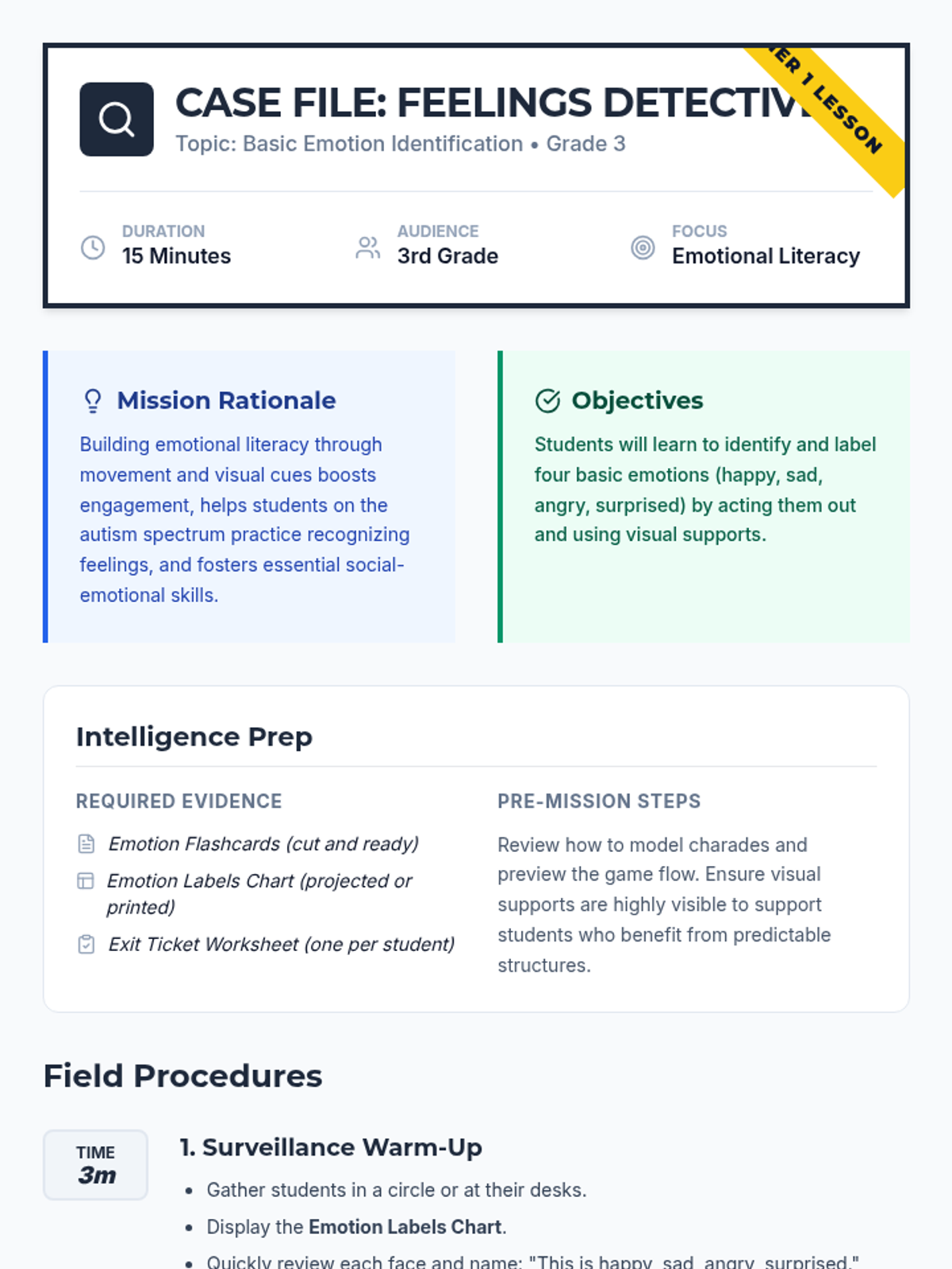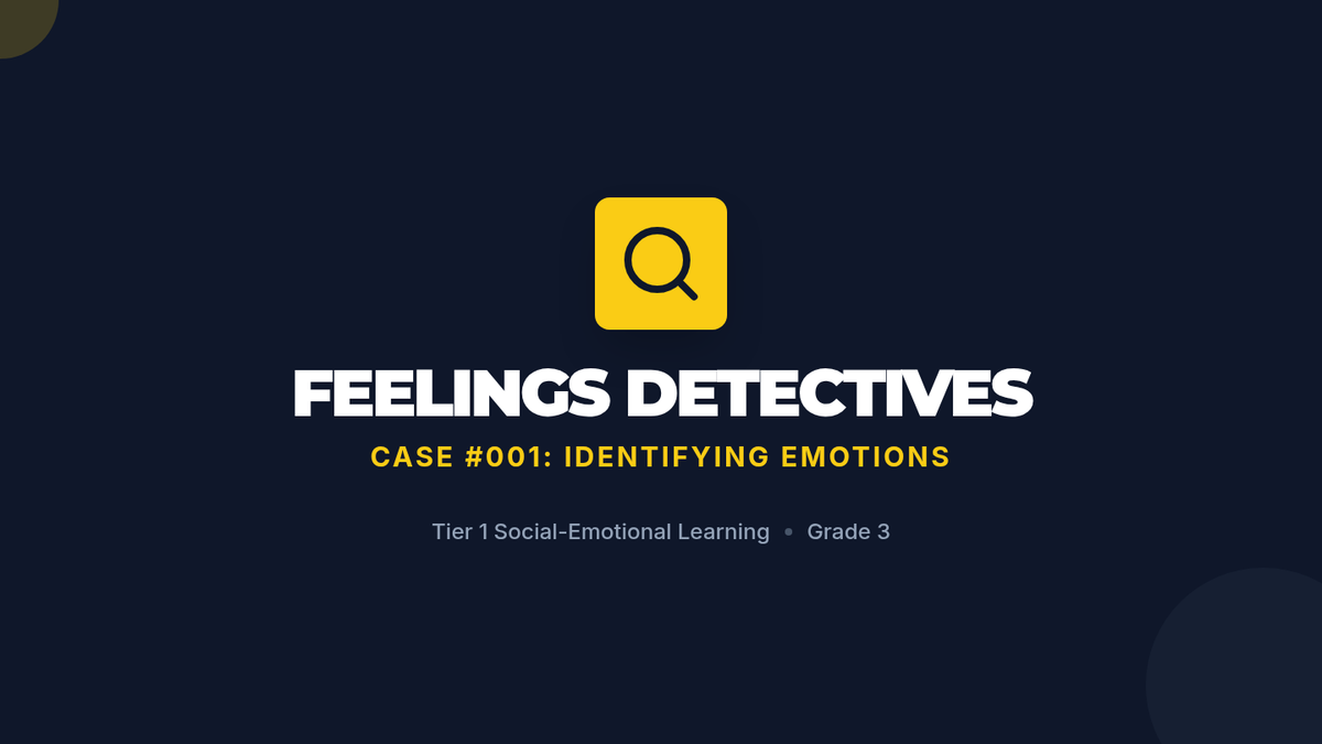 A 15-minute Tier 1 lesson for 3rd graders focused on identifying and labeling four basic emotions using interactive visuals and a charades game. This lesson is designed with clear visual supports to assist all learners, including those on the autism spectrum.