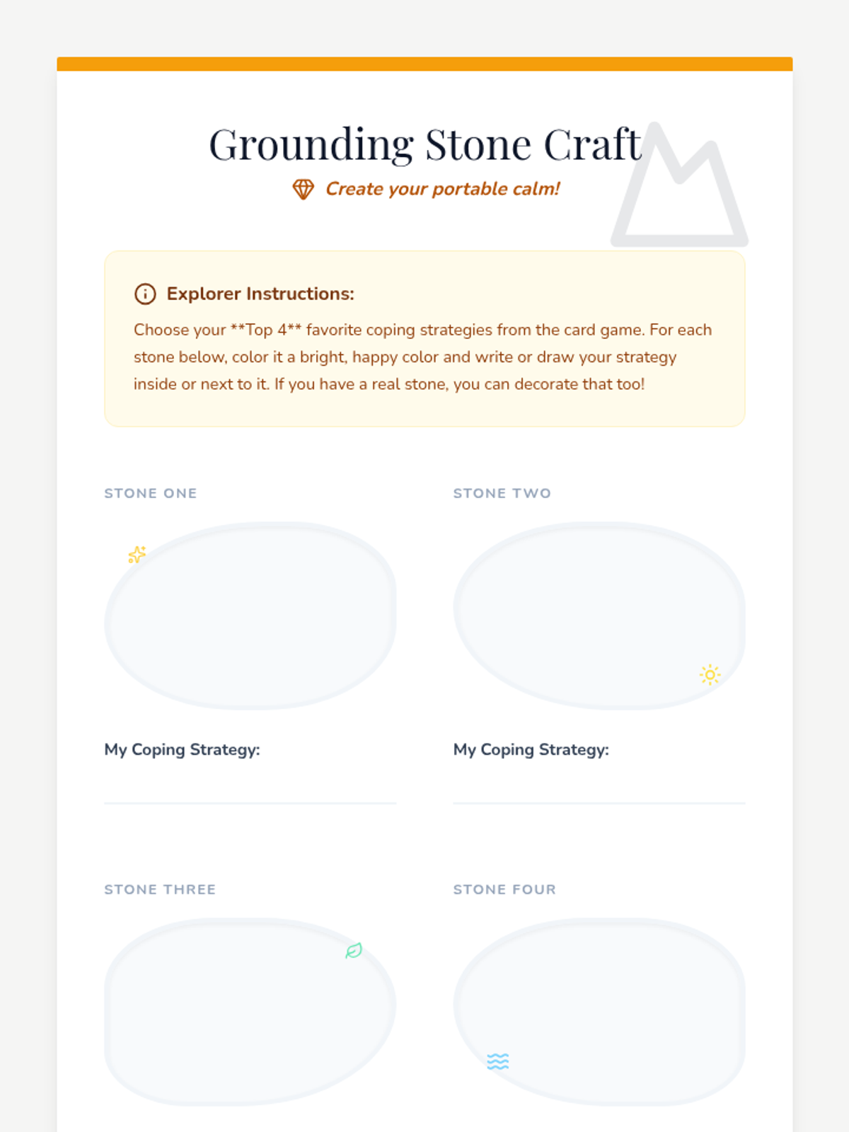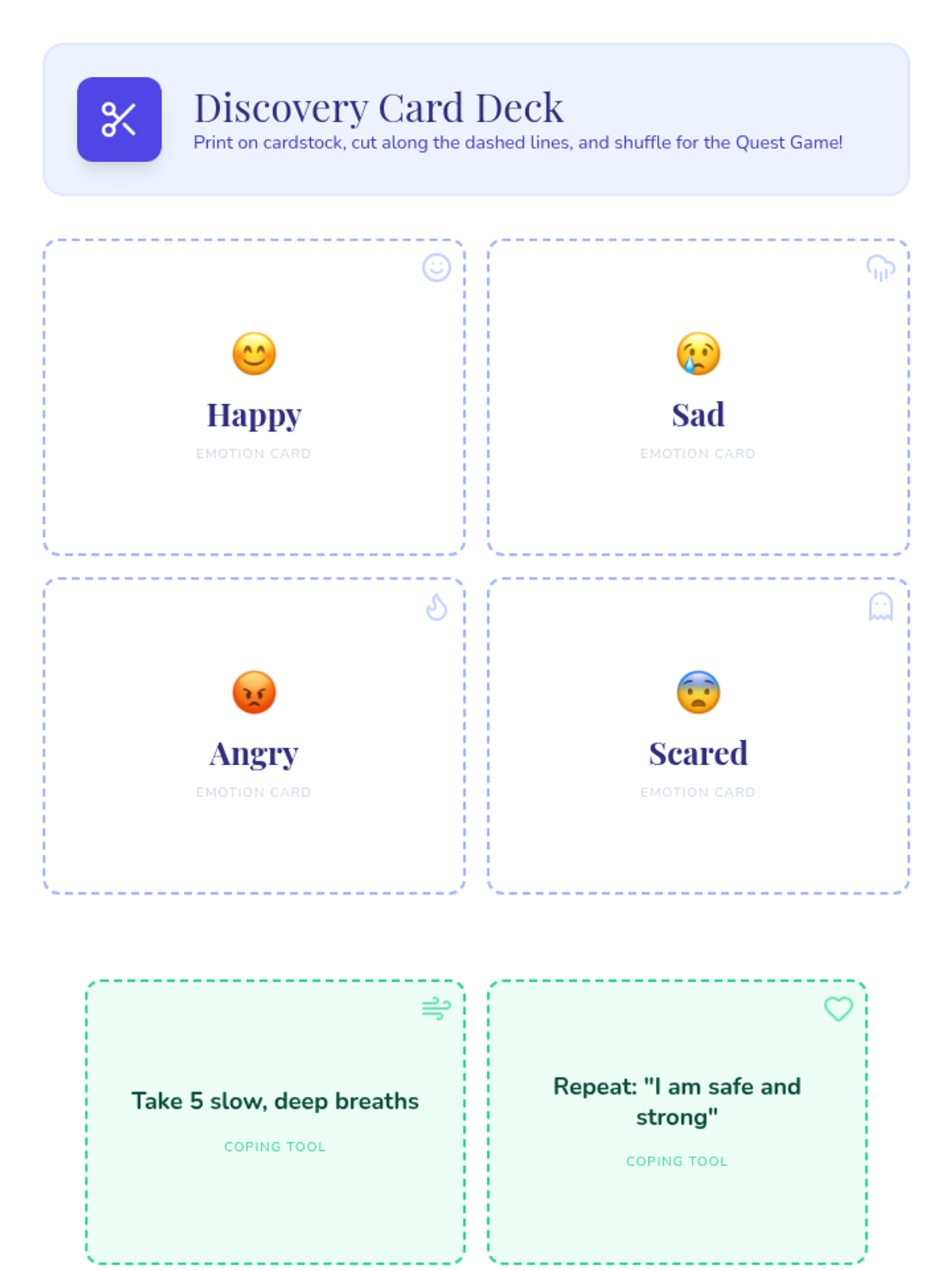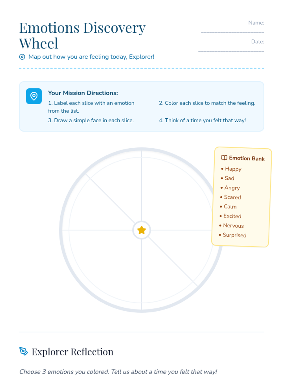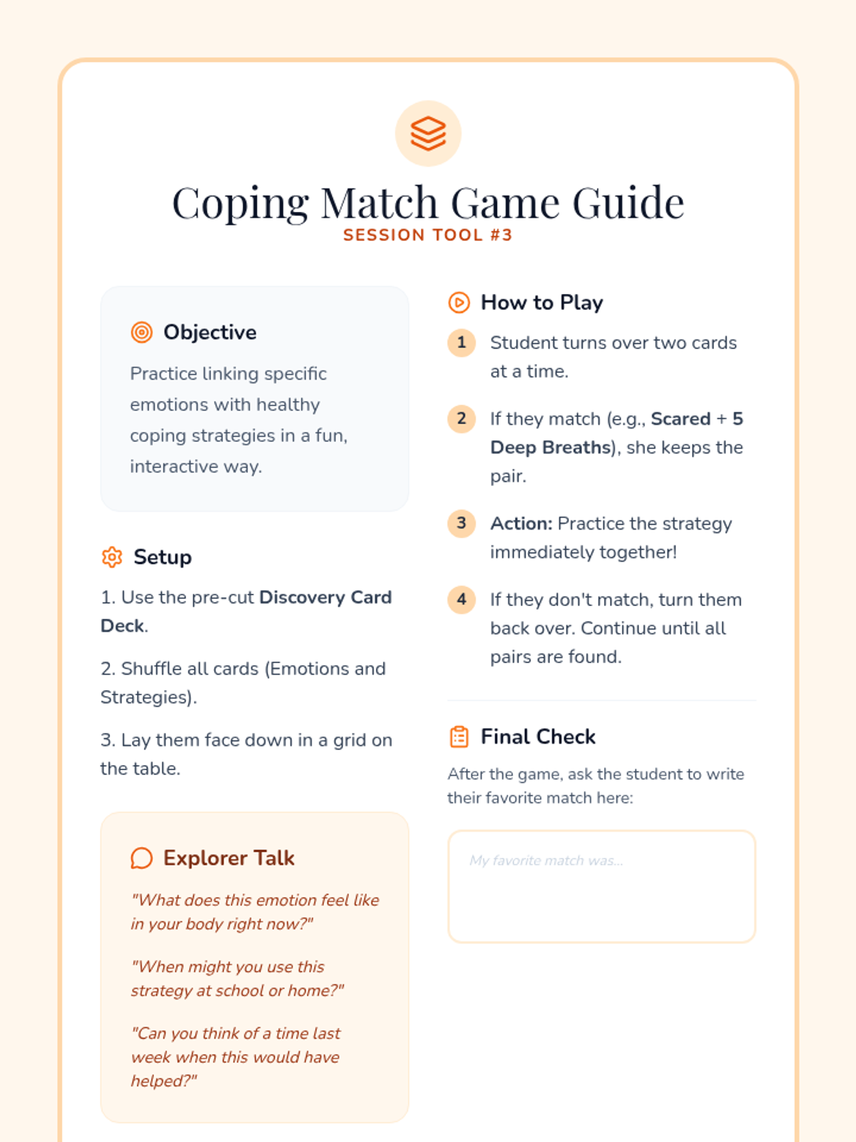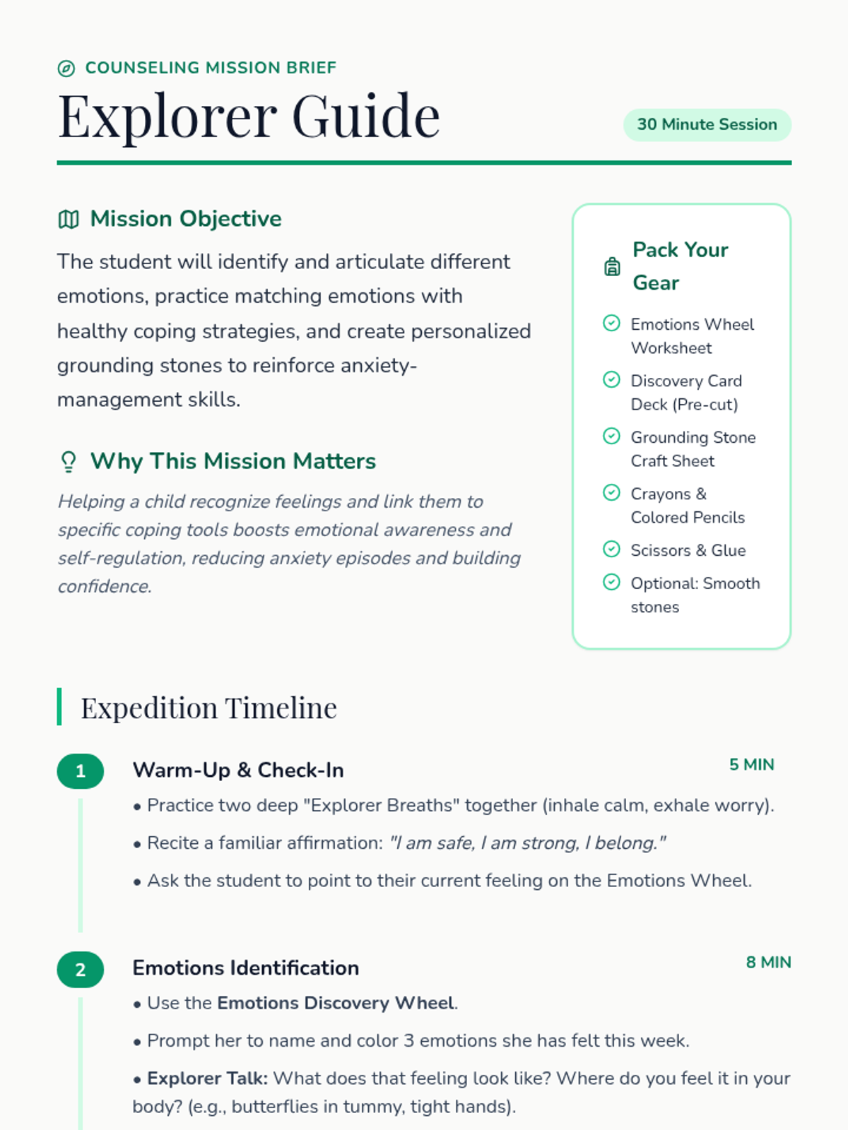 A 30-minute individual session for a 7-year-old student to explore emotions, identify triggers, and learn grounding techniques through a creative explorer-themed journey.