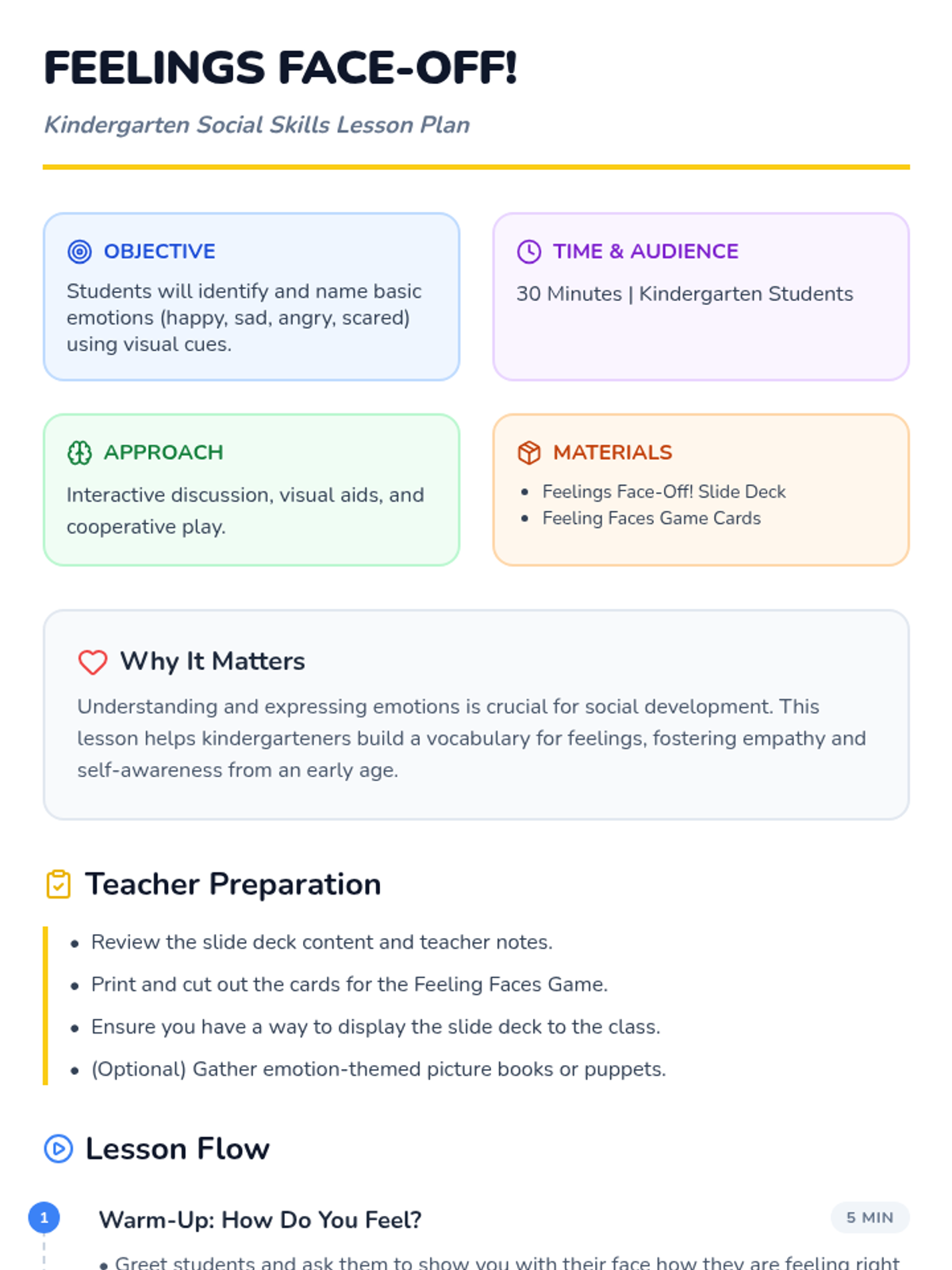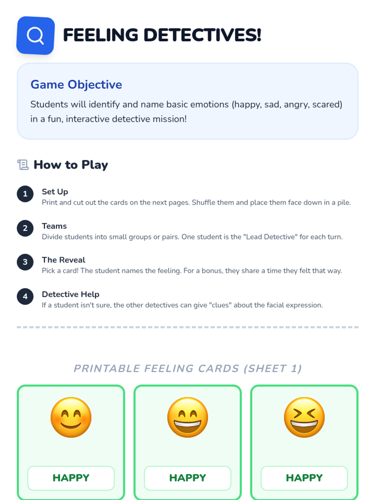 A 30-minute kindergarten social skills lesson designed to help students identify and name basic emotions through interactive discussion, visual aids, and a cooperative 'Feeling Detective' game.