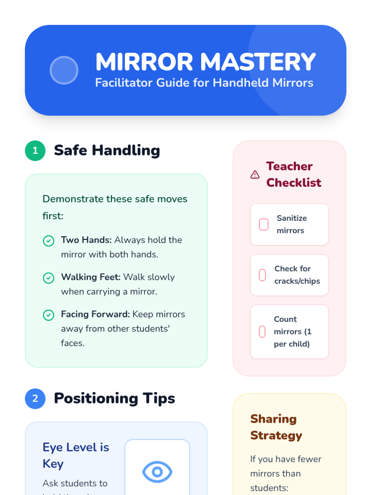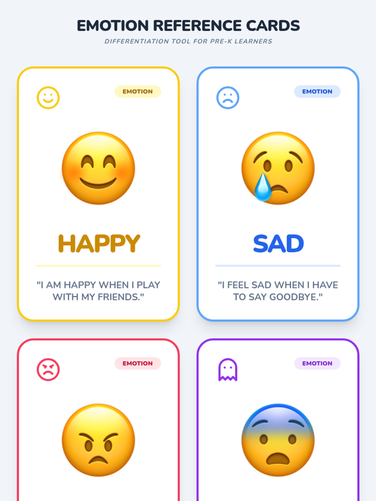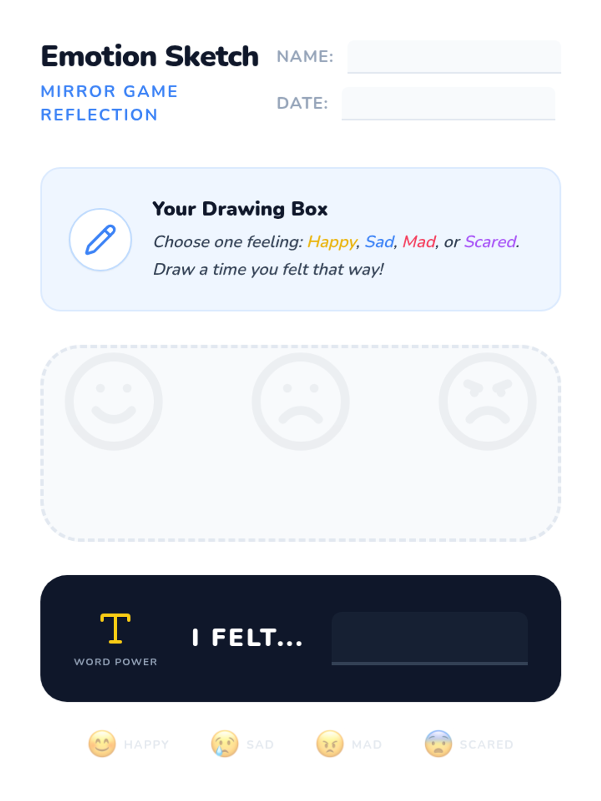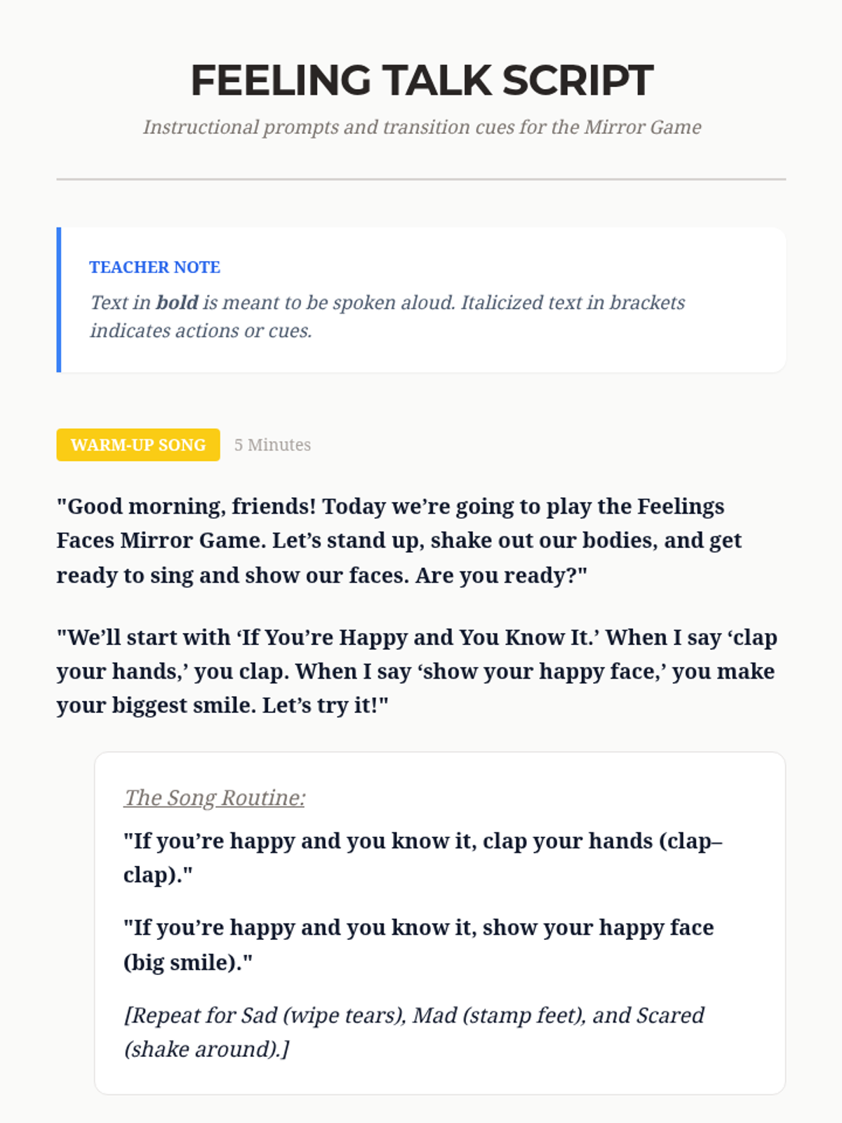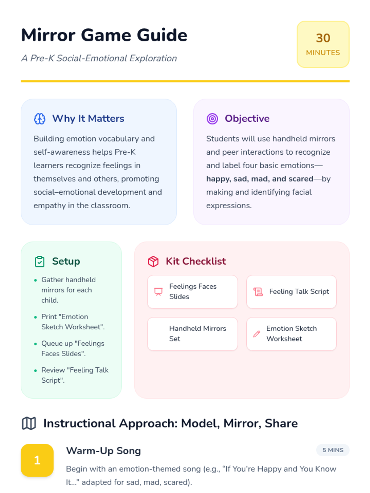 A playful 30-minute Pre-K lesson where students explore happy, sad, mad, and scared emotions using mirrors and peer interaction to build self-awareness and social skills.