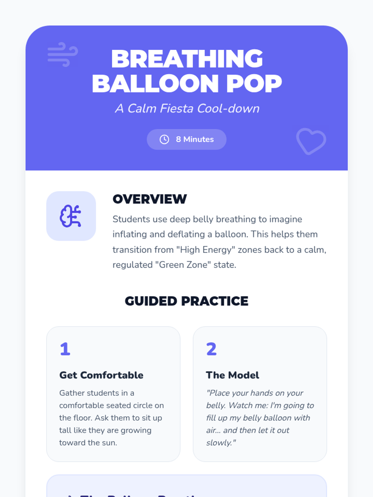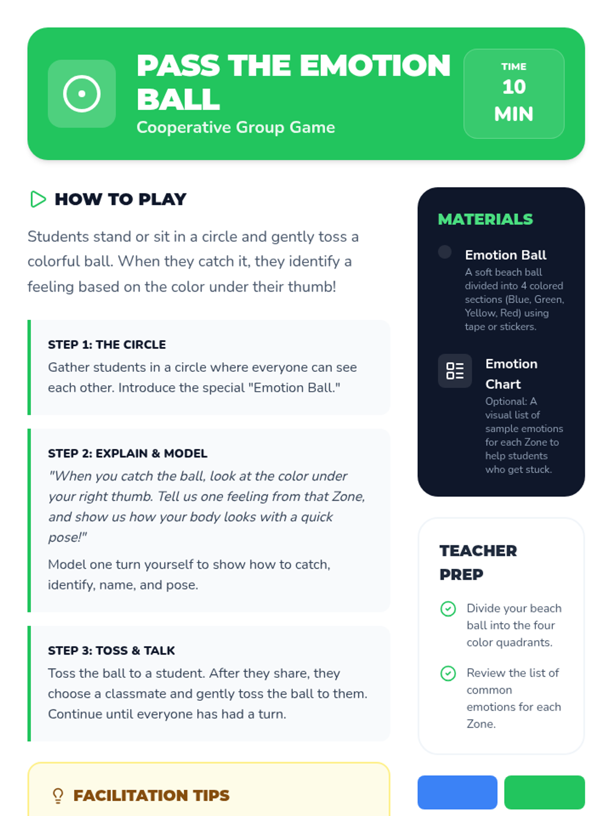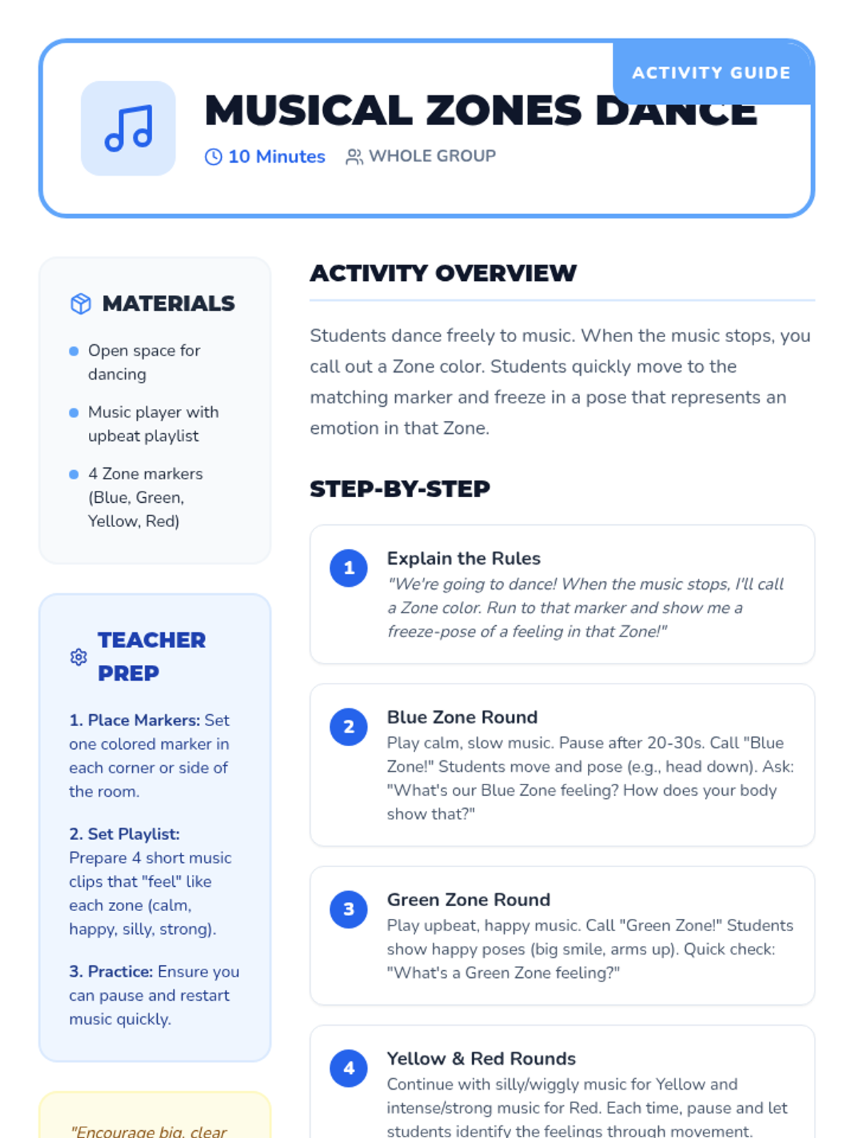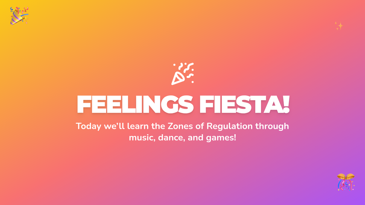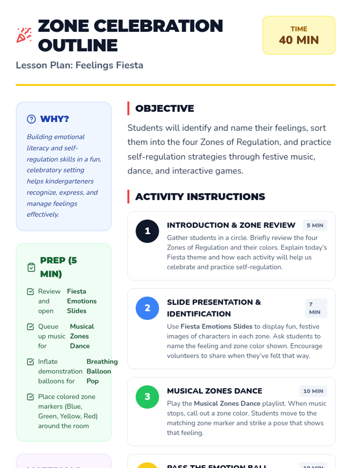 A festive 40-minute Tier 1 kindergarten lesson that teaches the Zones of Regulation through high-energy music, dance, and interactive games, concluding with a calming breathing exercise.