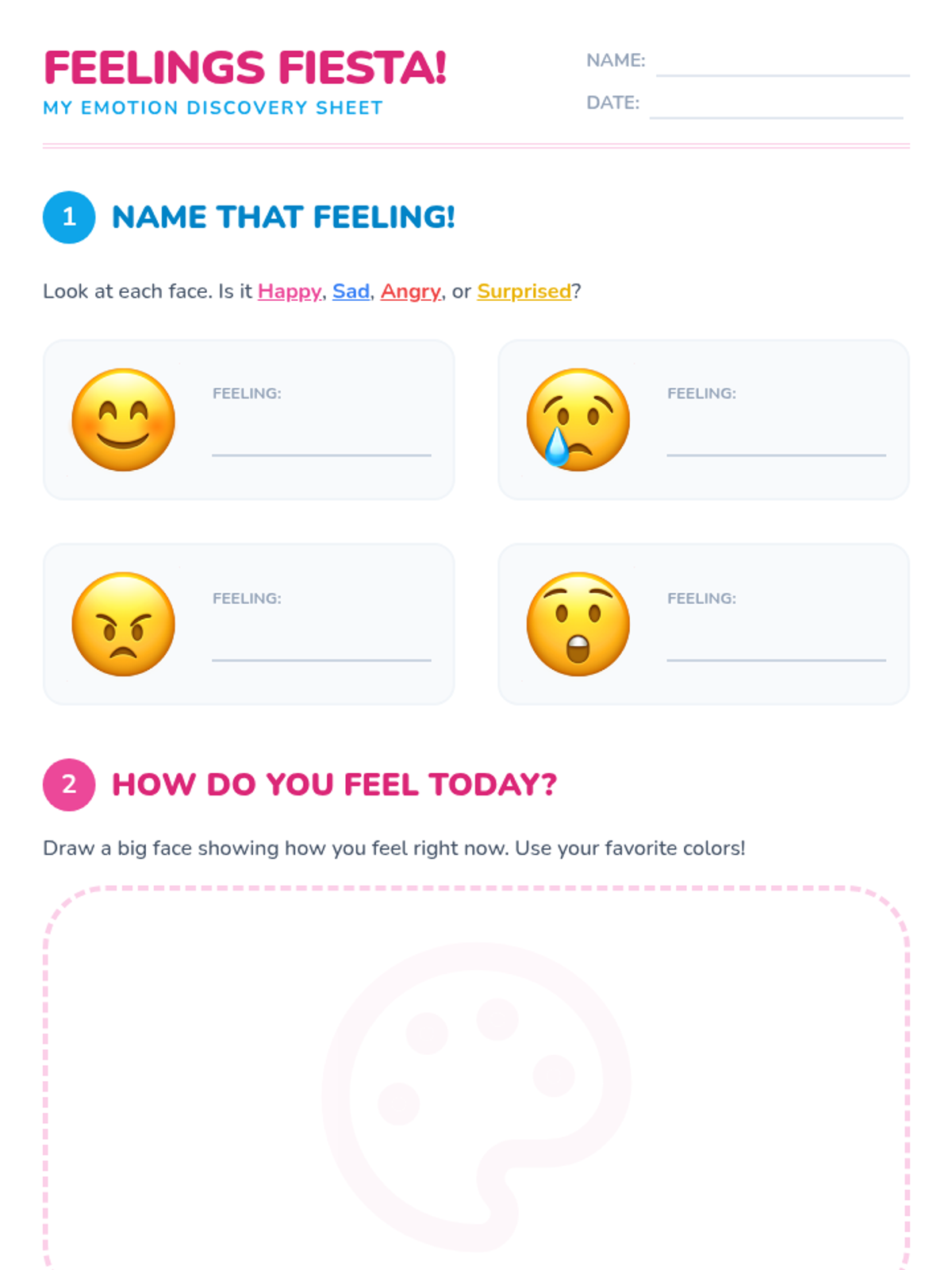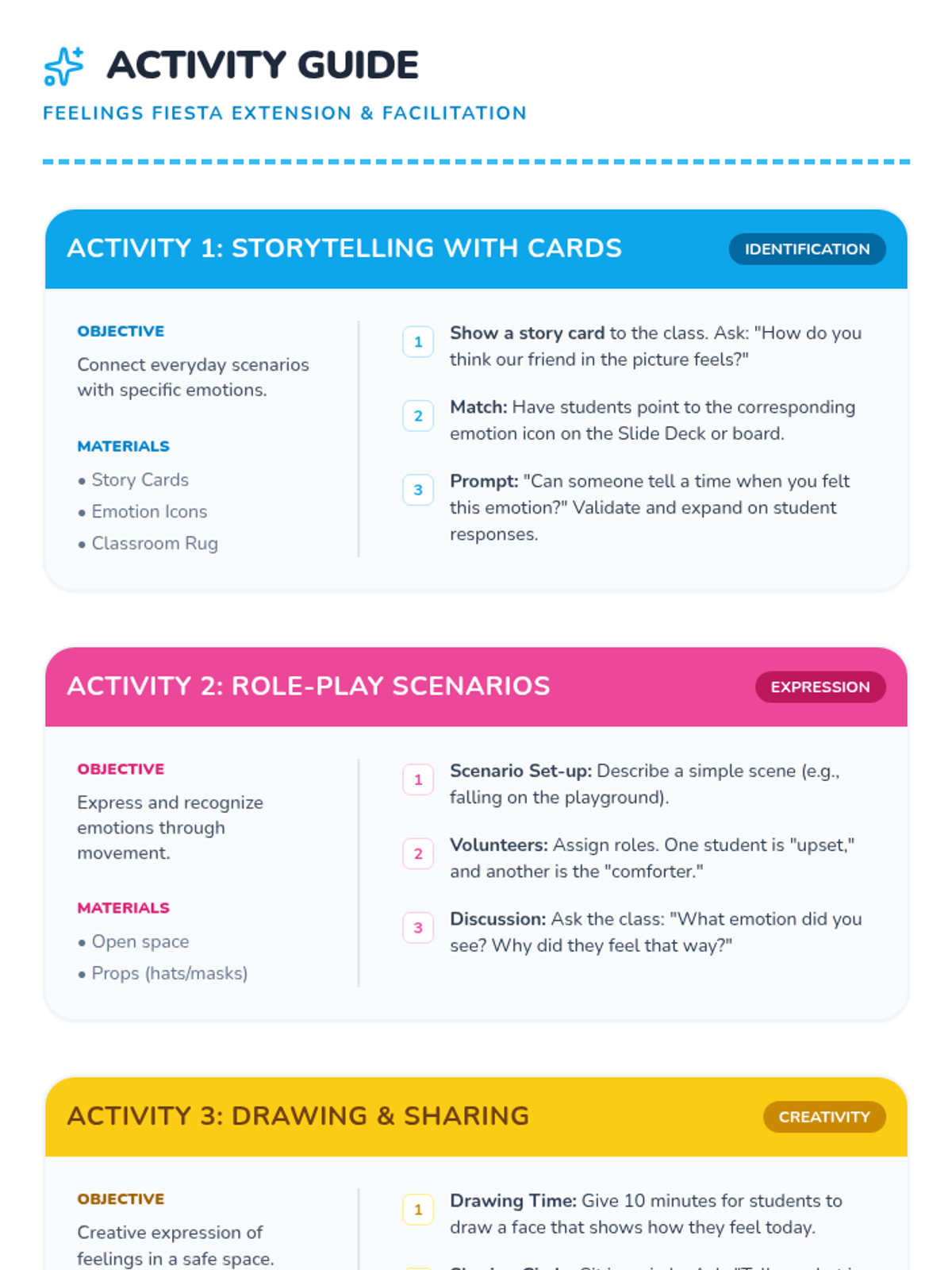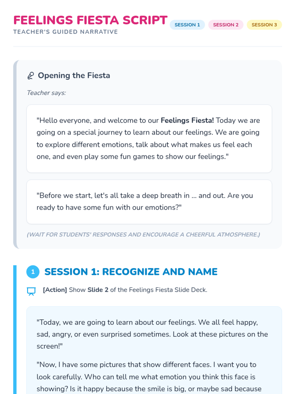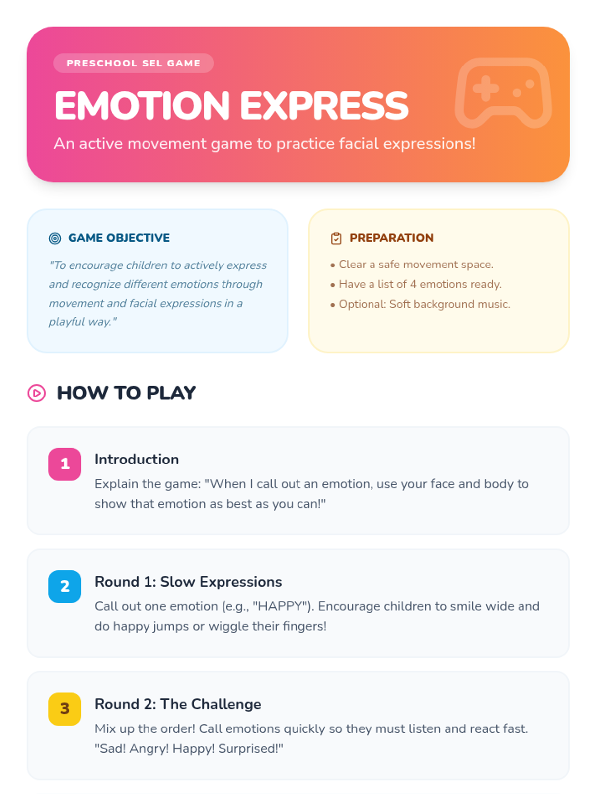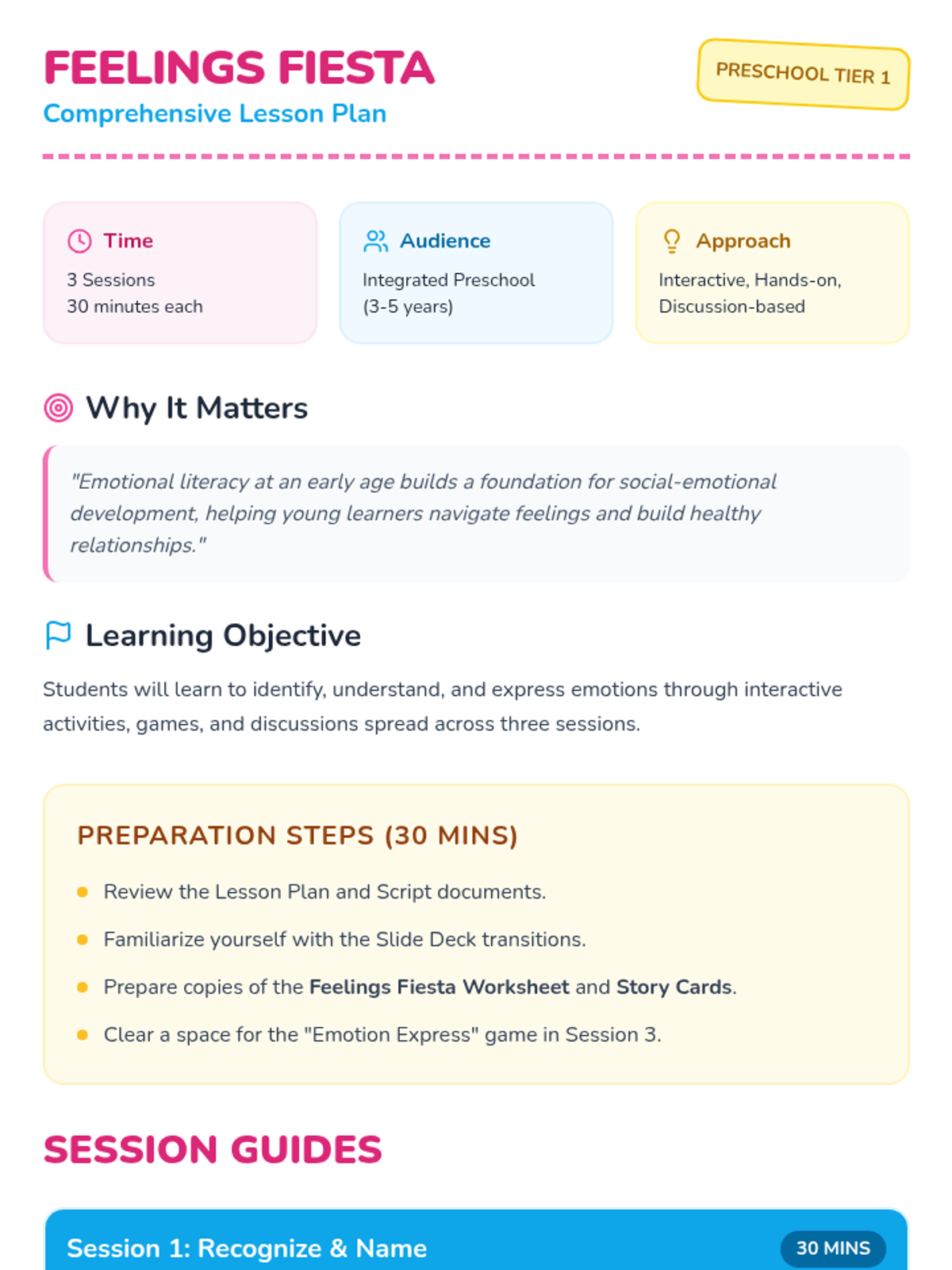 A 3-session social-emotional learning unit for preschool students to recognize, understand, and express their emotions through interactive games, stories, and creative activities.