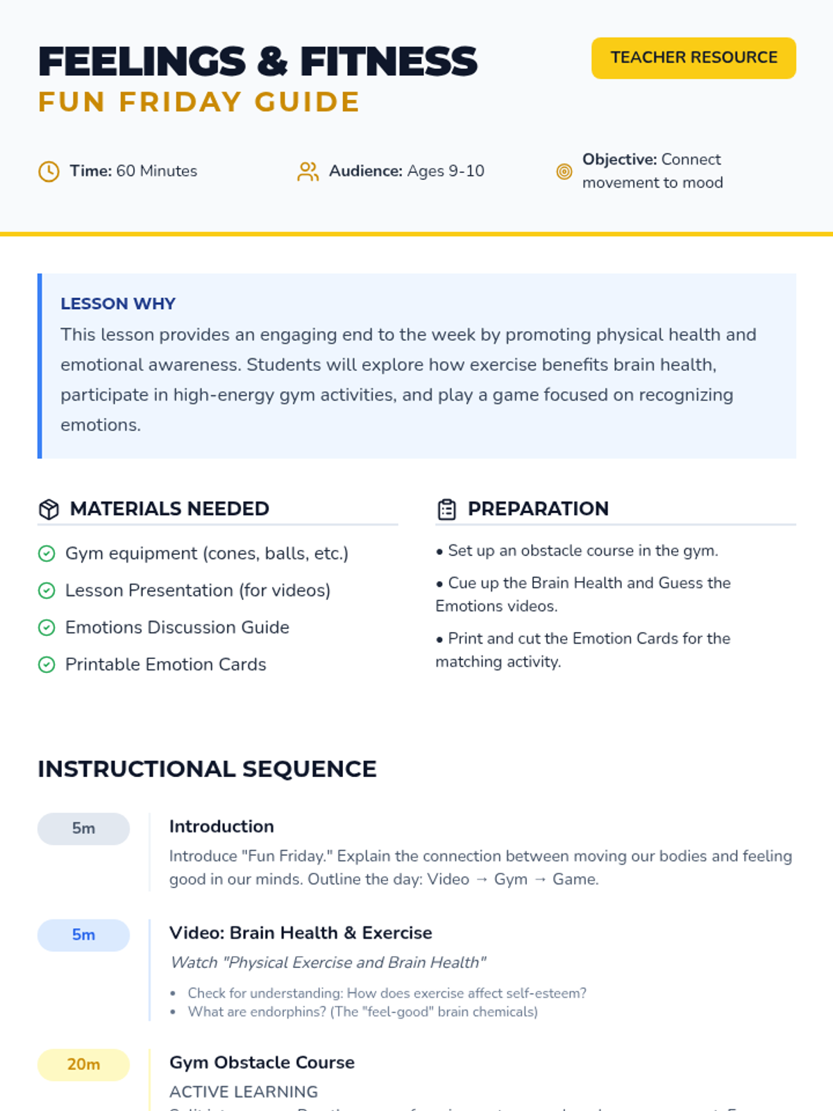 A high-energy, engaging lesson that combines physical activity with emotional intelligence training, helping students understand the vital link between a healthy body and a healthy mind.