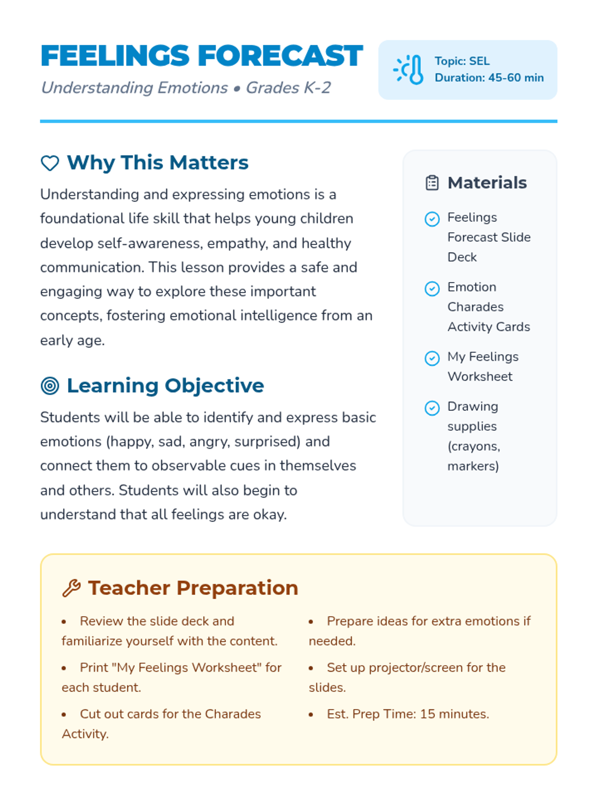 A social-emotional learning lesson for grades K-2 that uses a weather-forecasting metaphor to help students identify, express, and normalize basic emotions like happiness, sadness, anger, and surprise.