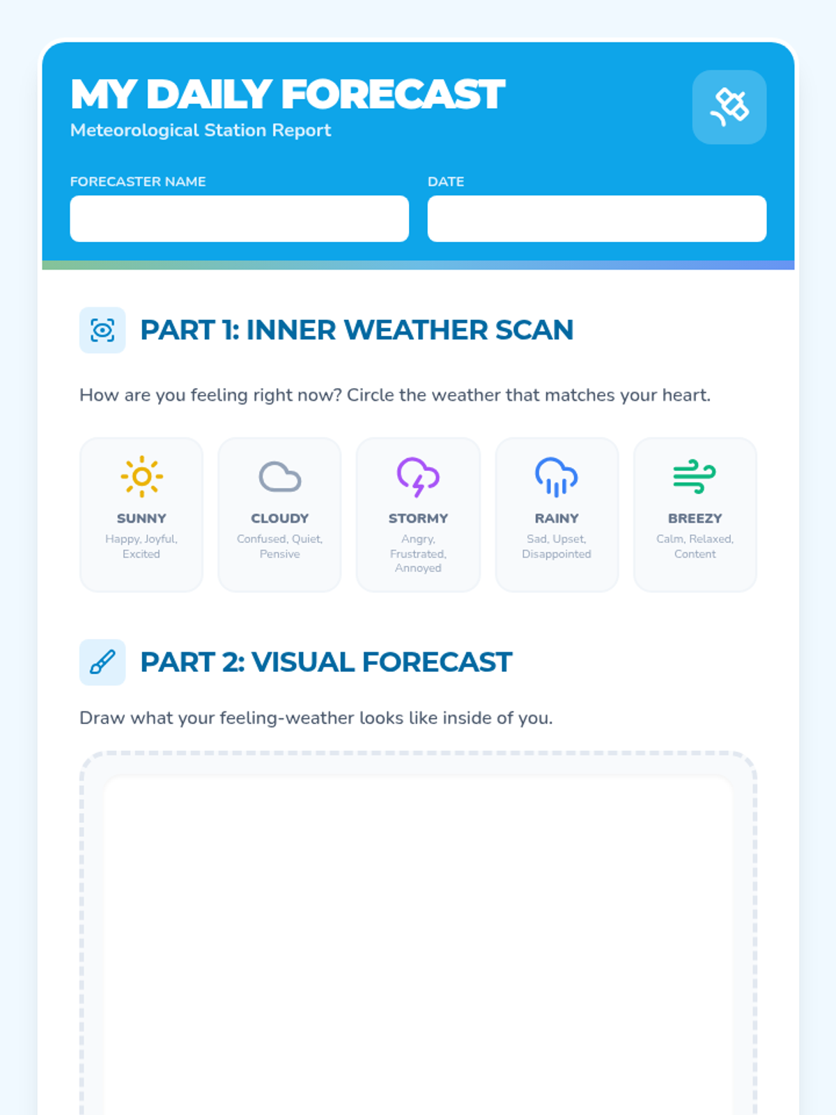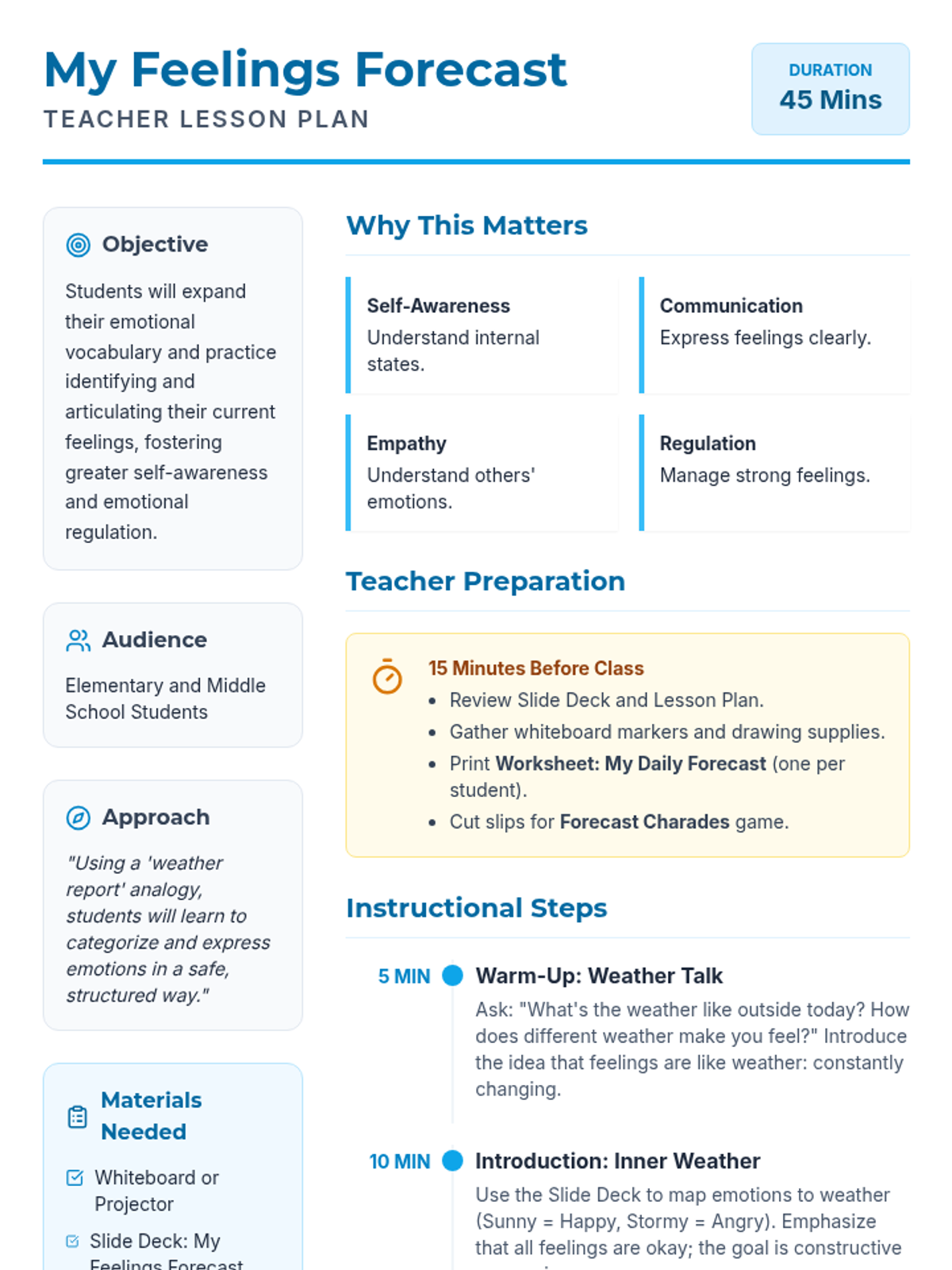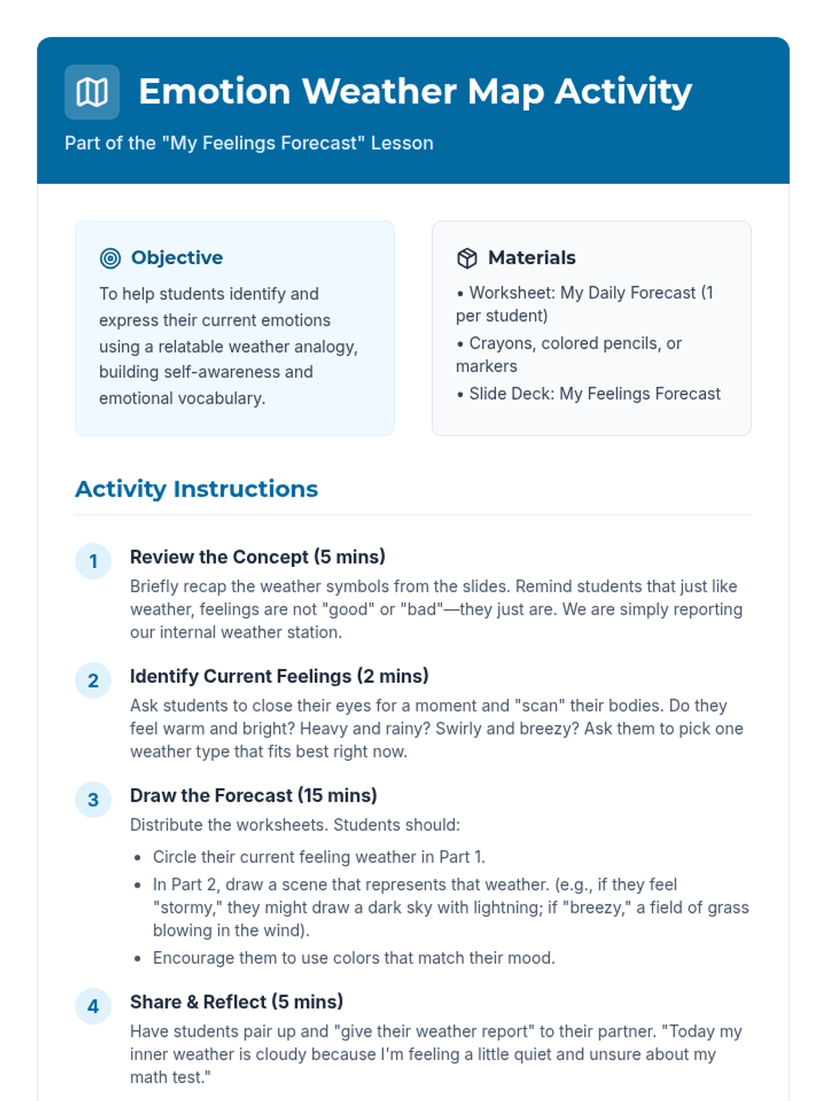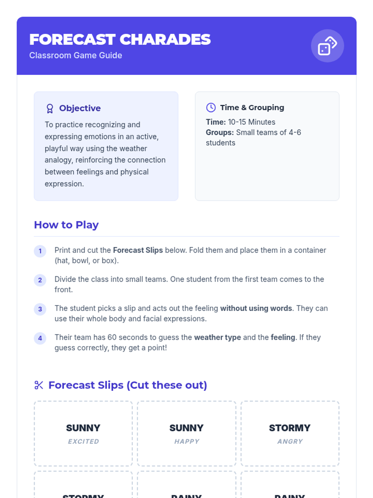 A 45-minute social-emotional learning lesson that uses a weather analogy to help students identify, categorize, and express their emotions. Students will build emotional vocabulary and self-awareness through creative drawing and active play.