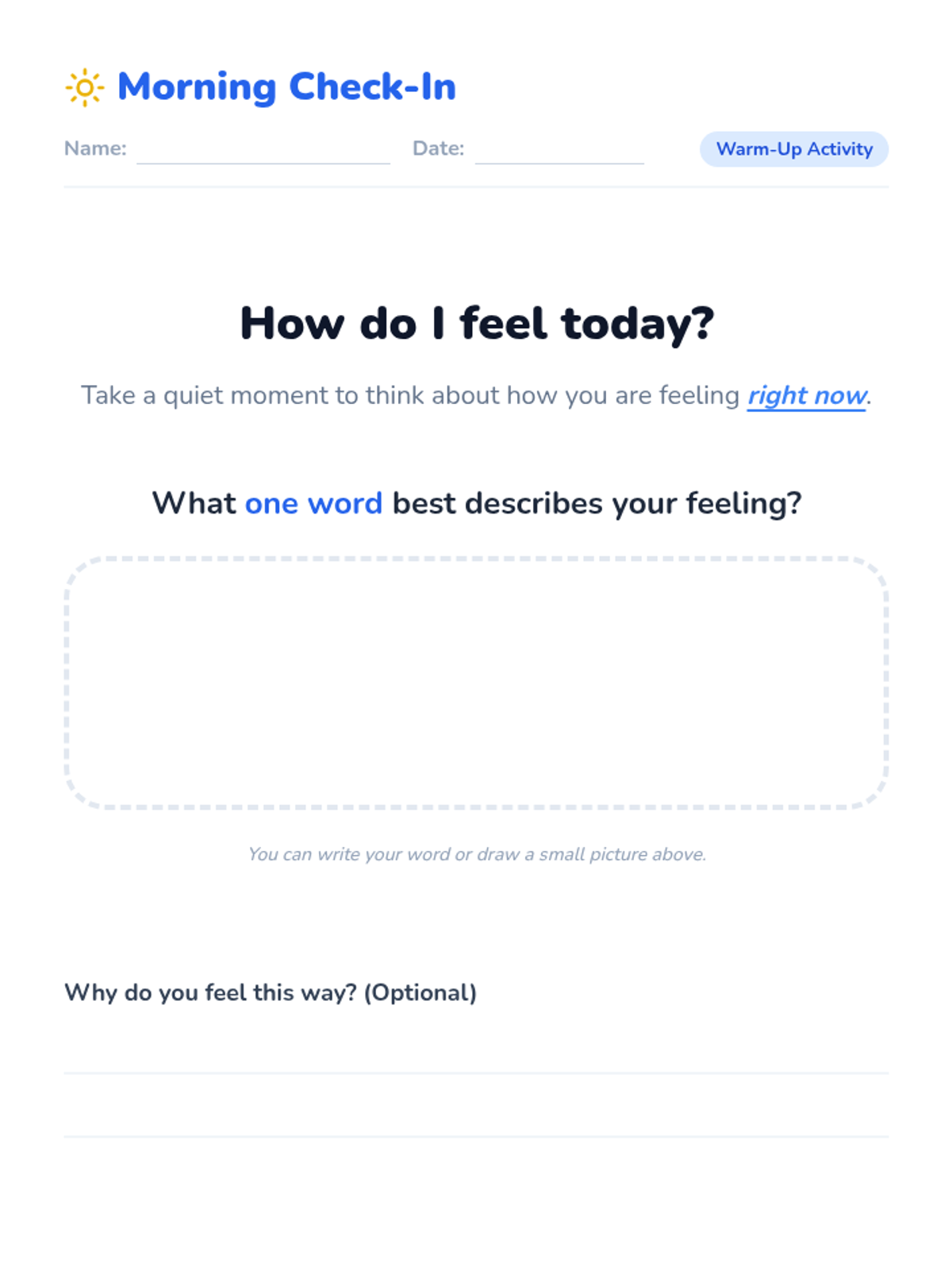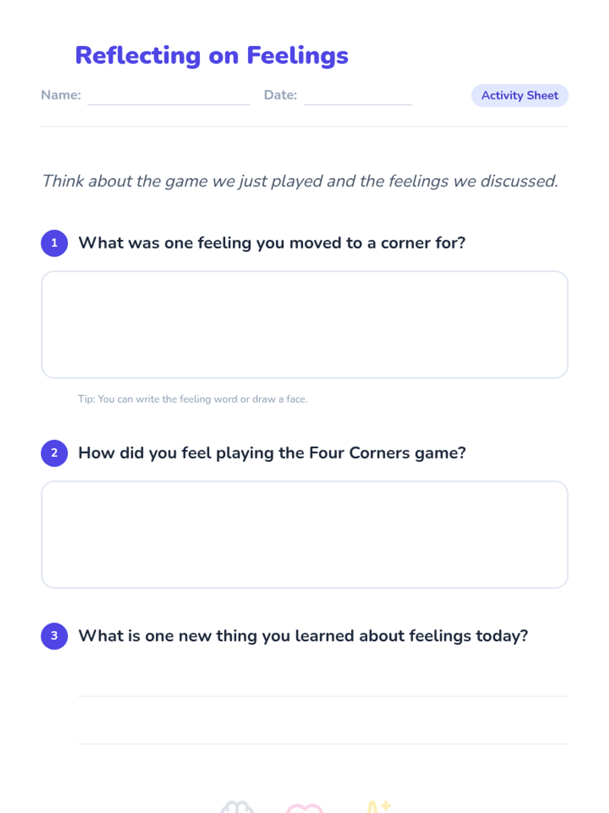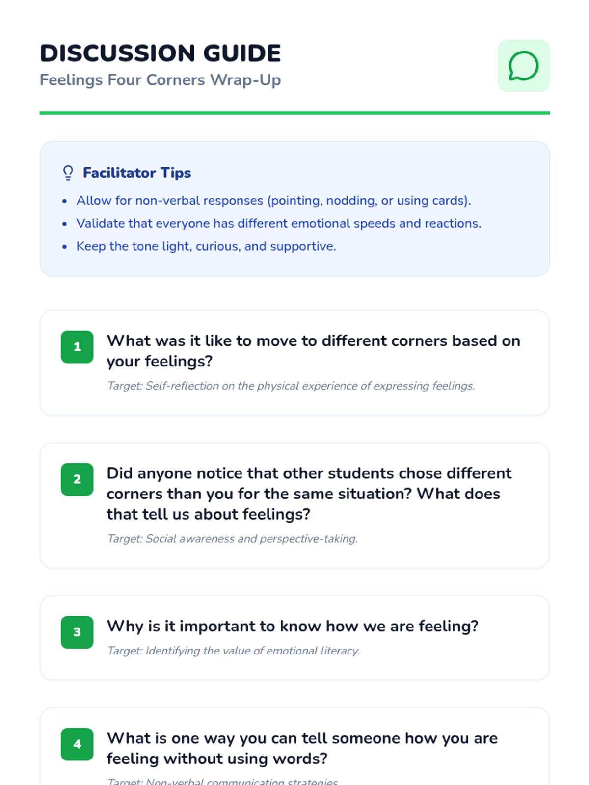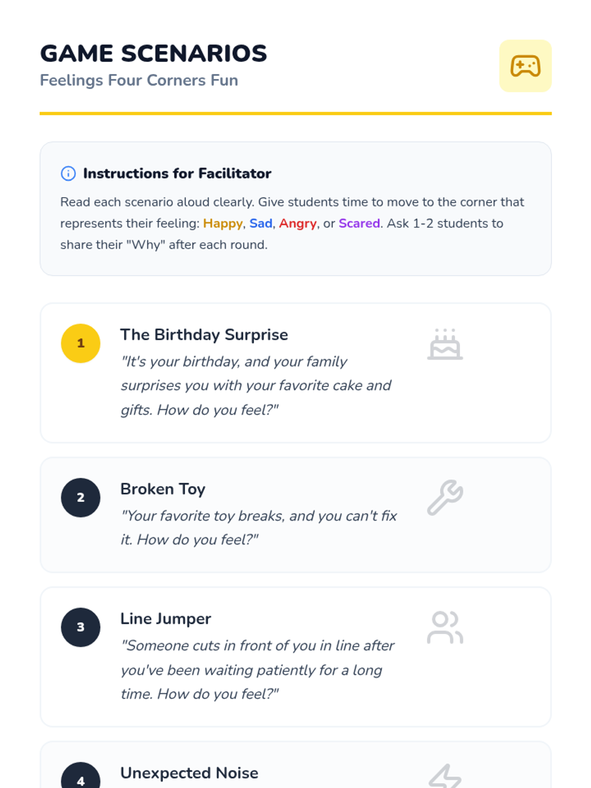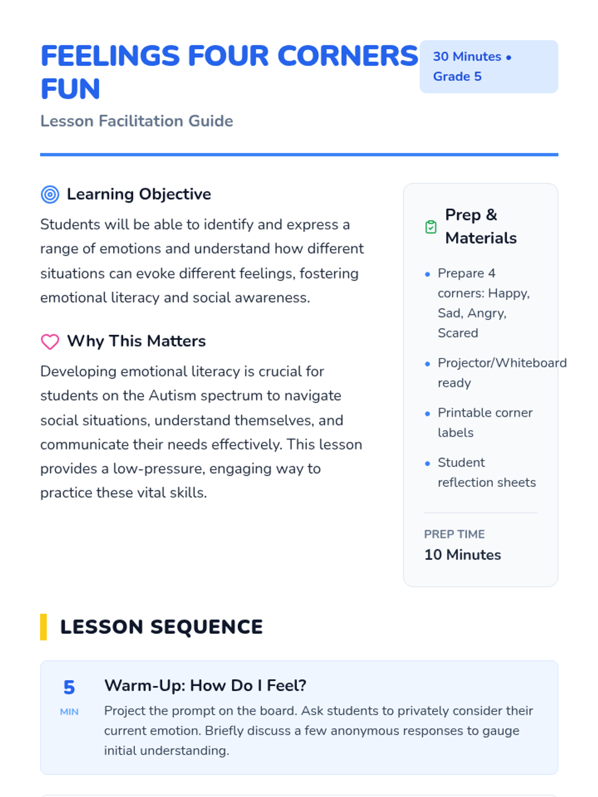 A 30-minute interactive lesson for 5th-grade students on the Autism spectrum to explore and express emotions through the game 'Four Corners'. Students learn to identify feelings, understand that everyone reacts differently, and practice self-awareness.