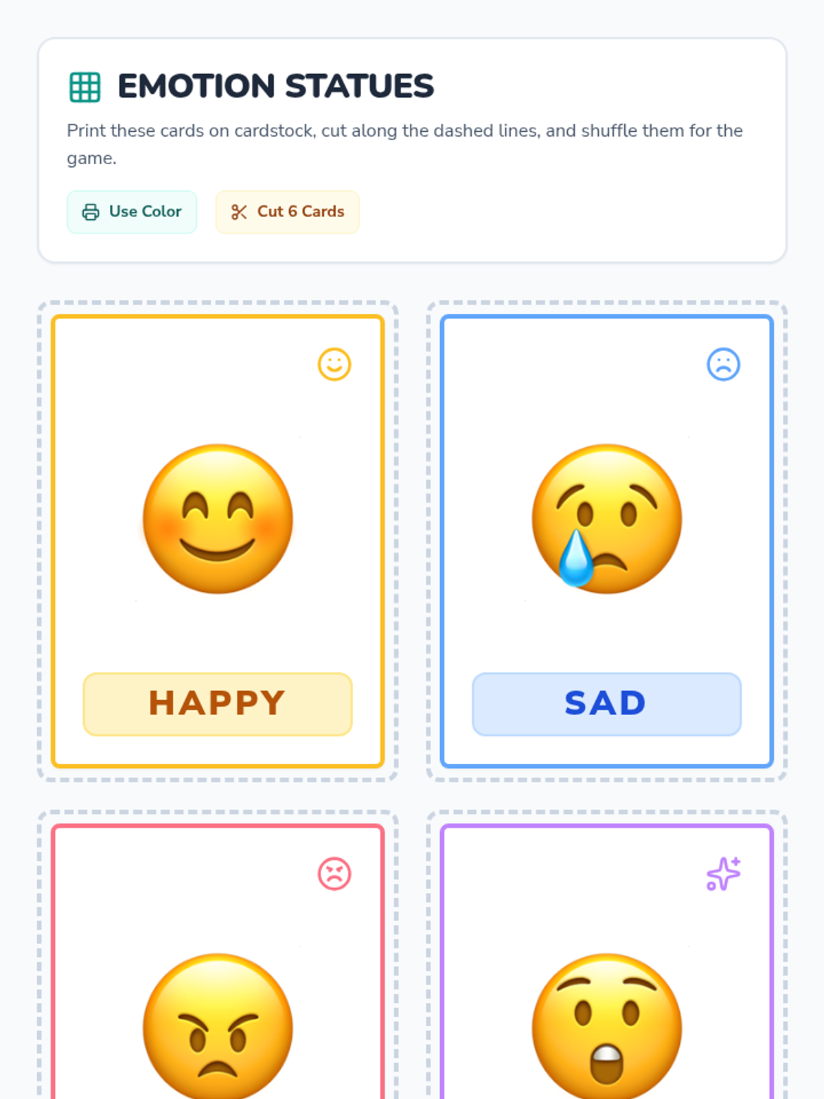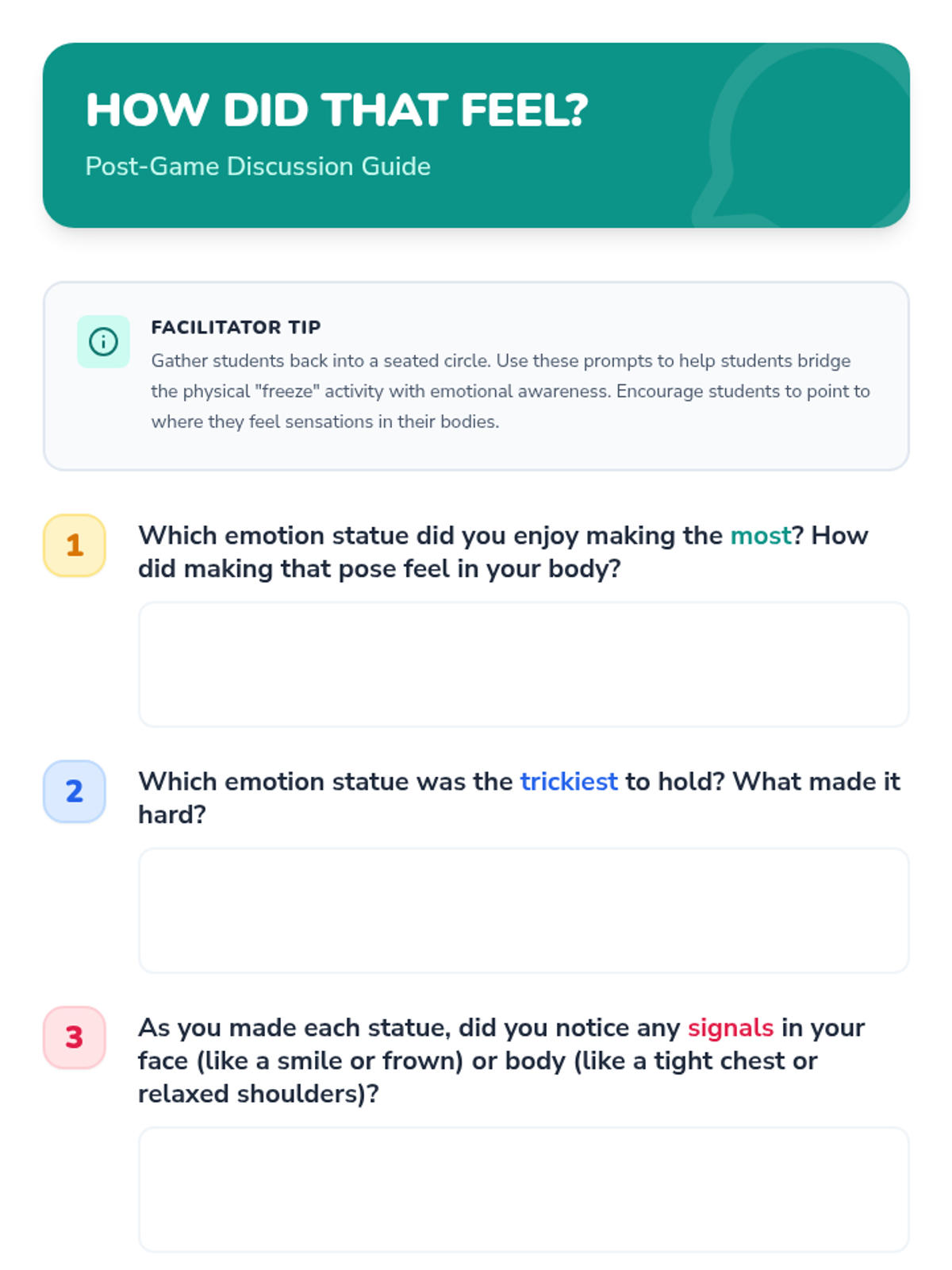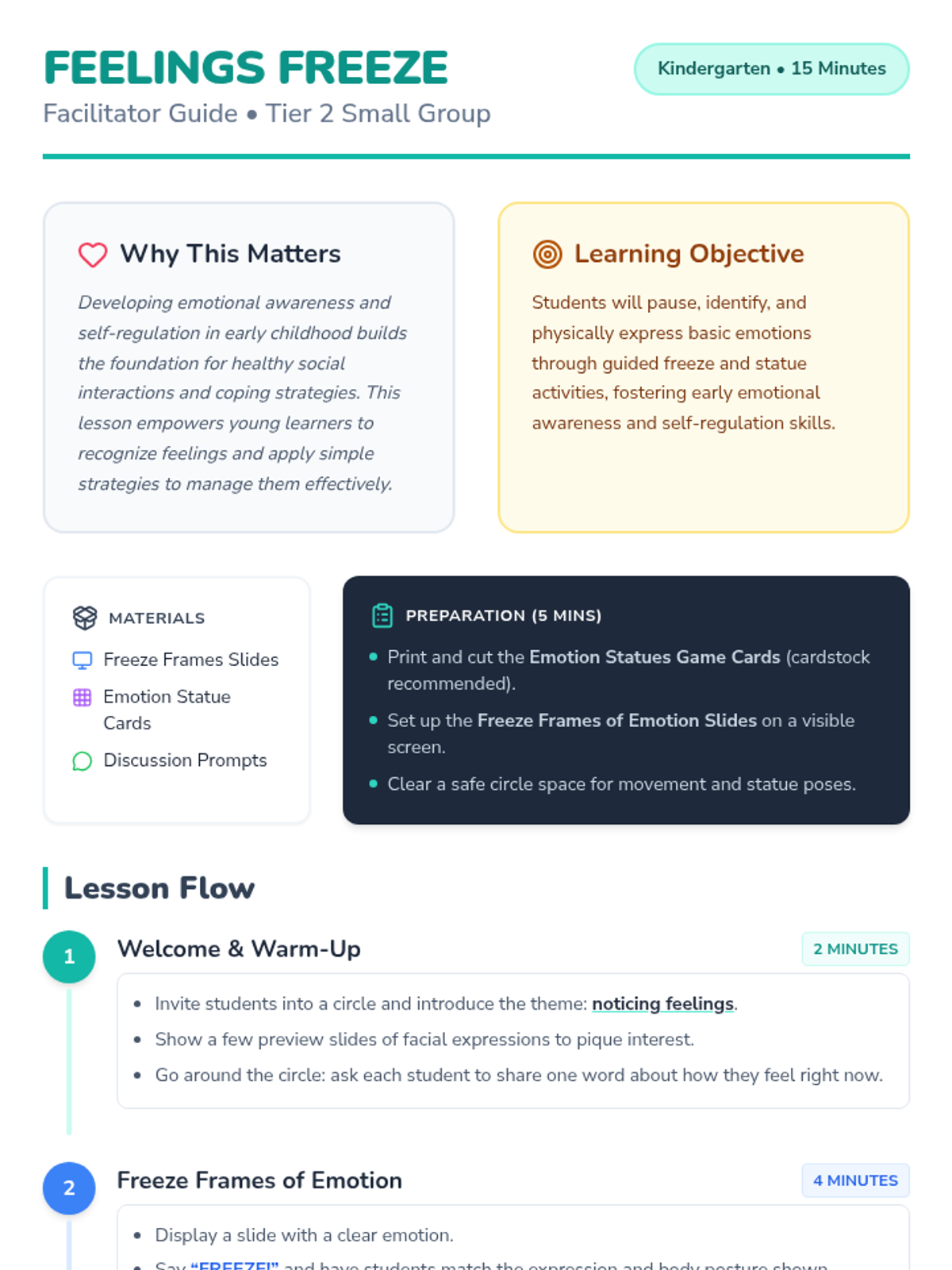 A 15-minute Tier 2 small-group counseling activity for kindergarteners focused on recognizing and physically expressing emotions through interactive freeze games. Students learn to identify body signals and practice self-regulation skills in a fun, supportive environment.