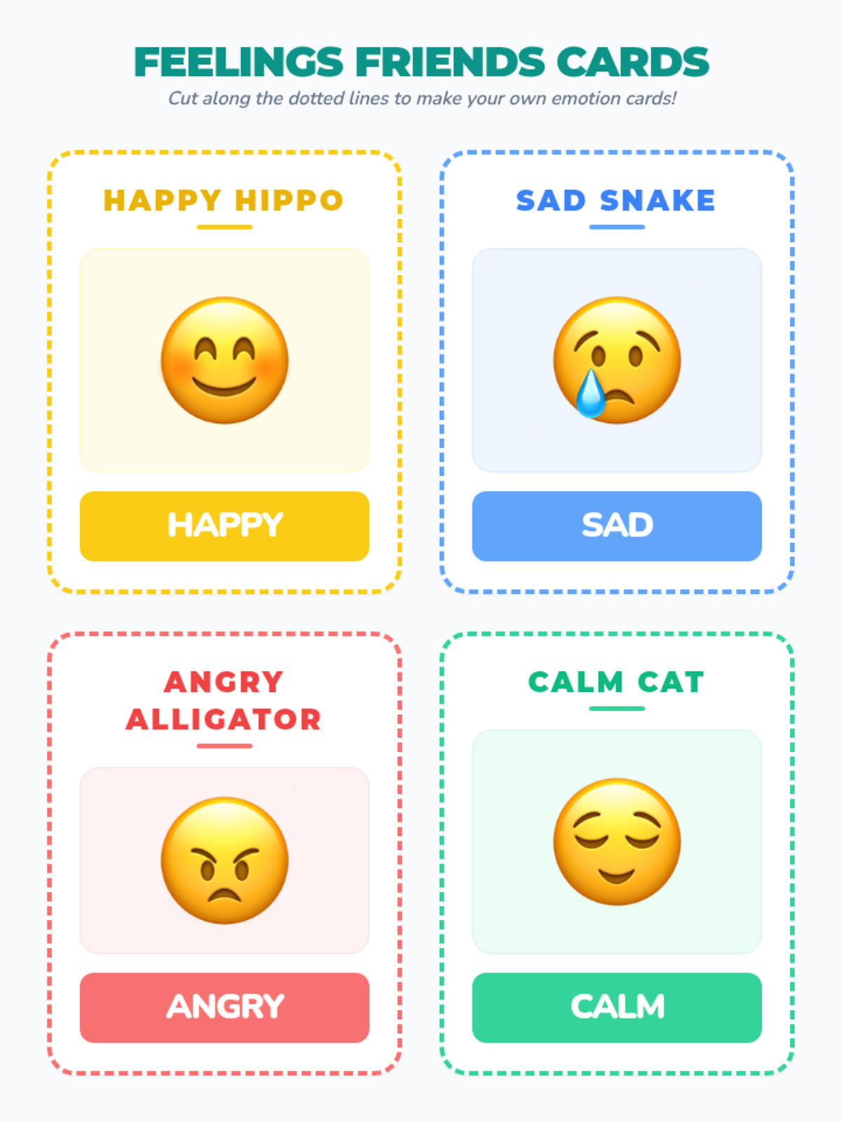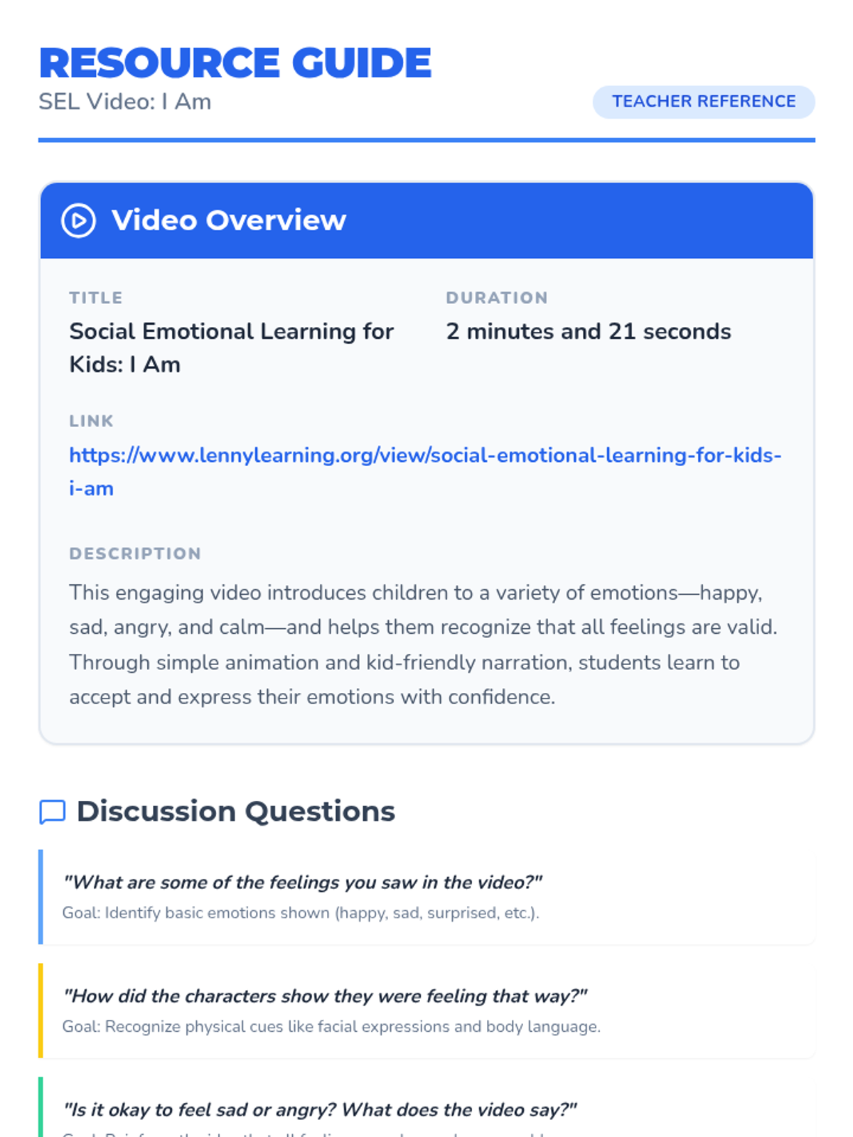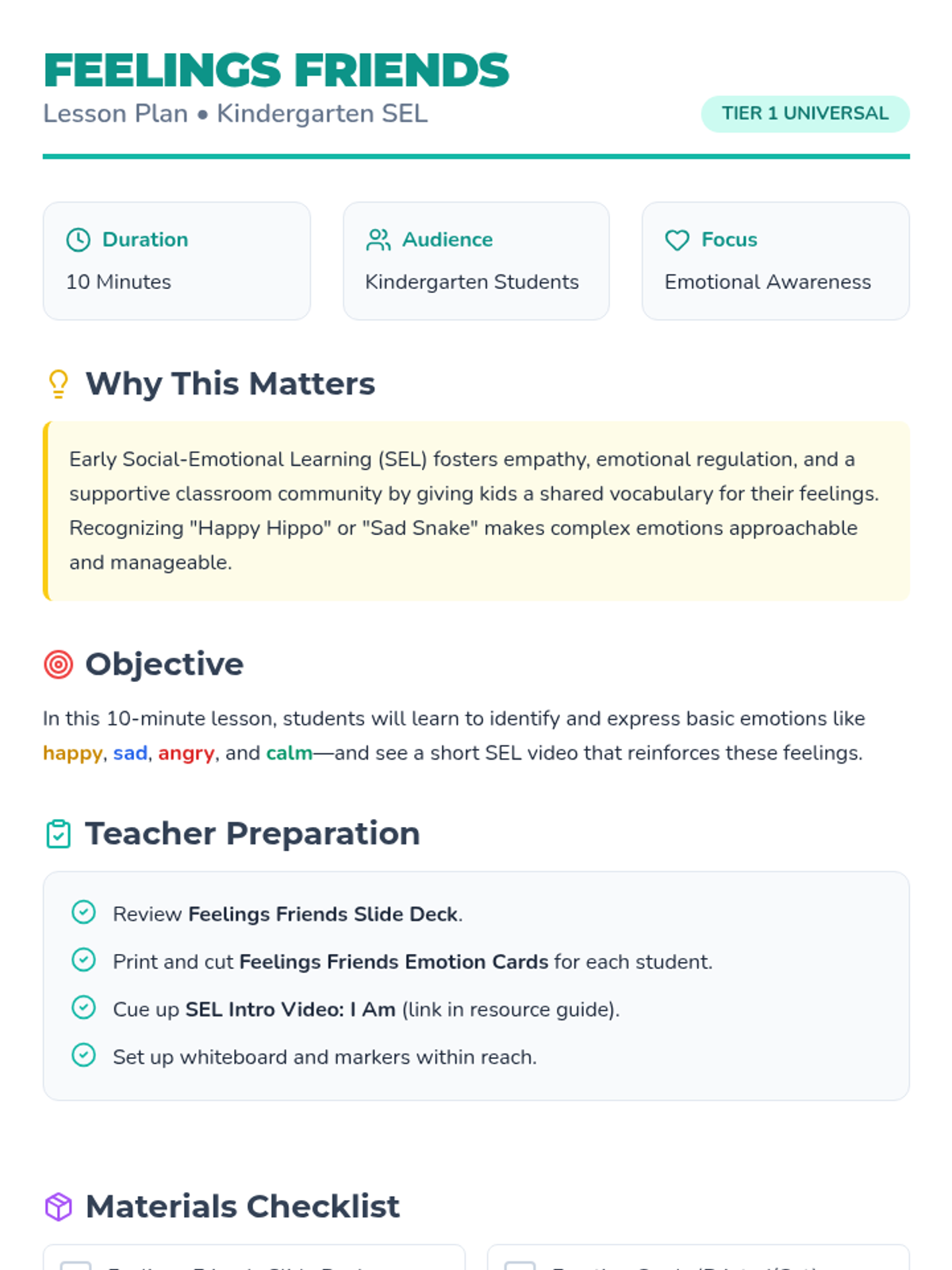A 10-minute kindergarten lesson introducing basic emotions (happy, sad, angry, and calm) through the 'Feelings Friends' characters, an SEL video, and interactive cards.