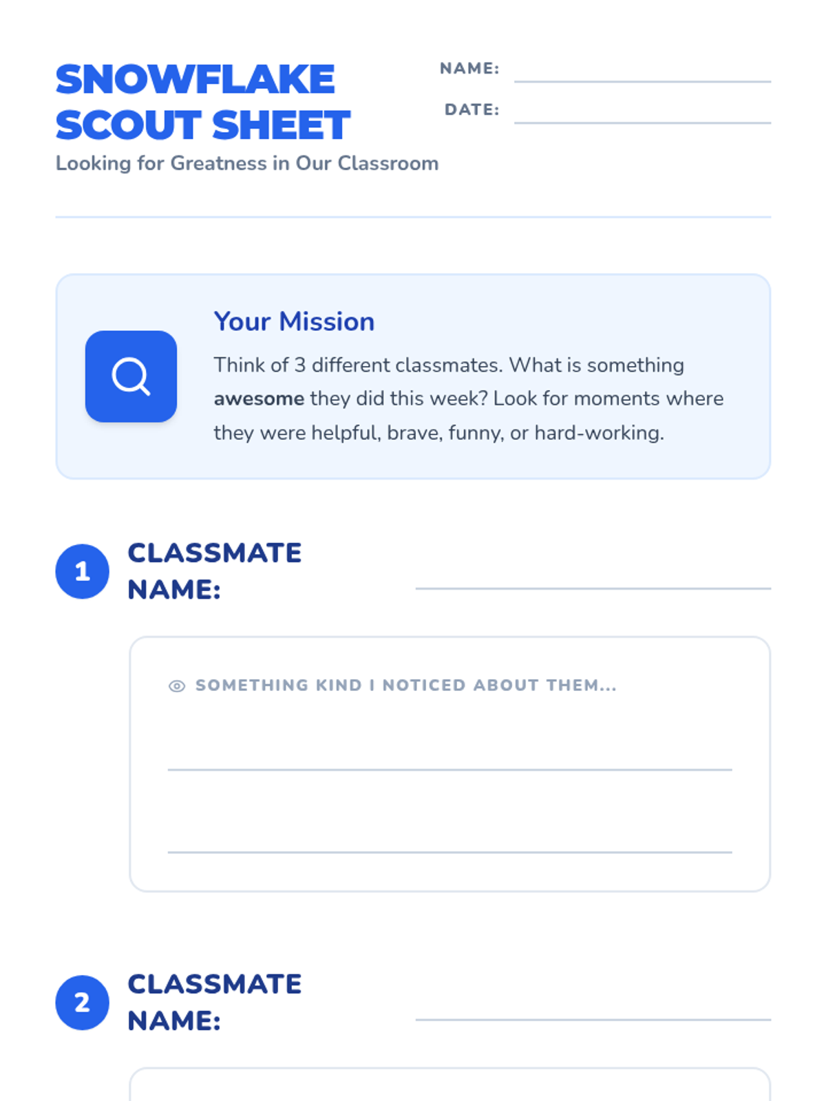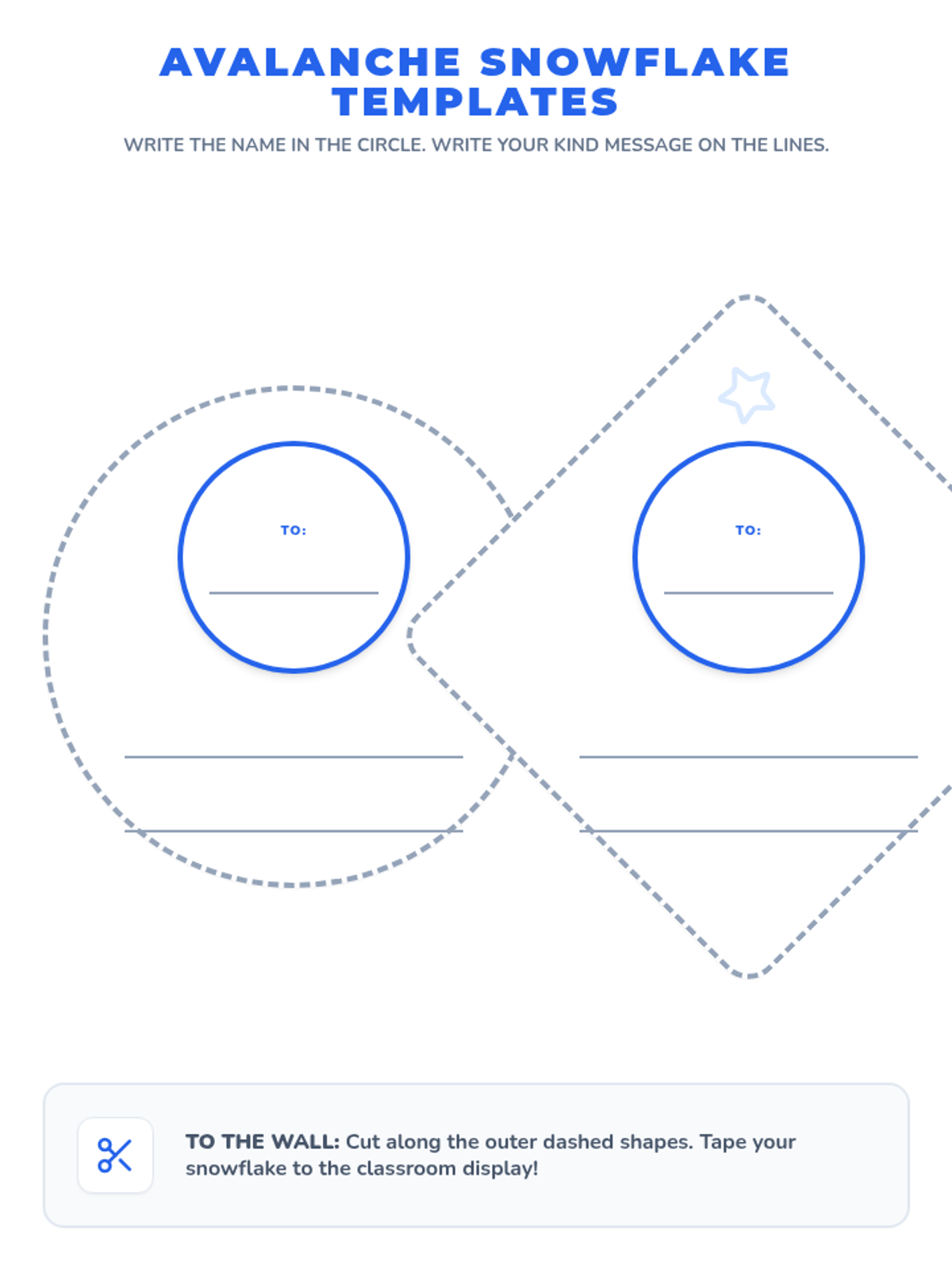 A community-building lesson where students transform positive peer observations into a visual 'avalanche' of paper snowflakes, reinforcing kindness during the high-energy spring season.