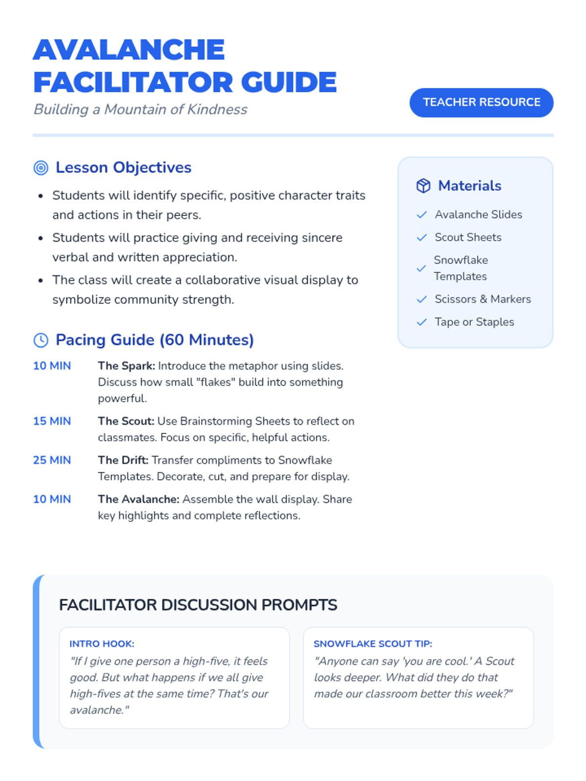 A community-building lesson where students create an 'Appreciation Avalanche' by writing kind observations on paper snowflakes to reinforce positive peer interactions.