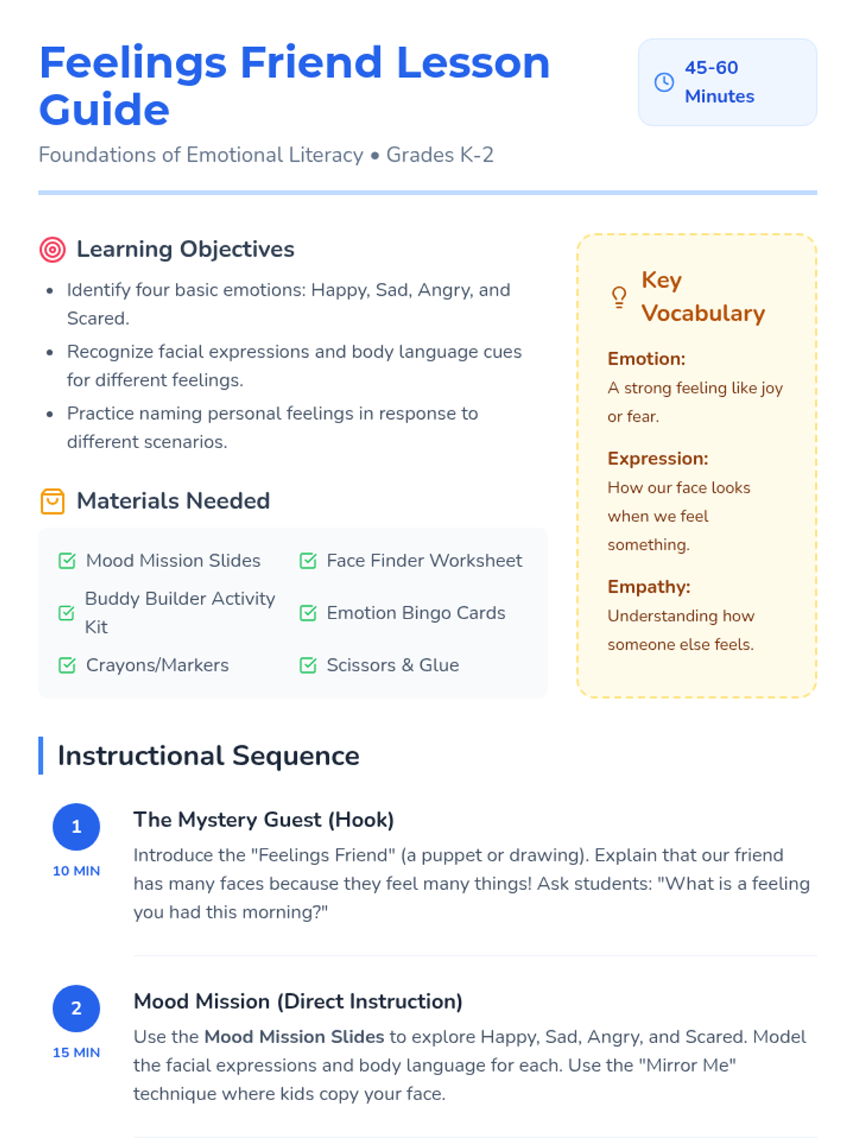 A foundational SEL lesson for K-2 students to identify, name, and express basic emotions through storytelling and creative activities.