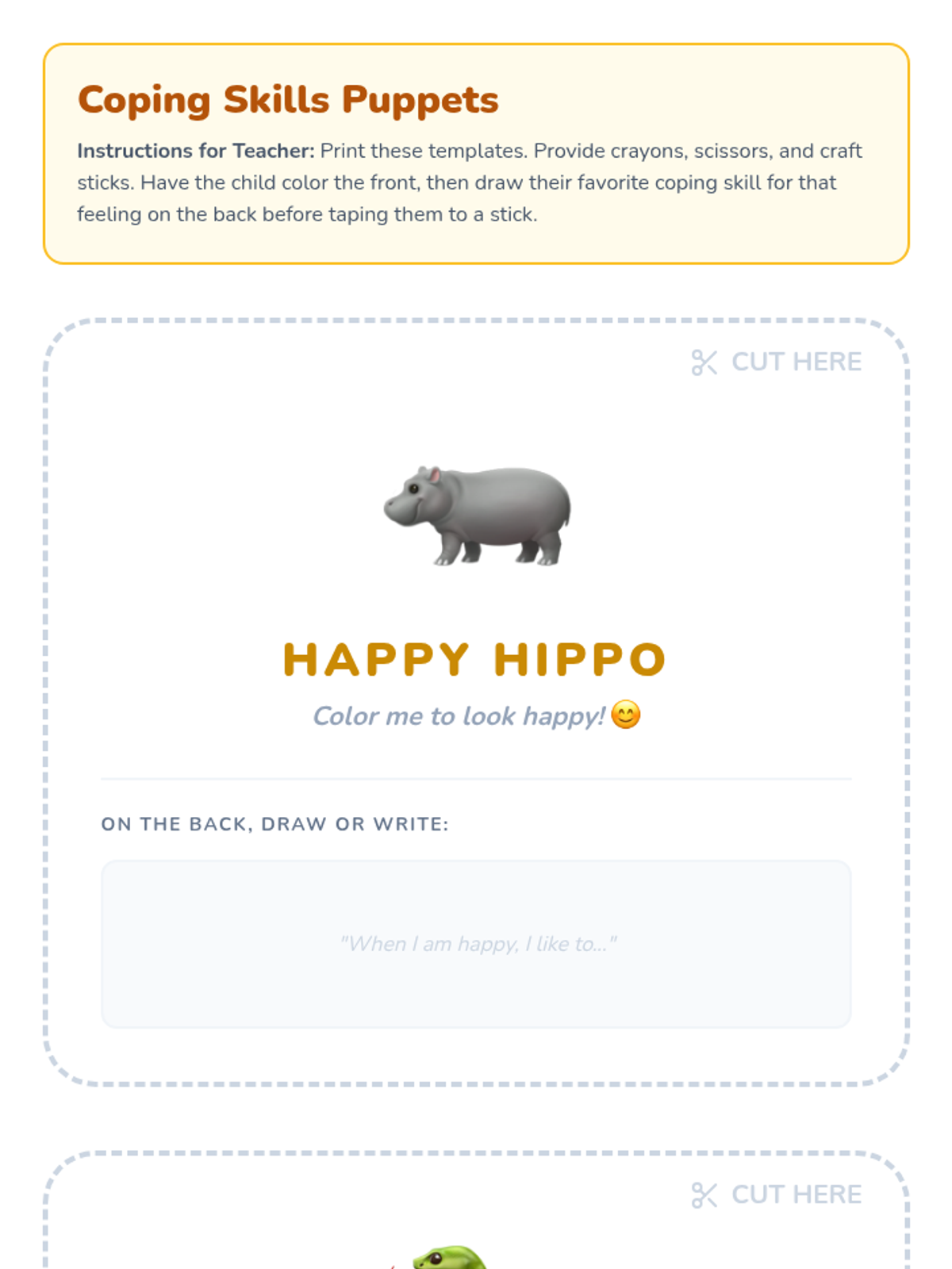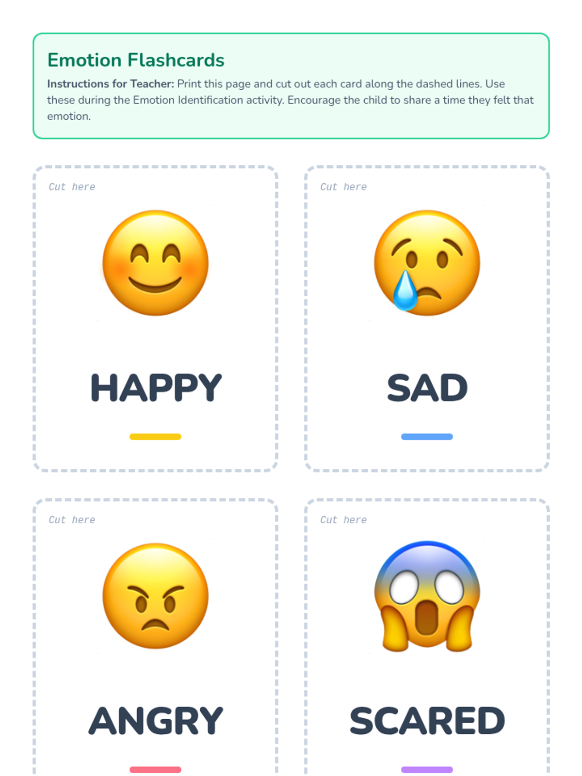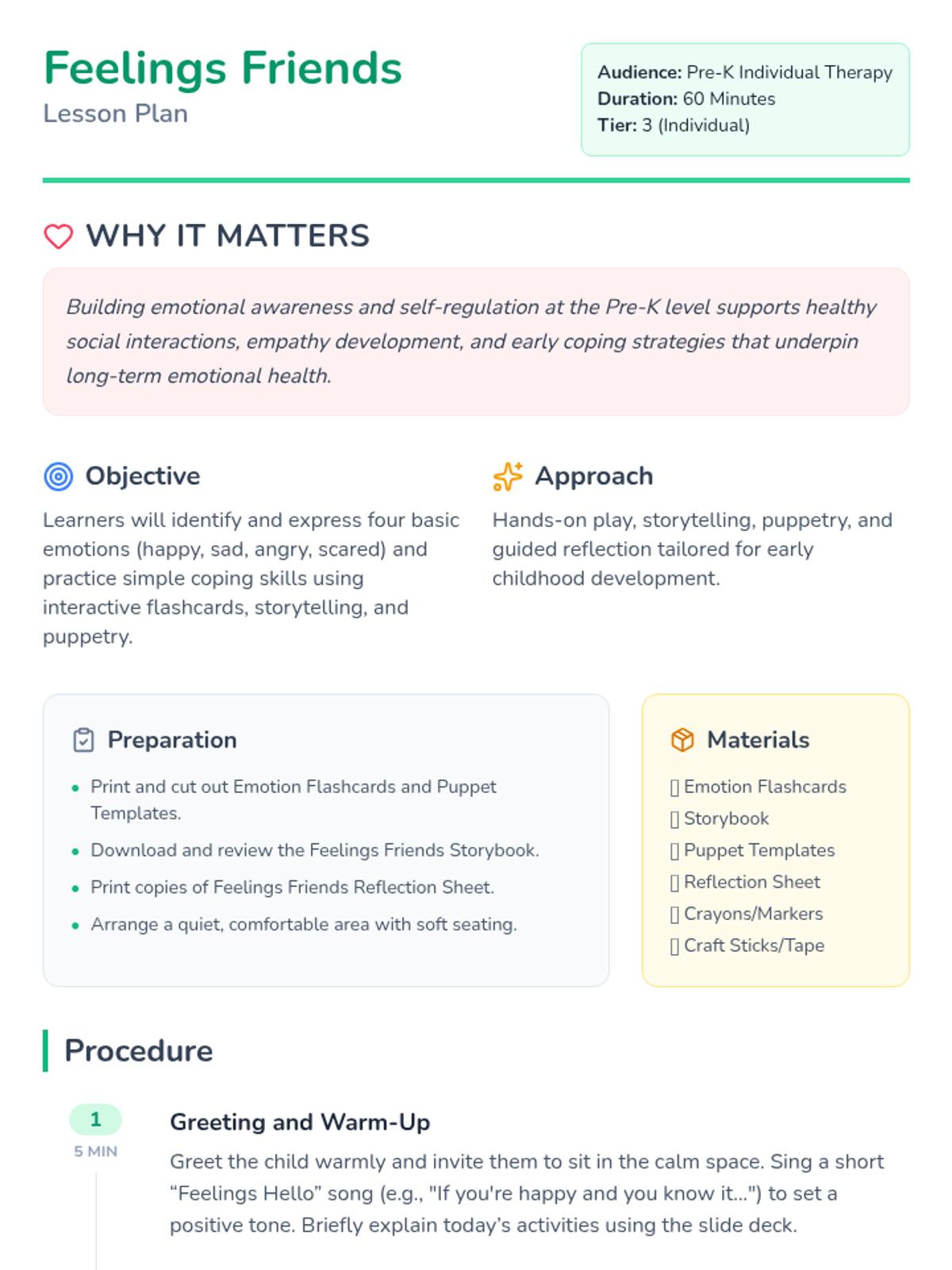 A 60-minute individual therapy session for Pre-K learners to identify four basic emotions and practice simple coping skills through storytelling, play, and reflection.