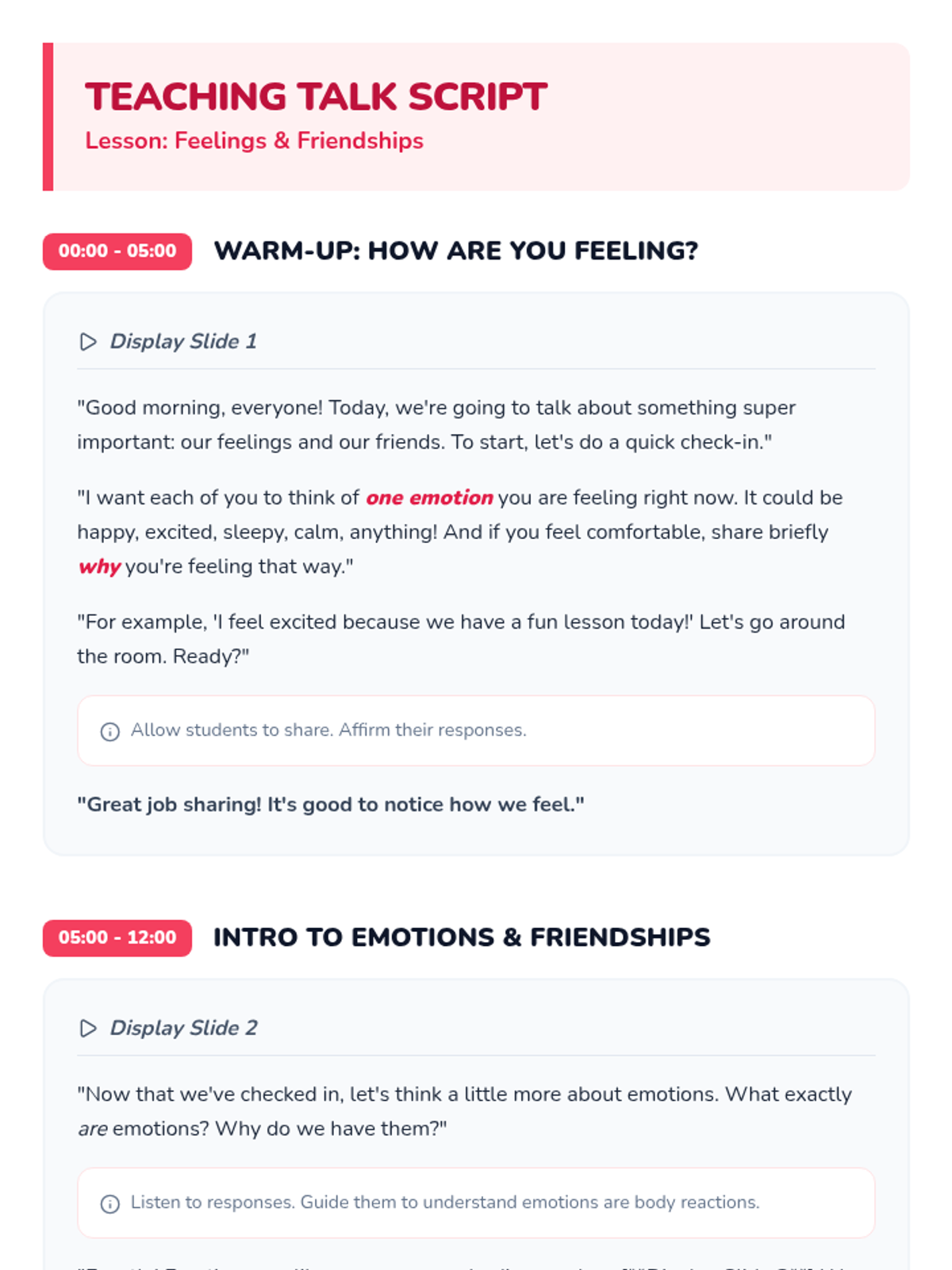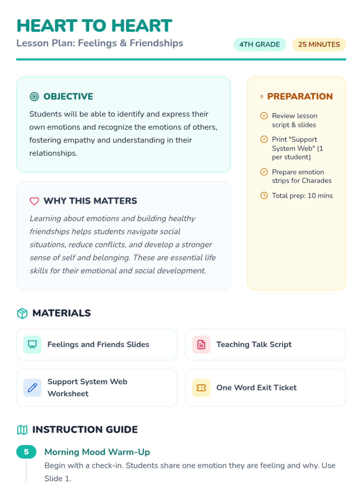 A 25-minute lesson for 4th graders focused on identifying emotions, practicing empathy, and understanding supportive friendships through interactive discussion and activities.