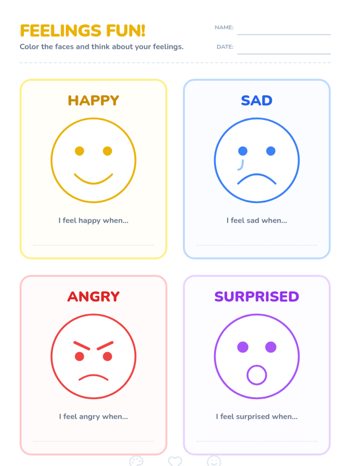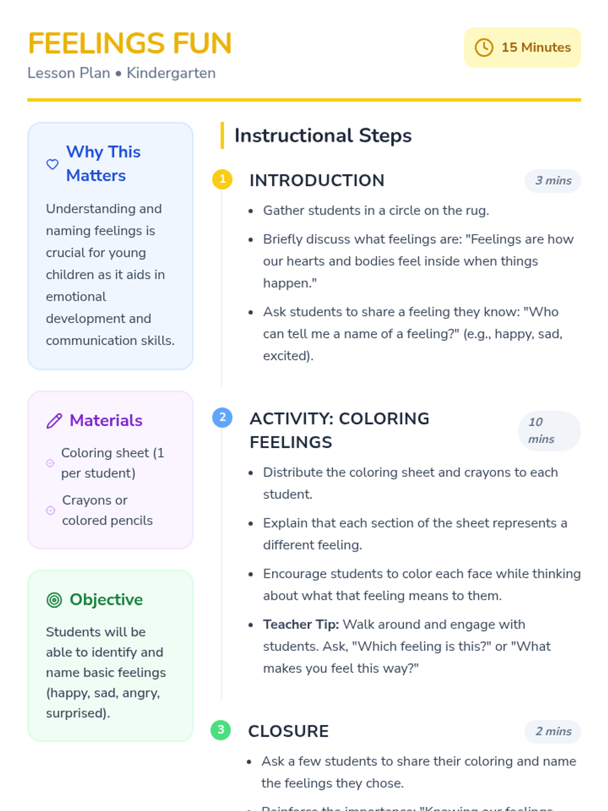 A 15-minute introductory lesson for kindergarteners to identify and name basic emotions through discussion and a creative coloring activity.