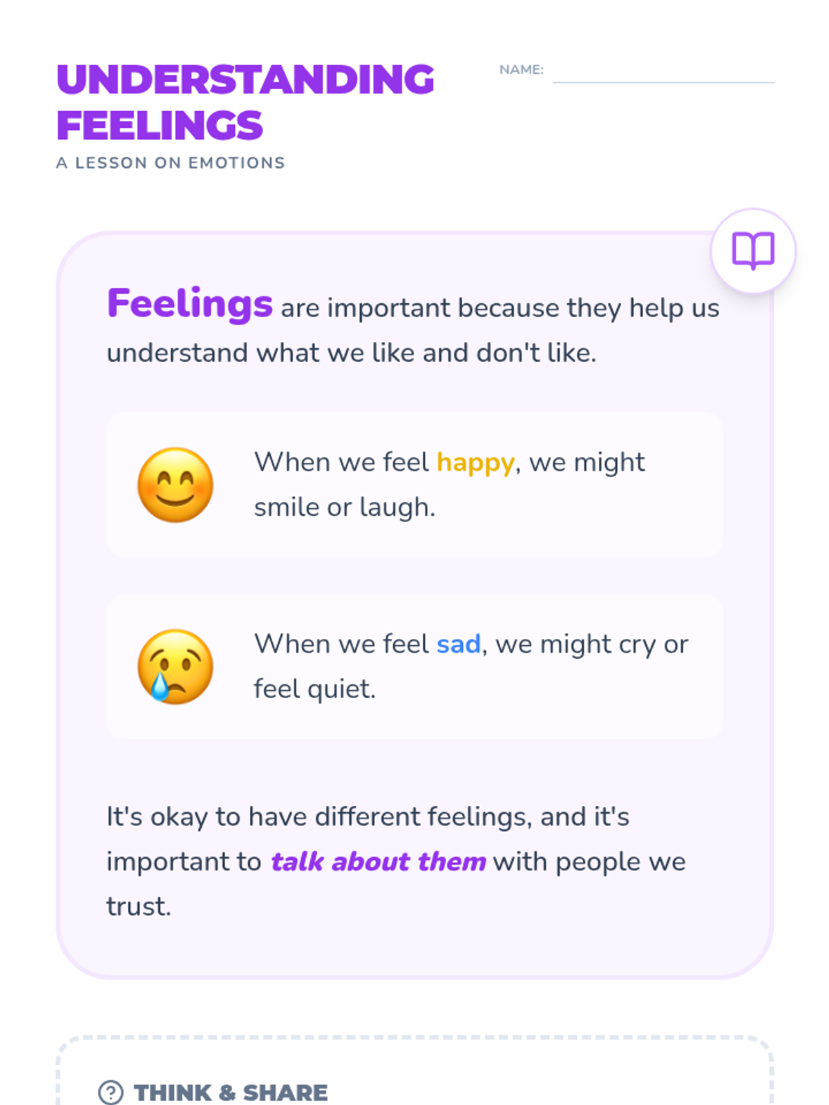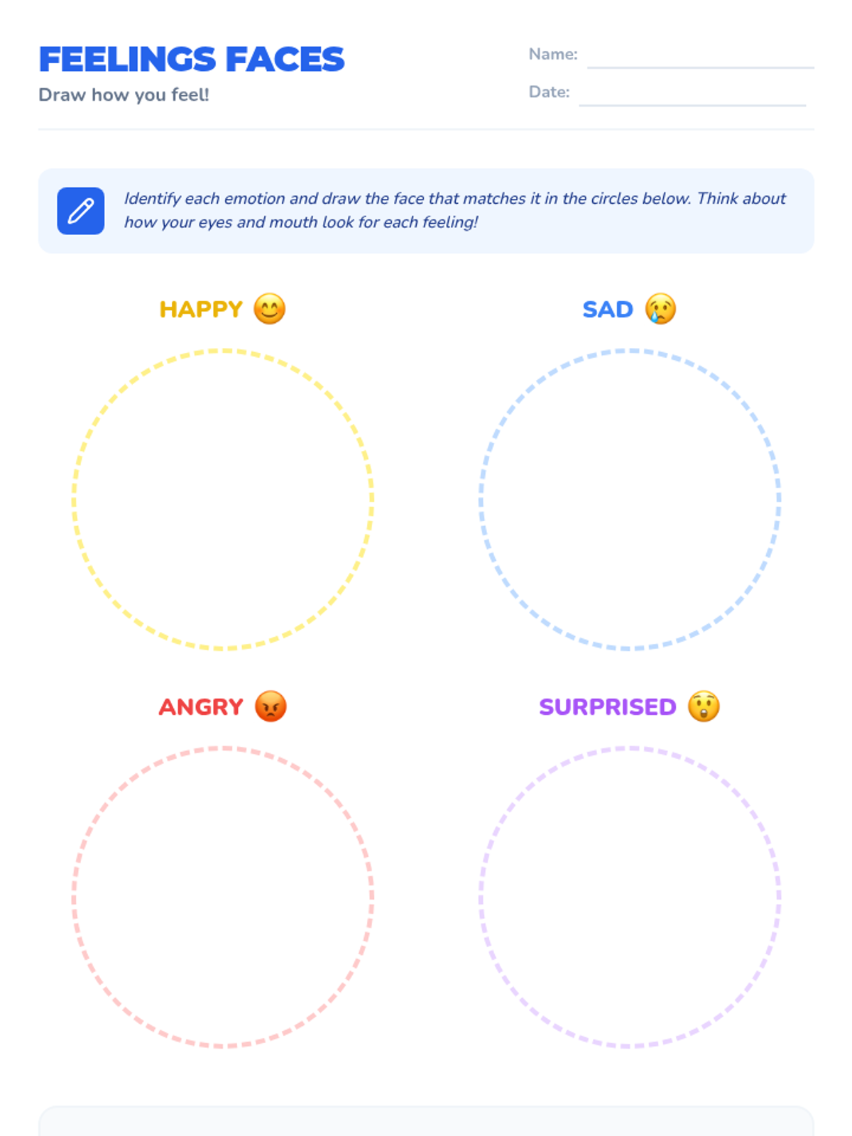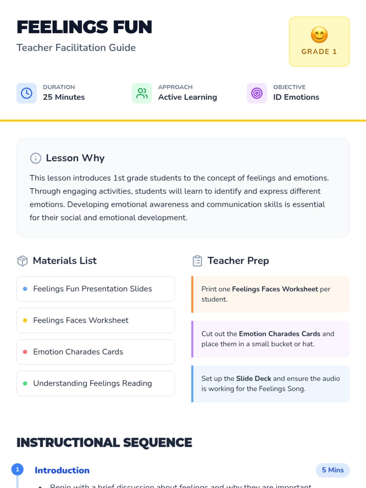 This introductory lesson helps 1st-grade students identify, understand, and express their emotions through songs, games, and creative drawing activities. Students will develop essential social-emotional skills by learning how to communicate their feelings effectively.