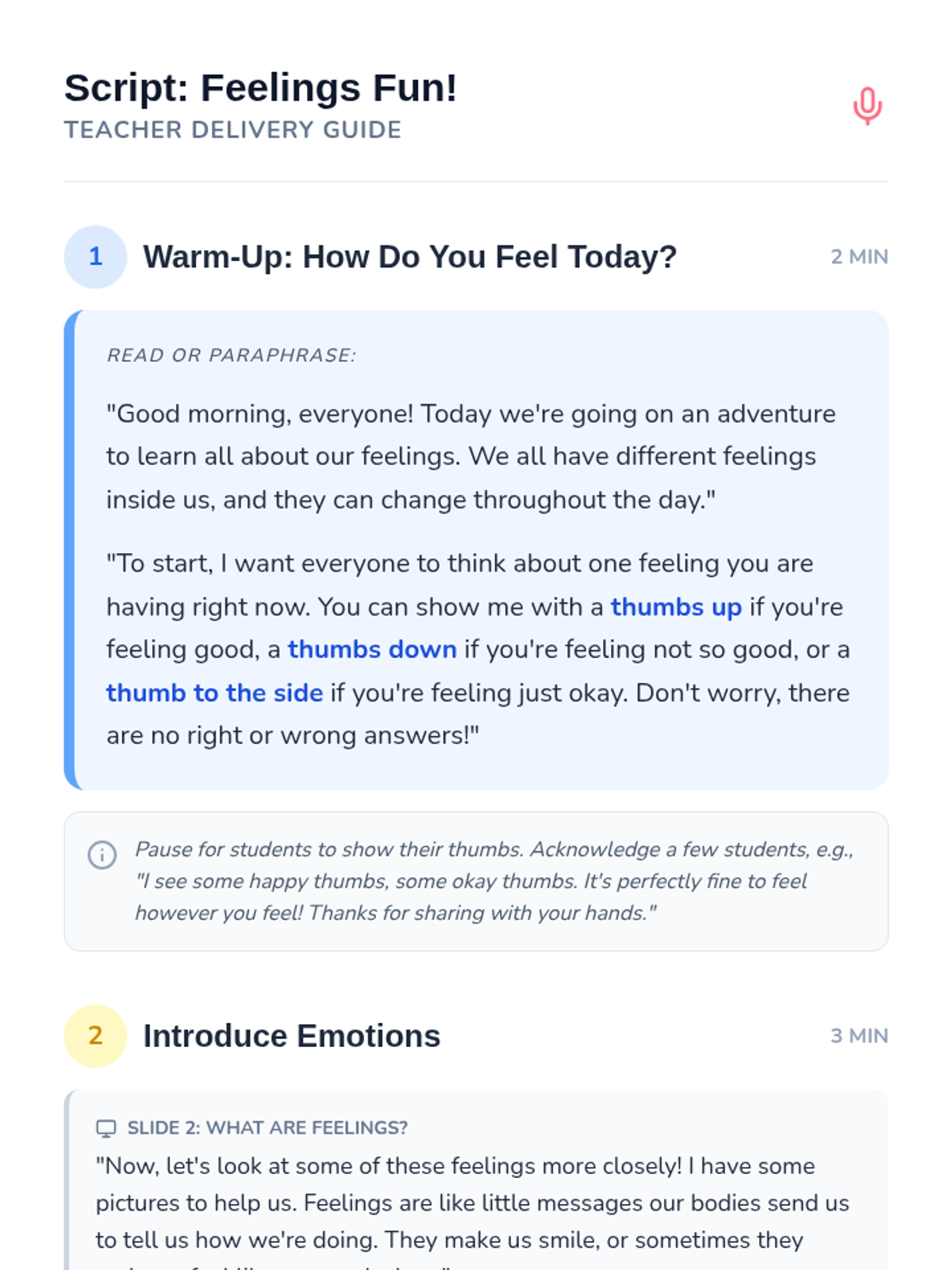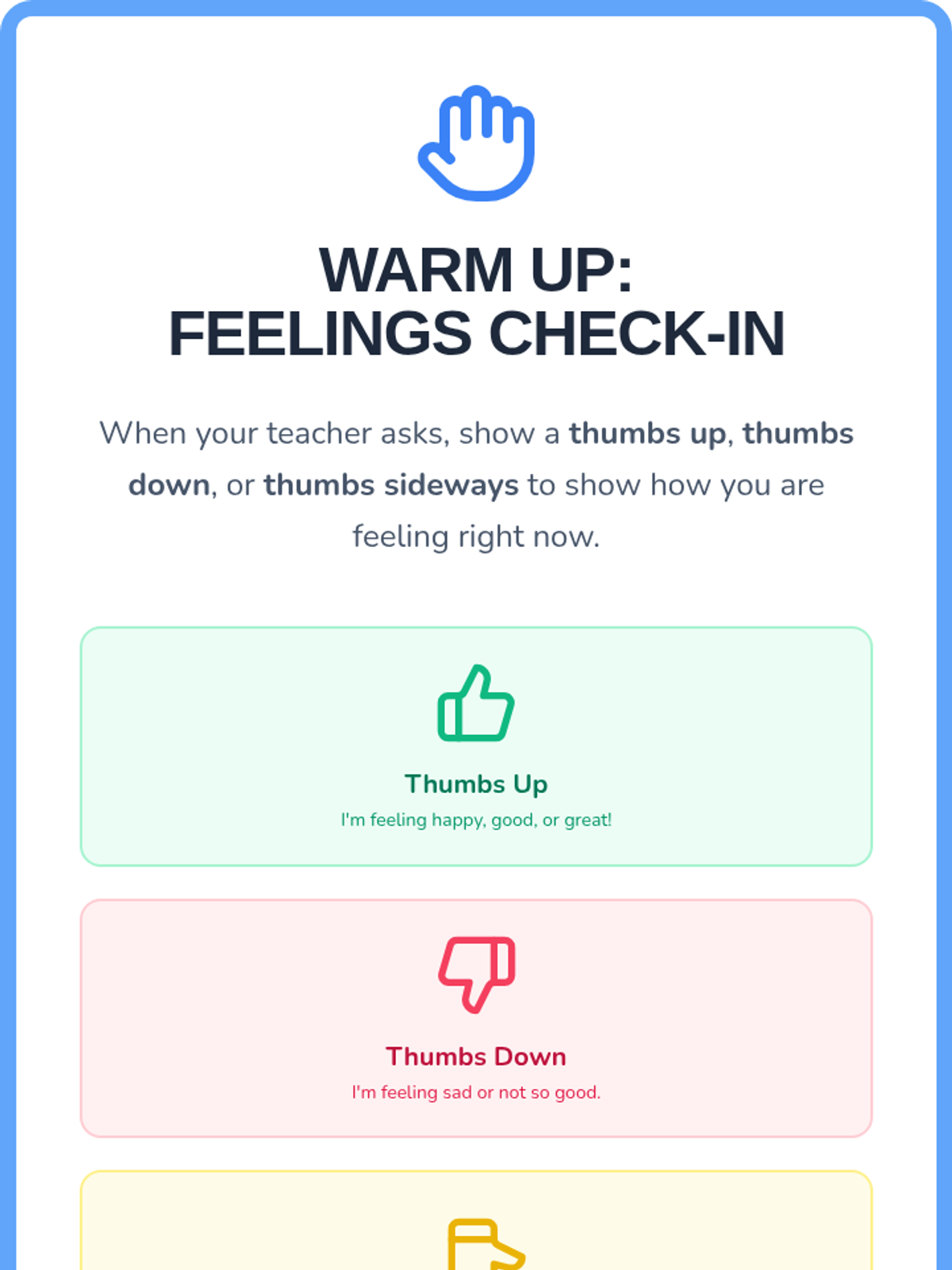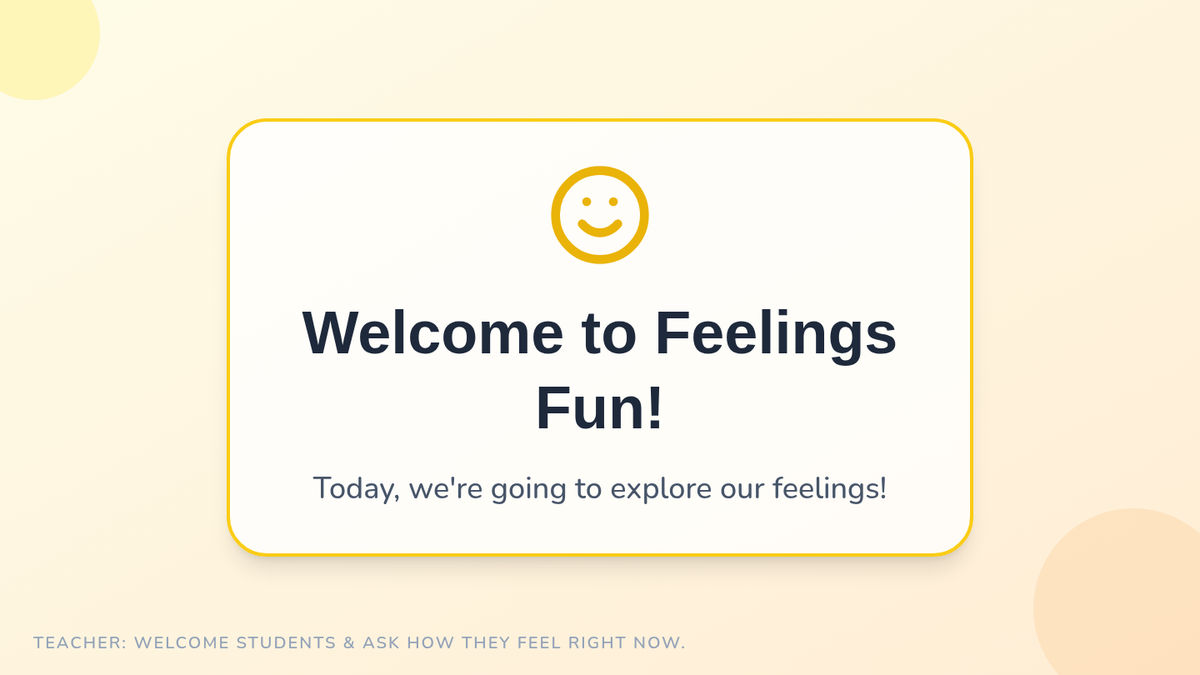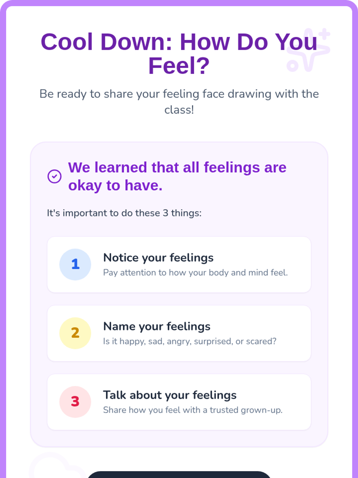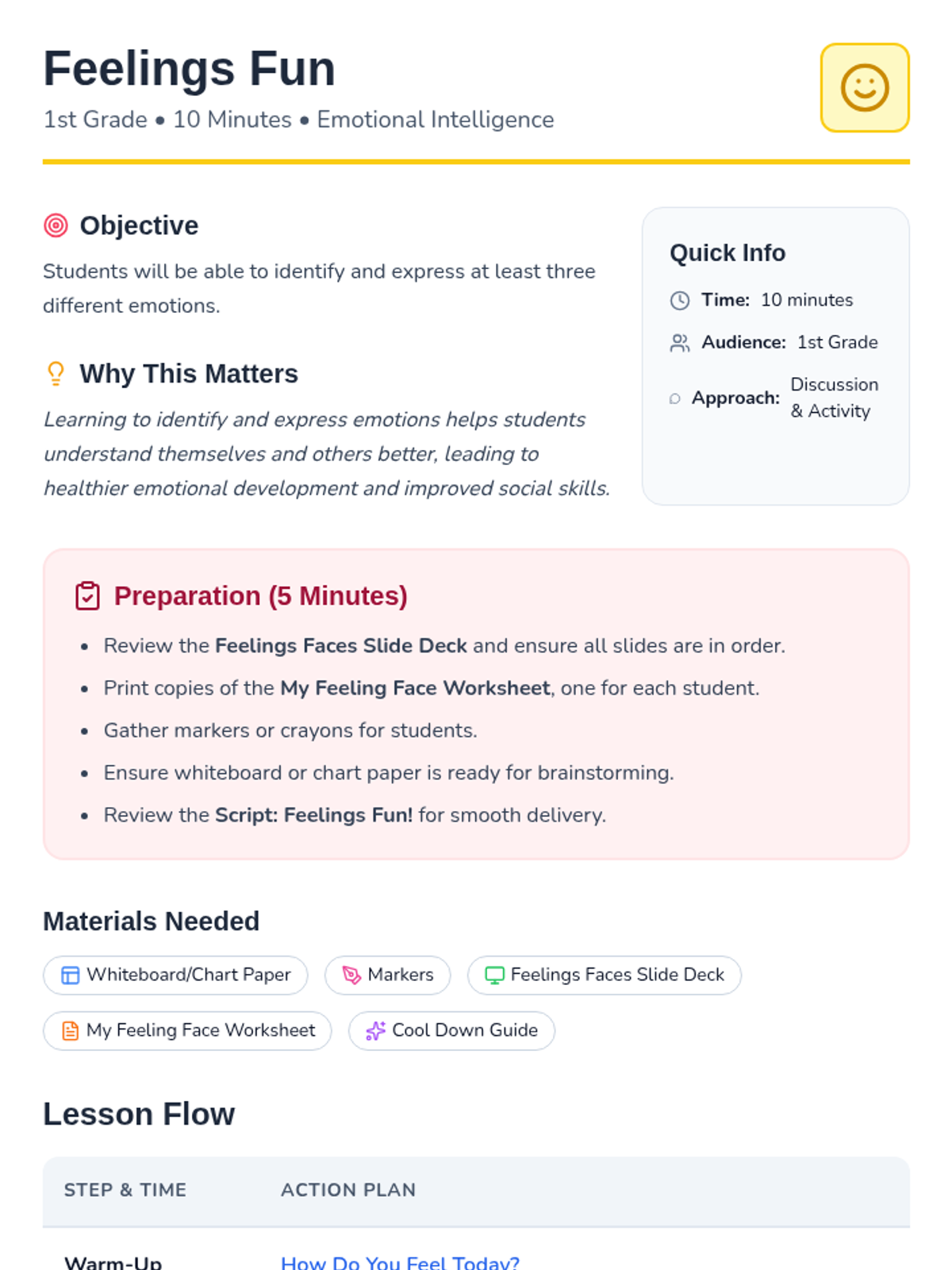 A 10-minute interactive lesson for 1st-grade students to identify and express their emotions through discussion and drawing. Students explore primary emotions like happiness, sadness, anger, surprise, and fear.